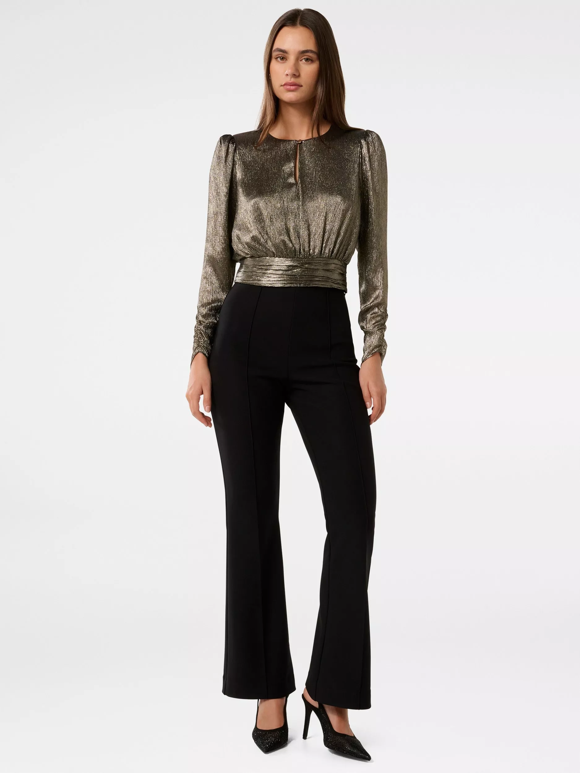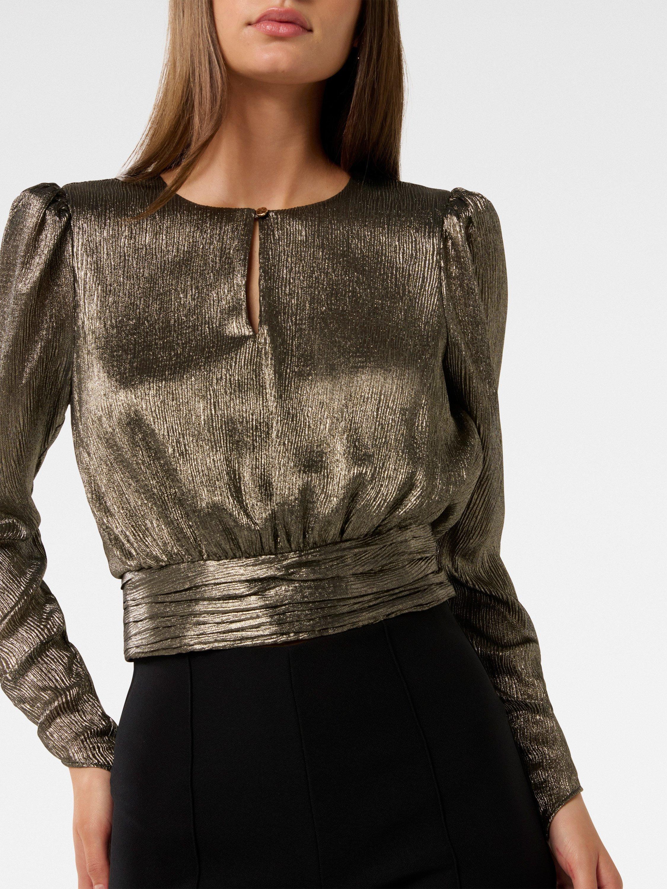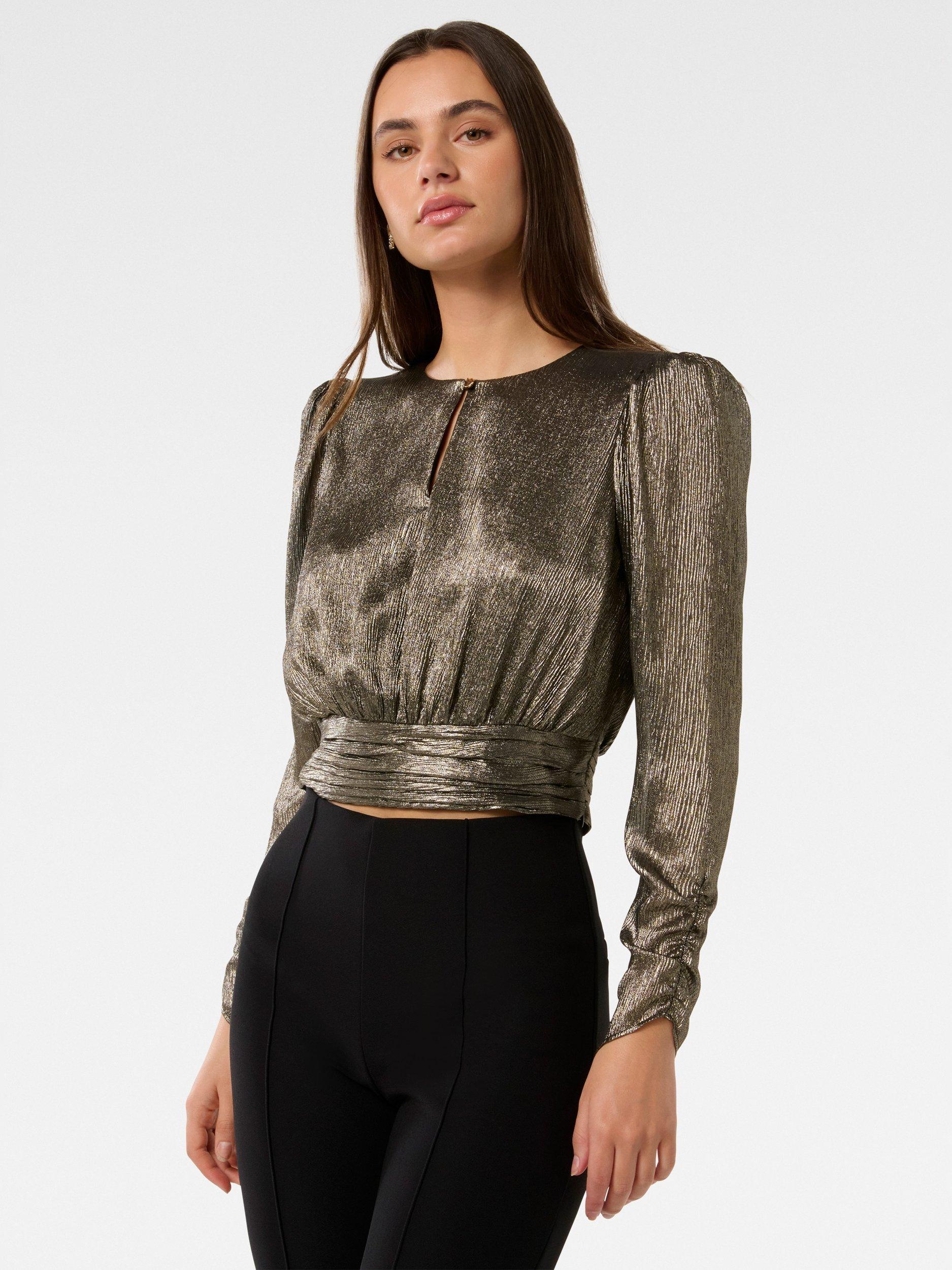 The perfect piece for parties, this blouse from Forever New is rendered in glistening metallics with a round neck, long sleeves and a ruched waist.