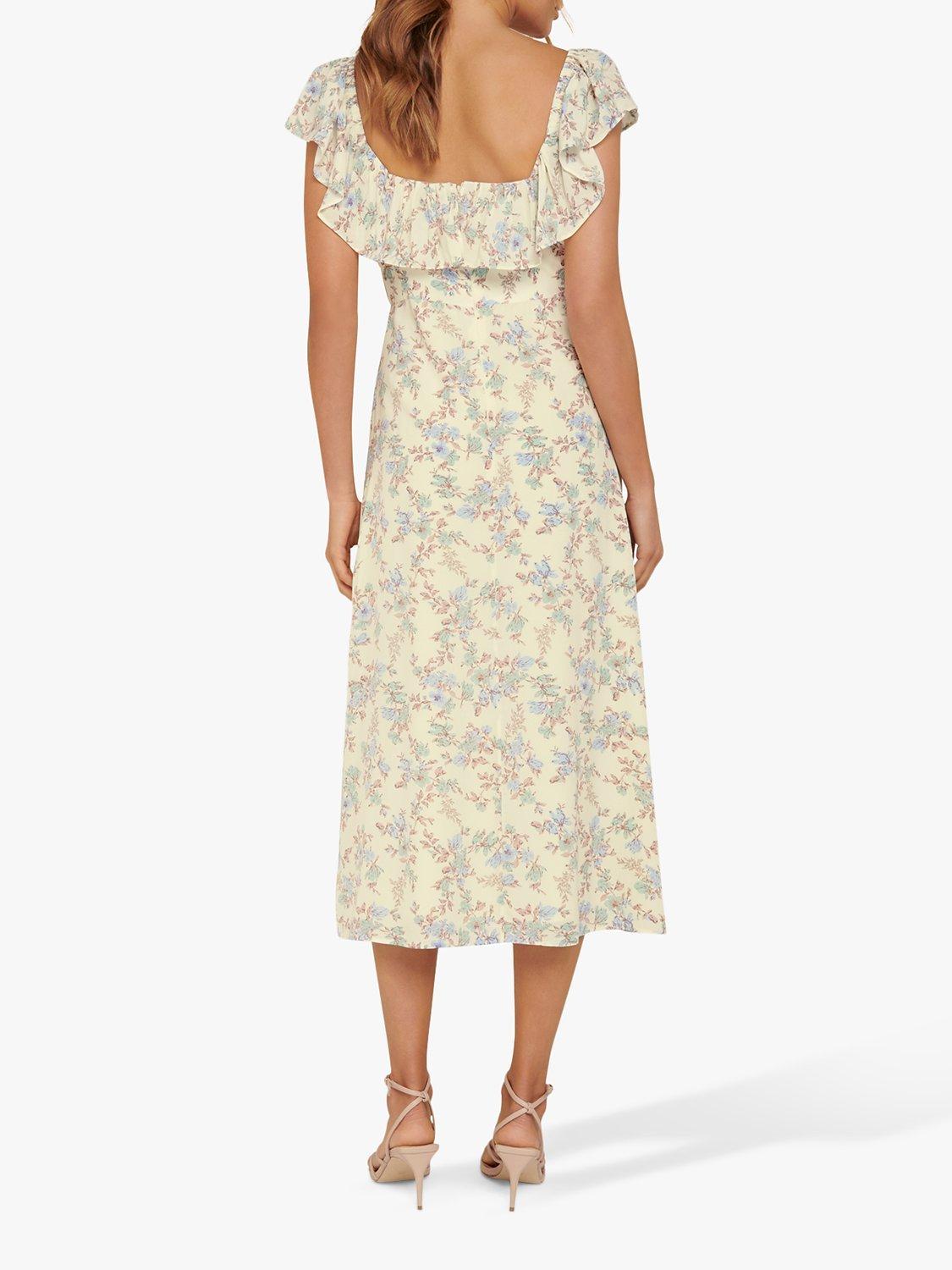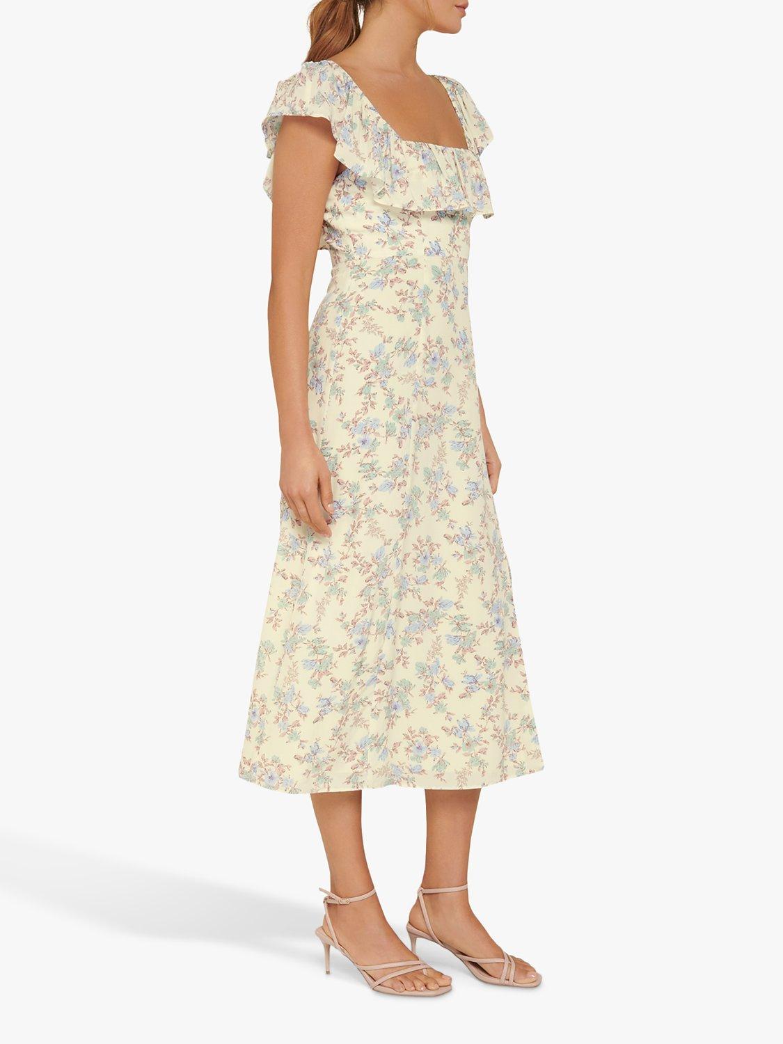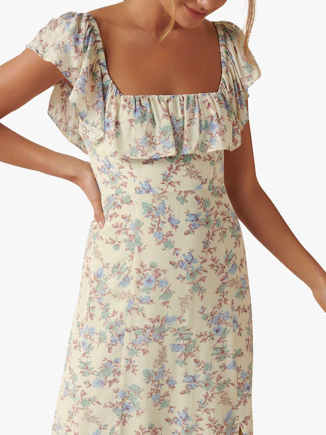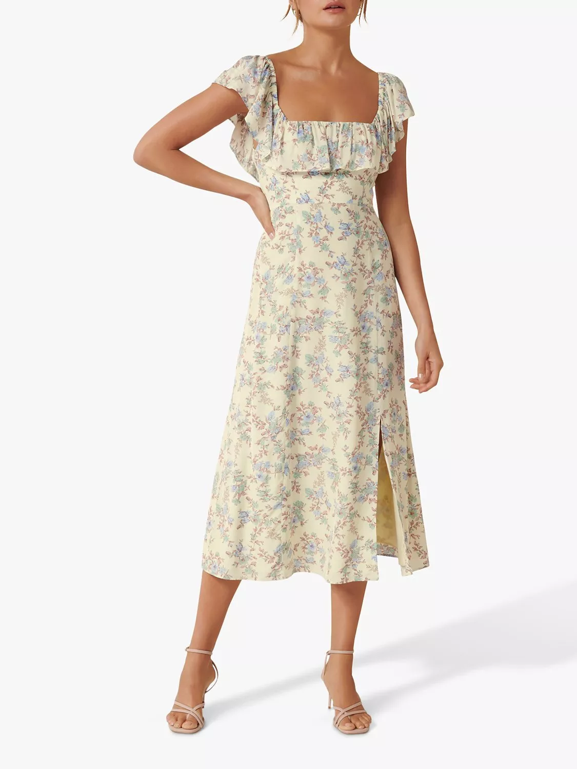 Ruby offers a beautifully feminine silhouette with romantic touches. It softly flares from the waist falling to an elegant midi length while the square neckline is framed with ruffles for a light floaty feel. Wear with wedge sandals and style your hair in a messy up-do.