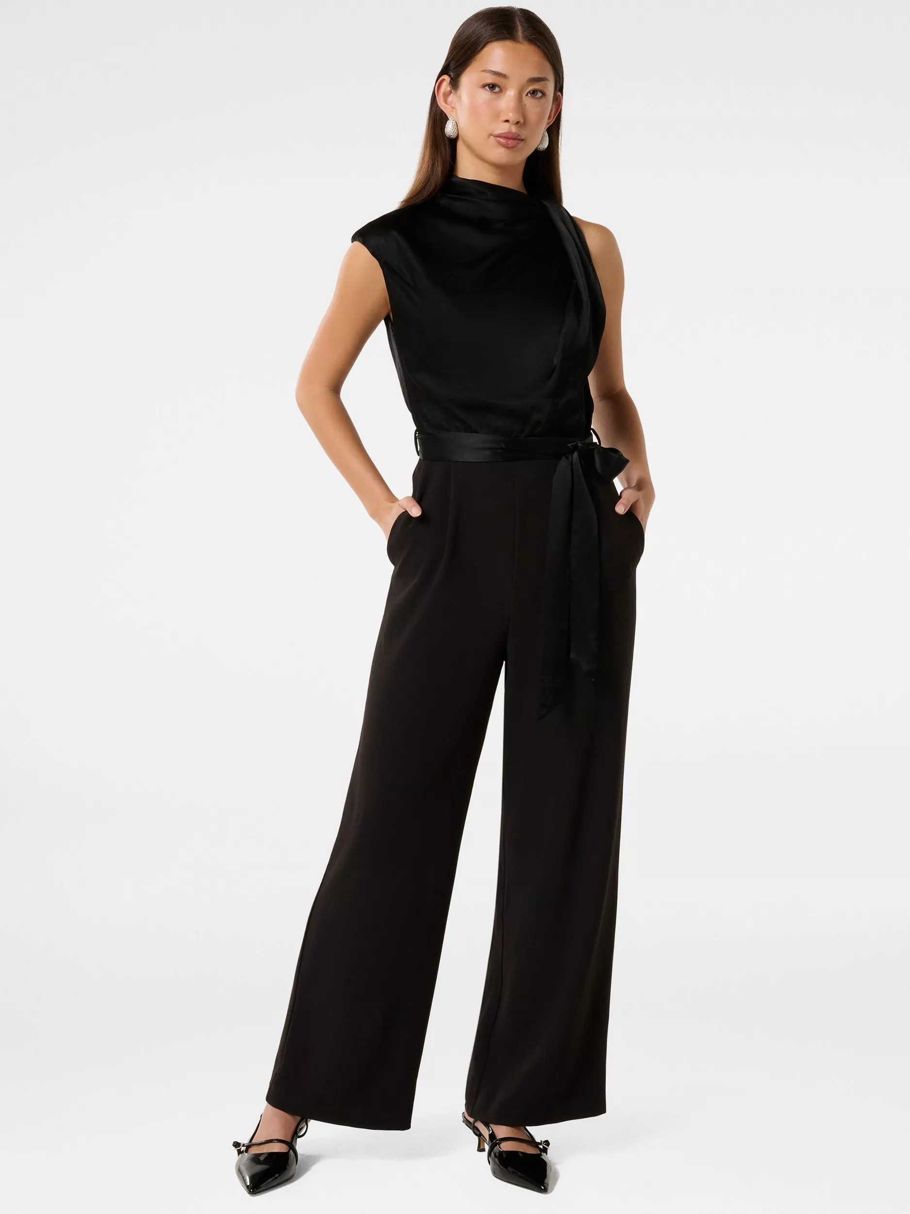 Cut with a draped cowl neck and asymmetric sleeves, this jumpsuit by Forever New is made from smooth satin and falls to a loose leg.