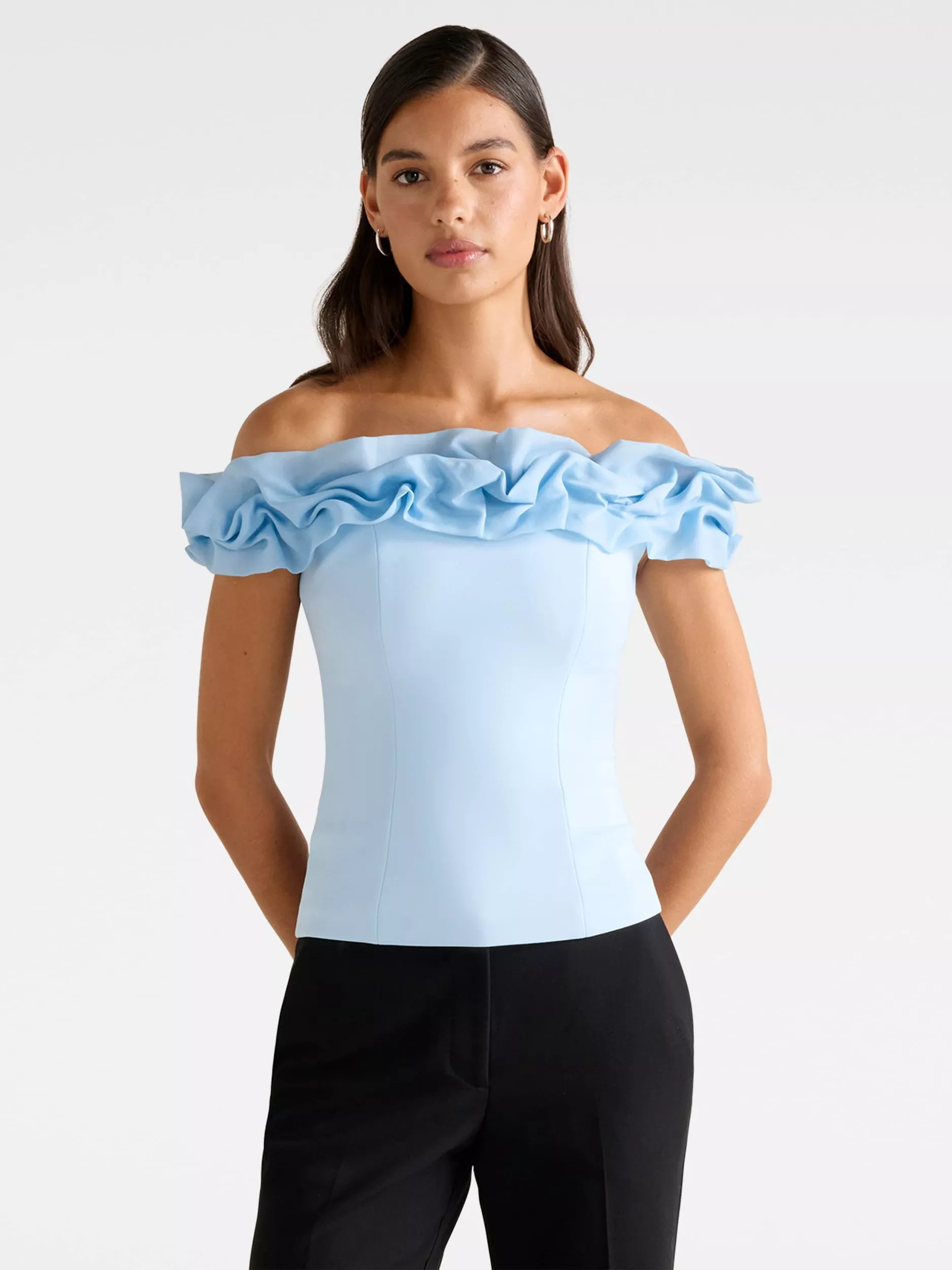 Step into celebration with Forever New’s bardot top. Its elegant 3D ruffled neckline creates flair, while its crepe fabric is fitted through the body.