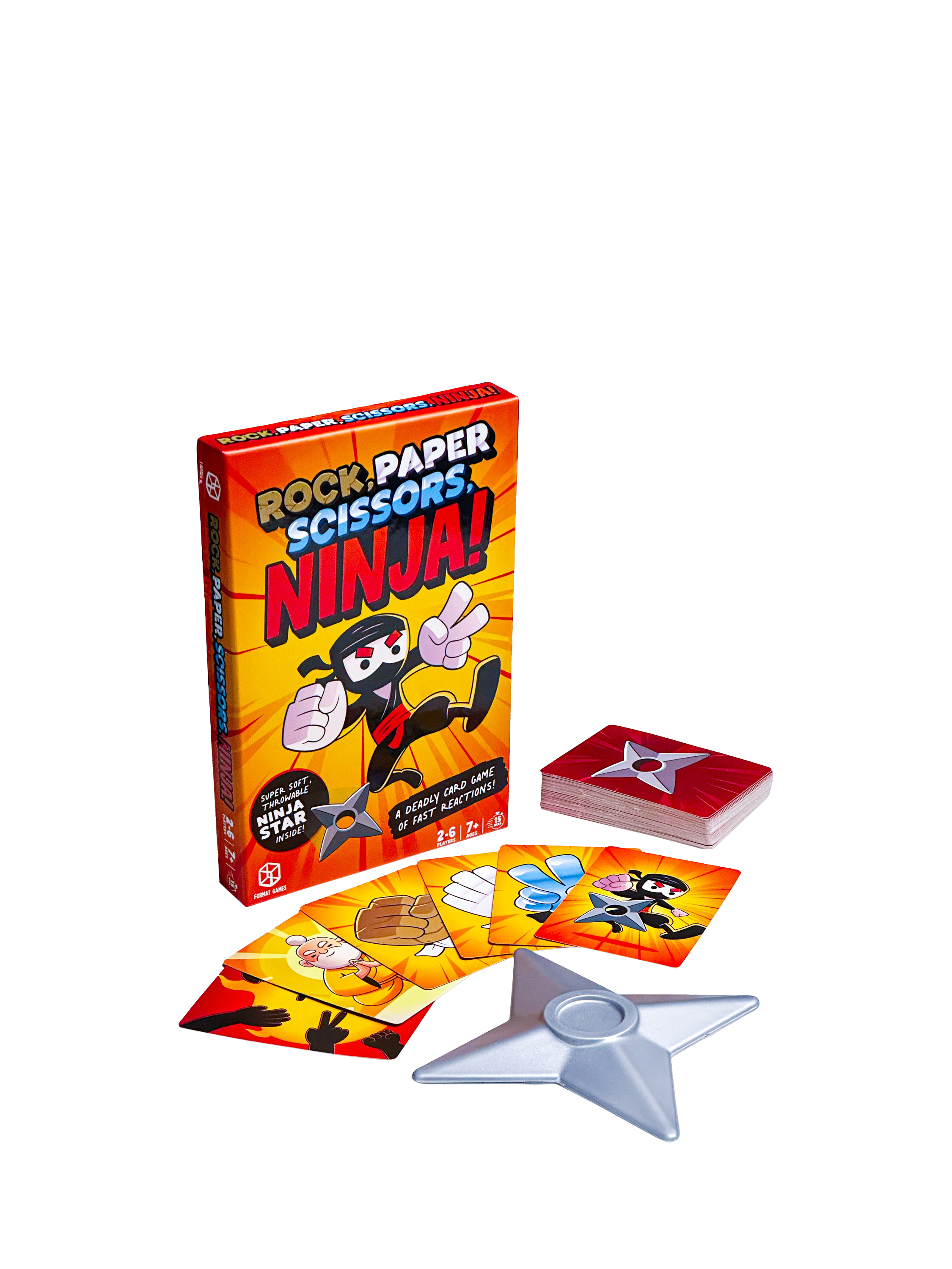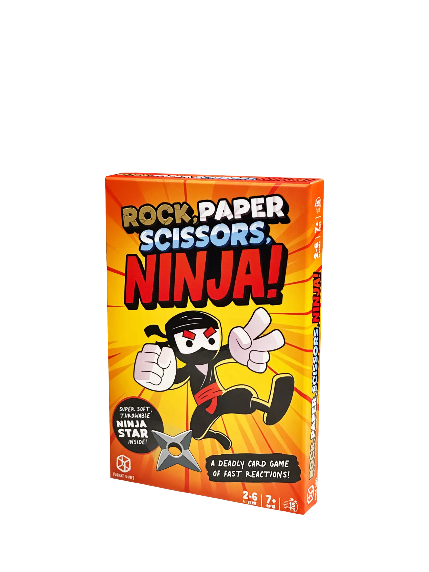 A fast paced reaction game where players must think fast or you might get hit with the Ninja Star. Players place a card in the middle while taking turns to say "Rock", "Paper", "Scissors", "Ninja". If the card they play matches the thing they say, all players must race to either beat the while belt, or lose to the black belt, to win the card. Family friendly, 2 players +, ages 7 plus,15 minutes to play.