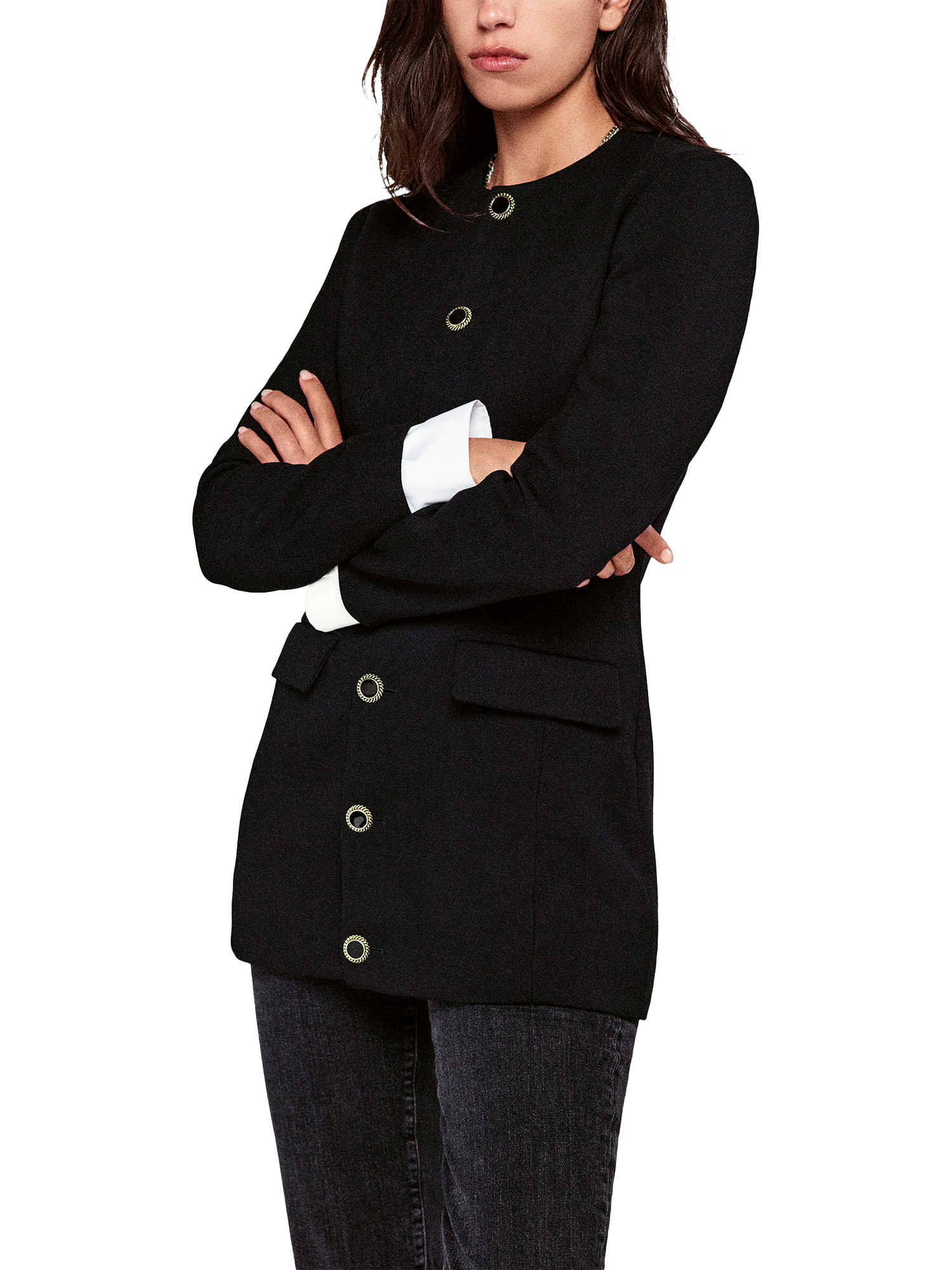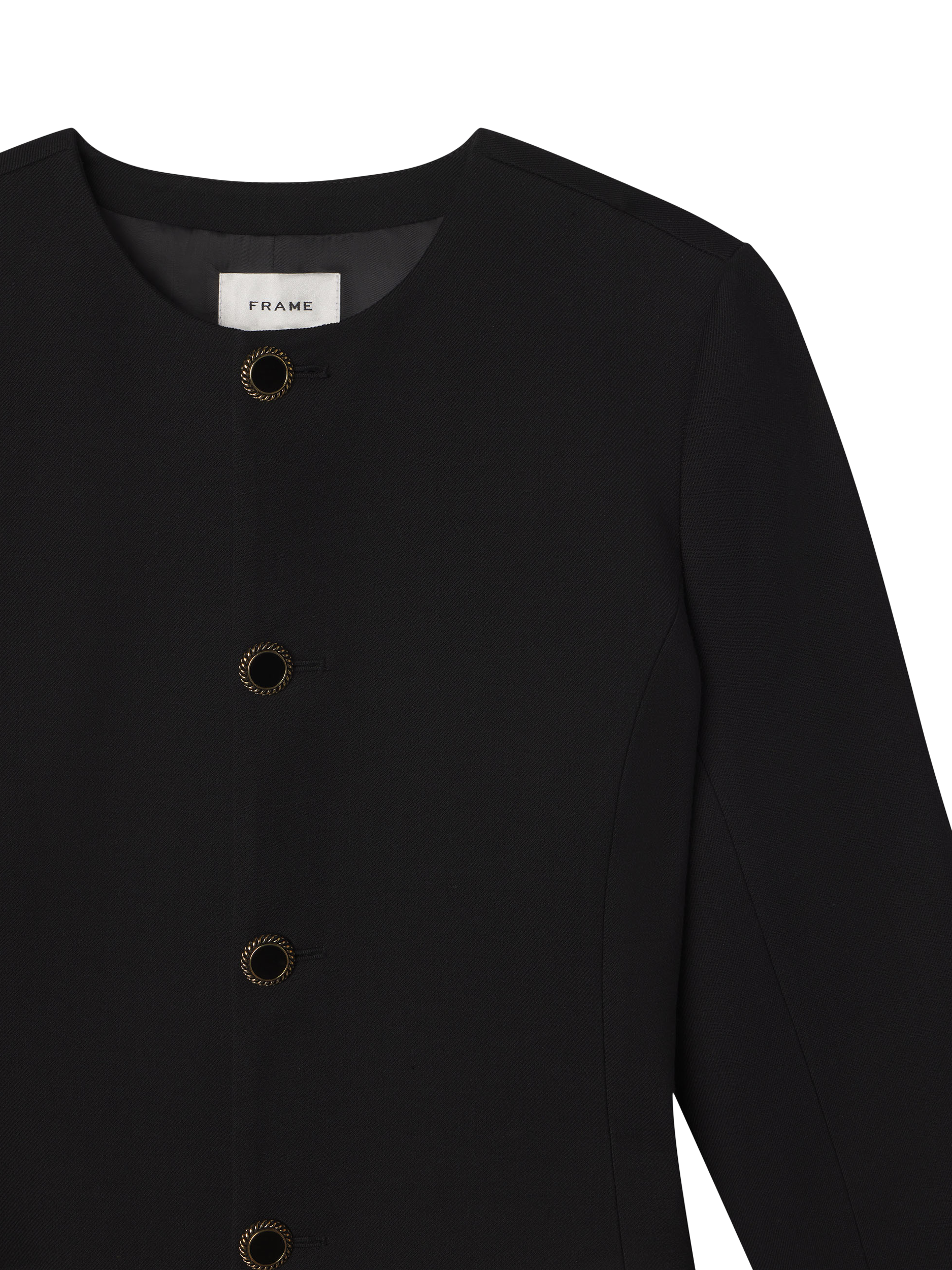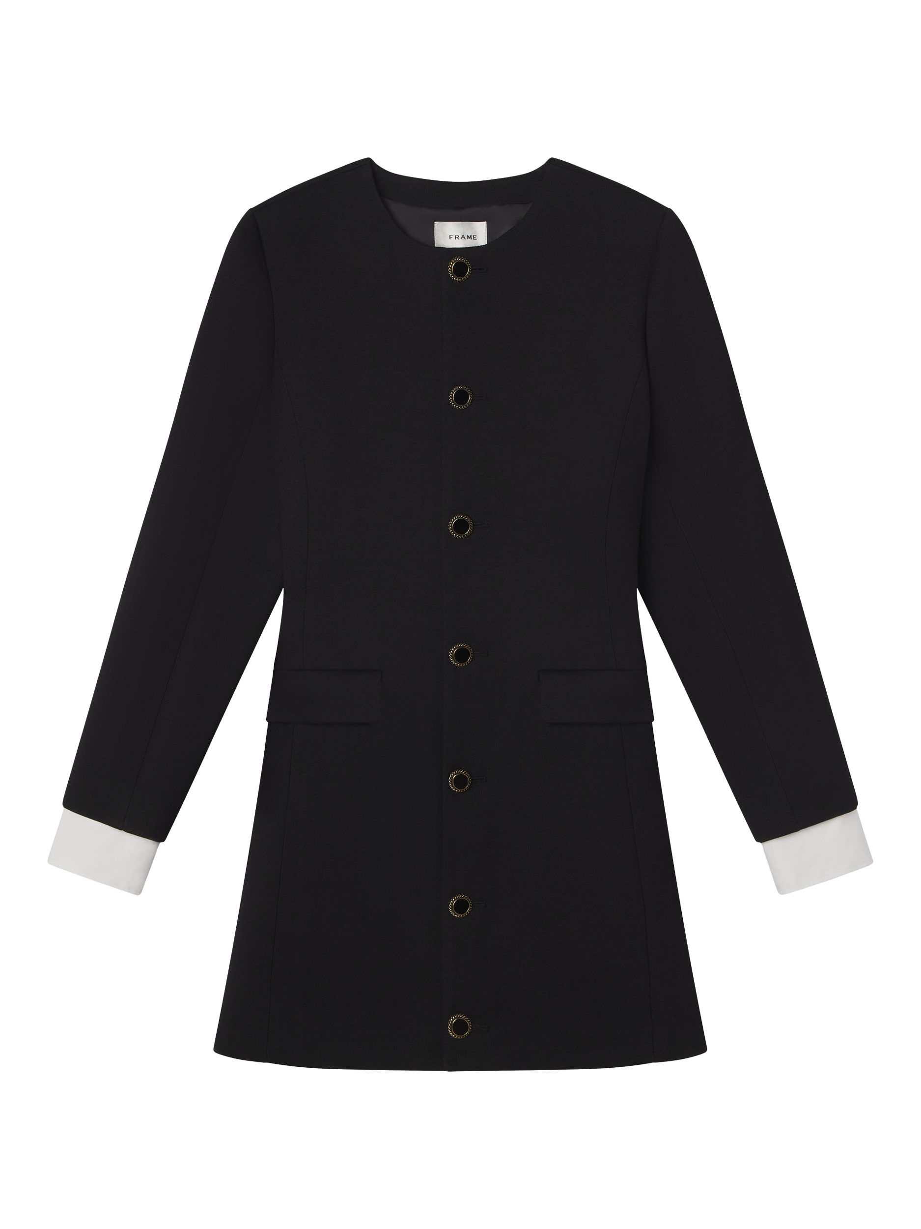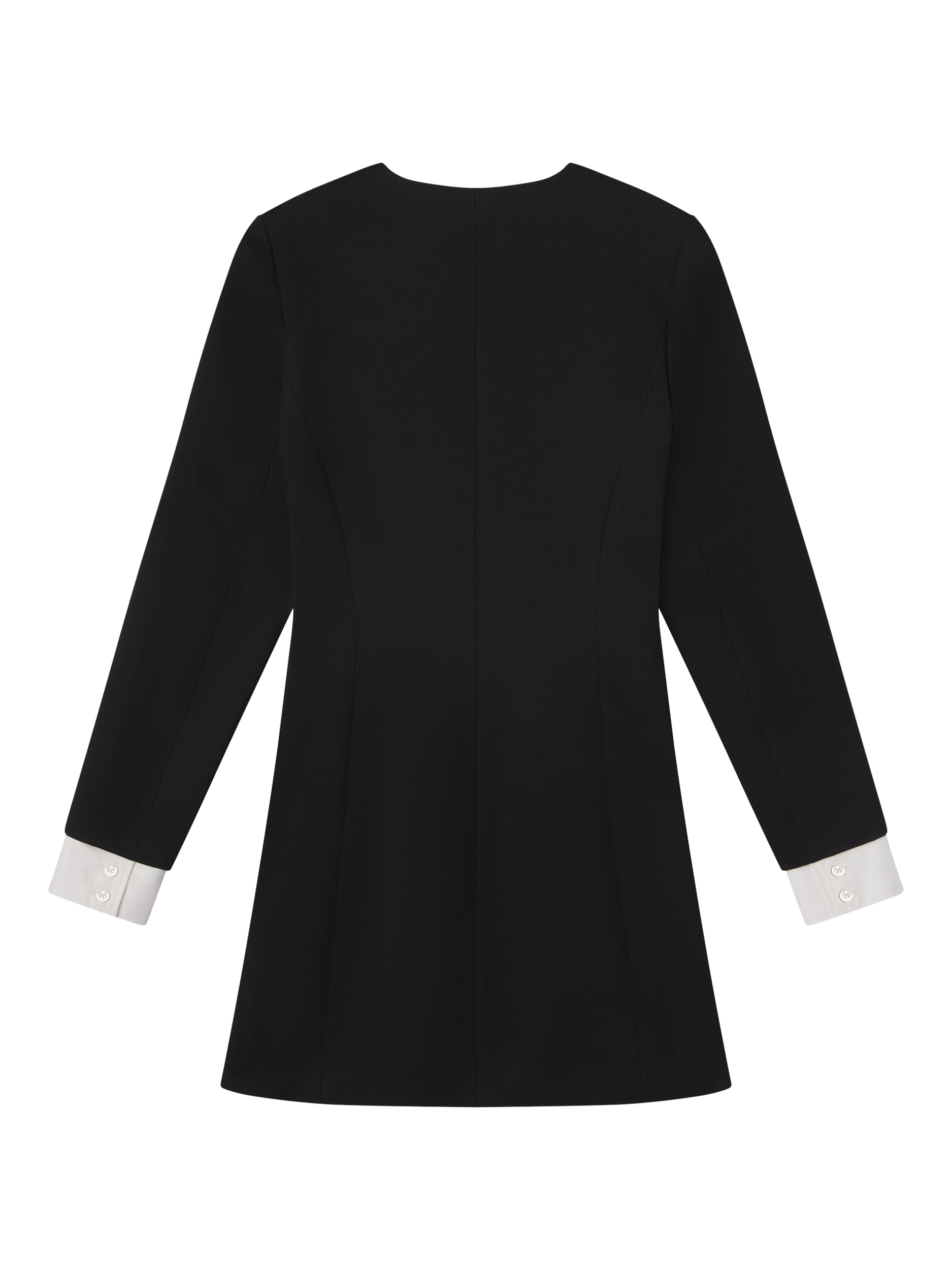 This sculpted silhouette meets every sophisticated standard. A contemporary take on suiting, the dress slopes inward for a nipped-in waist and hourglass effect. Finished by softly flared sleeves, removable cuffs, and two-toned shank buttons to ensure a beautiful drape.