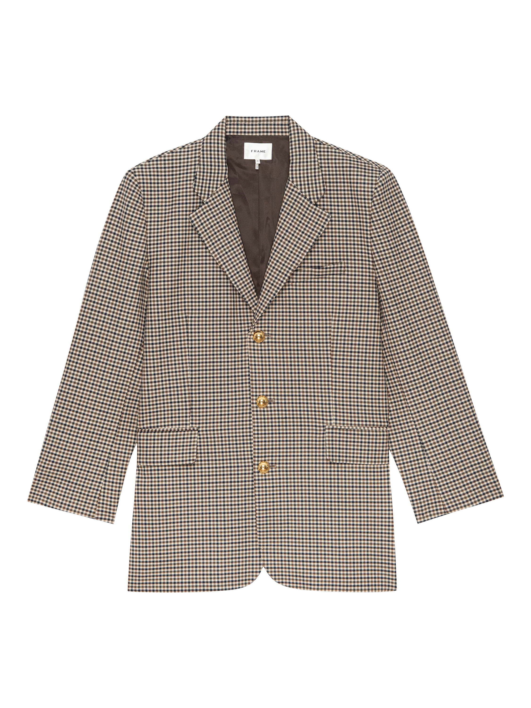 A timeless, oversized blazer in navy houndstooth with gold dome buttons, front pockets, and three-button cuffs. Designed for a statement fit—size down for a more traditional silhouette.