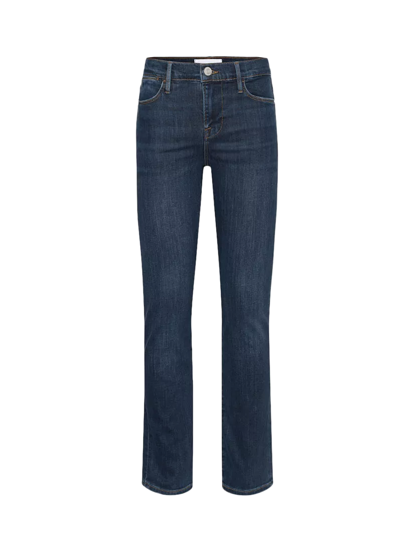 Straight jeans go well with a striped shirt, blazer and tan accessories for that old-money look.
