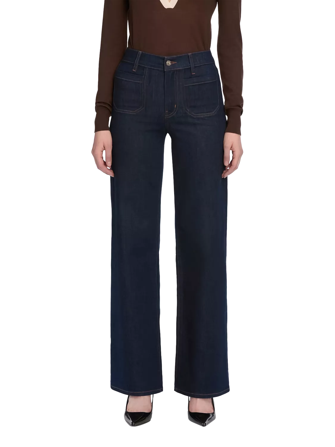 The palazzo silhouette is designed with a comfortable high-rise waist, fitted hip, and subtle wide-leg flare. Crafted from a stretch cotton blend for the softest wear.
