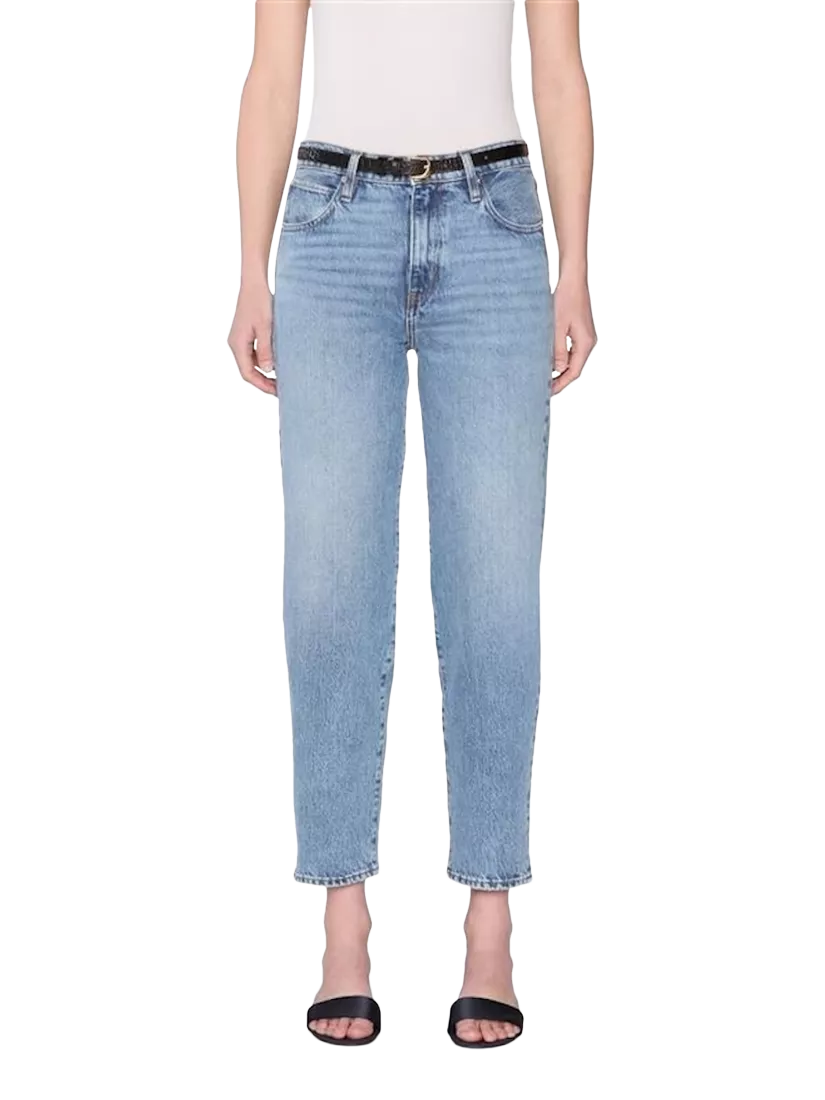 Crafted from 100% cotton, this rigid pair offers a softer take on the barrel-leg craze. It has a mid-rise waist and delicately curved outseam that hits at the ankle, perfect for a polished kitten heel.