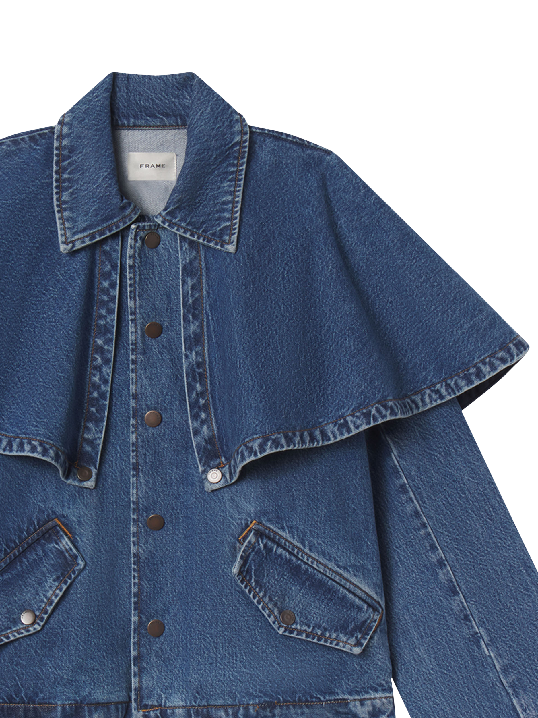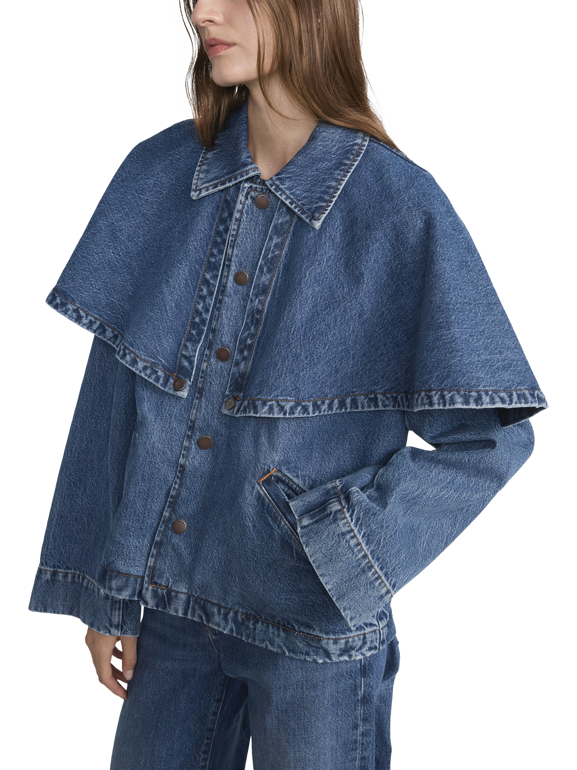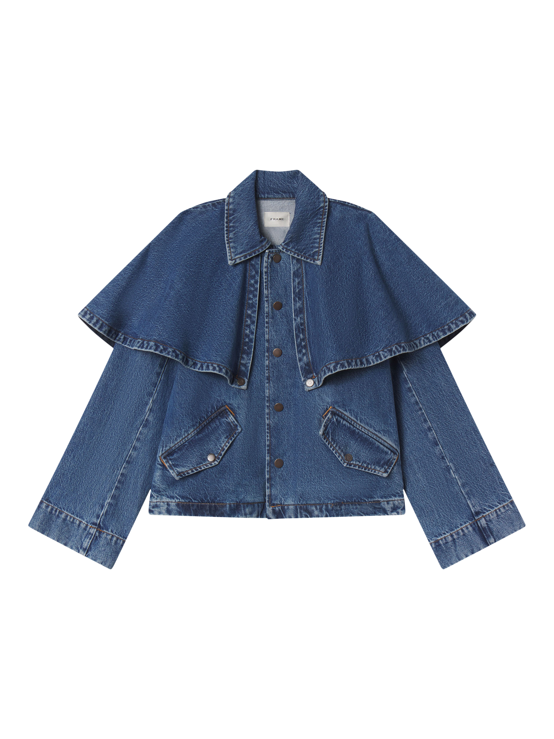 Elevate your everyday look with this statement denim jacket. Featuring a unique cape-style overlay and a relaxed, boxy fit, it redefines classic denim with bold, modern flair. Great for layering, it adds effortless edge to any outfit, from casual tees to sleek dresses.