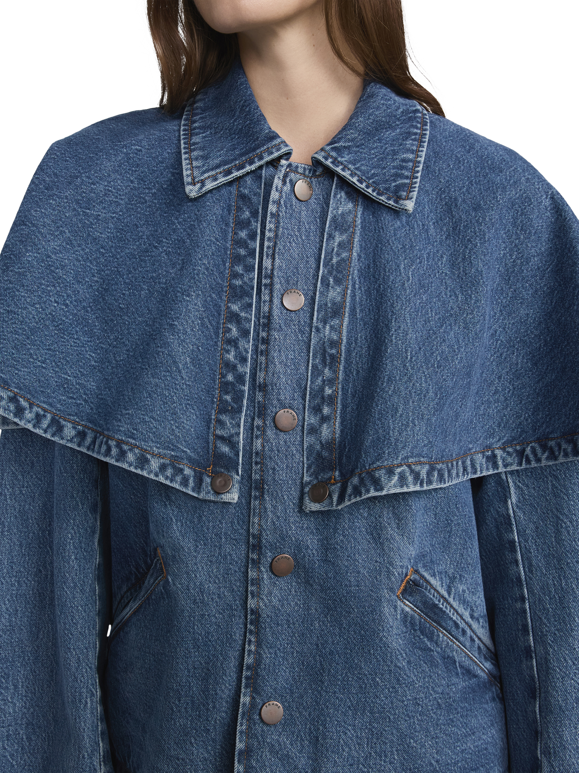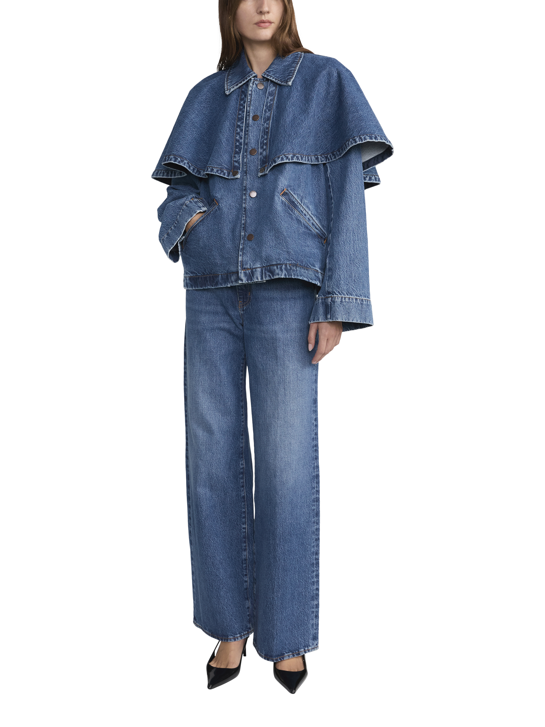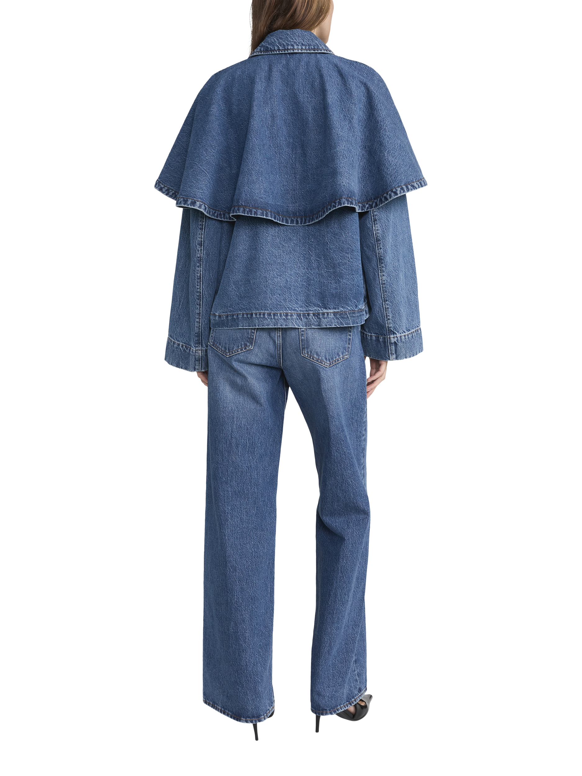 Elevate your everyday look with this statement denim jacket. Featuring a unique cape-style overlay and a relaxed, boxy fit, it redefines classic denim with bold, modern flair. Great for layering, it adds effortless edge to any outfit, from casual tees to sleek dresses.