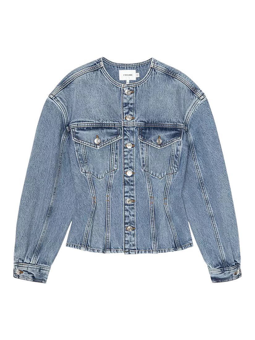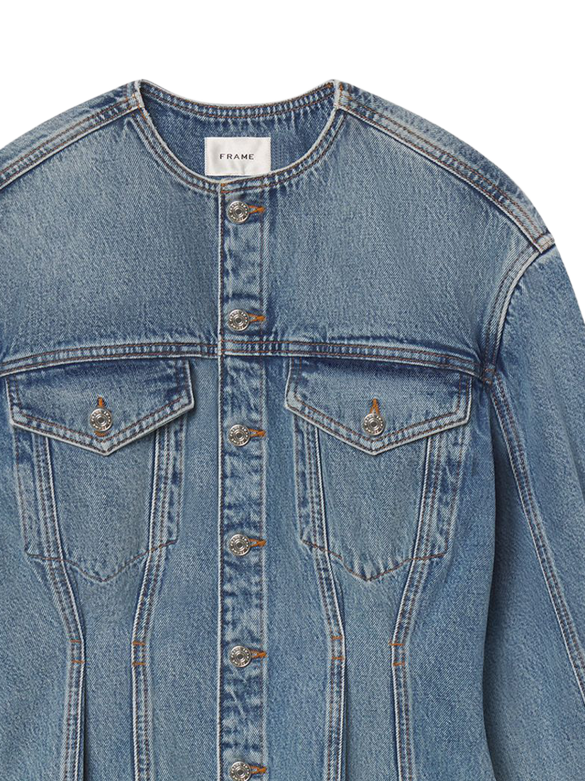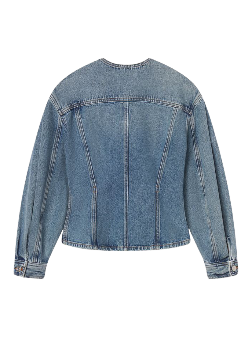 A fresh take on the timeless denim jacket, this piece features a sleek collarless neckline and a flattering, structured fit. Crafted from premium washed denim, it blends everyday ease with refined edge — perfect for dressing up or down, season after season