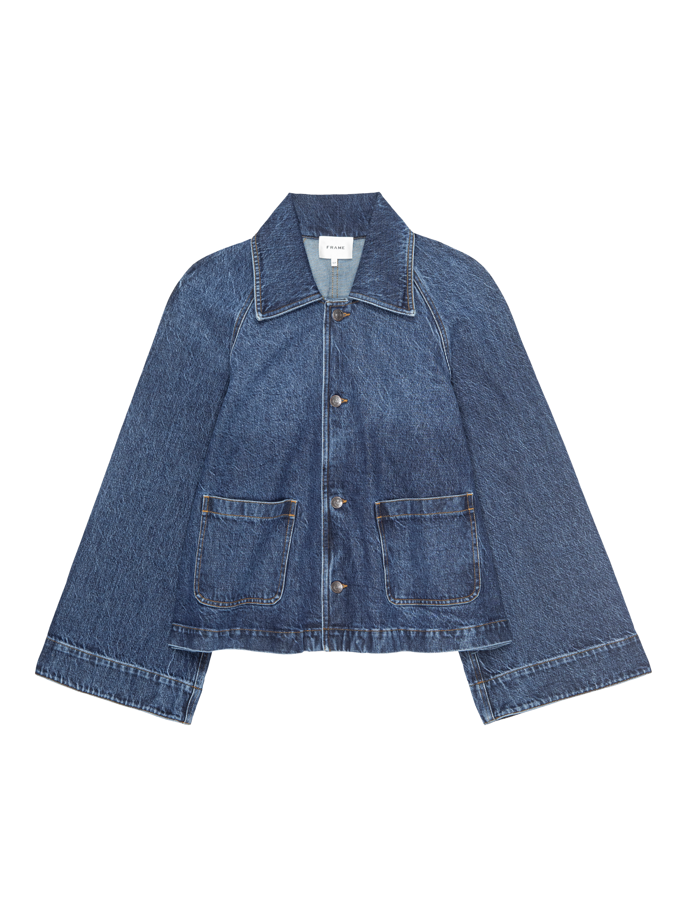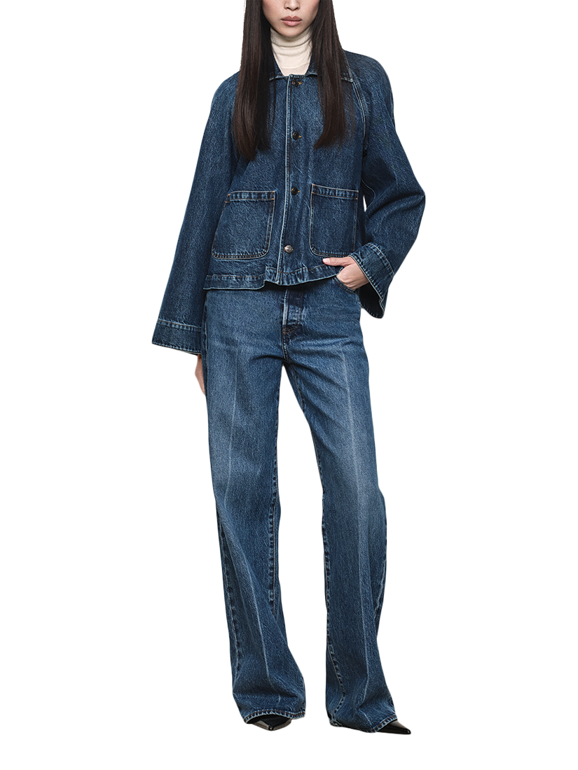 A modern silhouette with a nod to vintage ease. The Swing Jacket is cut in soft denim with a crisp collar, oversized sleeves, and a gently flared shape that moves with you. Finished with patch pockets and a rich wash — designed to layer effortlessly, just like your favourite jeans.