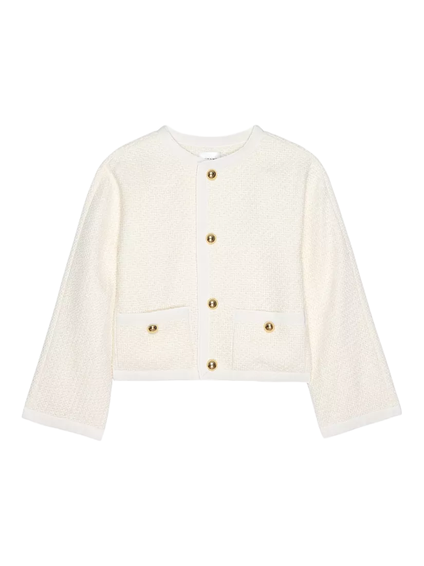 Lighten up your layers with The Trim Jacket - the perfect piece for breezy summer days. Woven in soft, sun-washed tones, this tweed jacket features a clean round neckline and elegant gold-toned buttons on the waist pockets. Effortlessly polished, it's a go-to for everything from morning market strolls to afternoon garden parties.