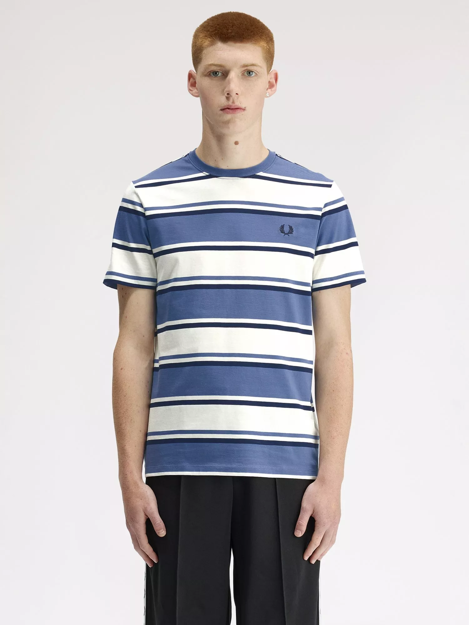 A non-restrictive cotton T-shirt, detailed with bold stripes, a crew neck and classic short sleeves.
