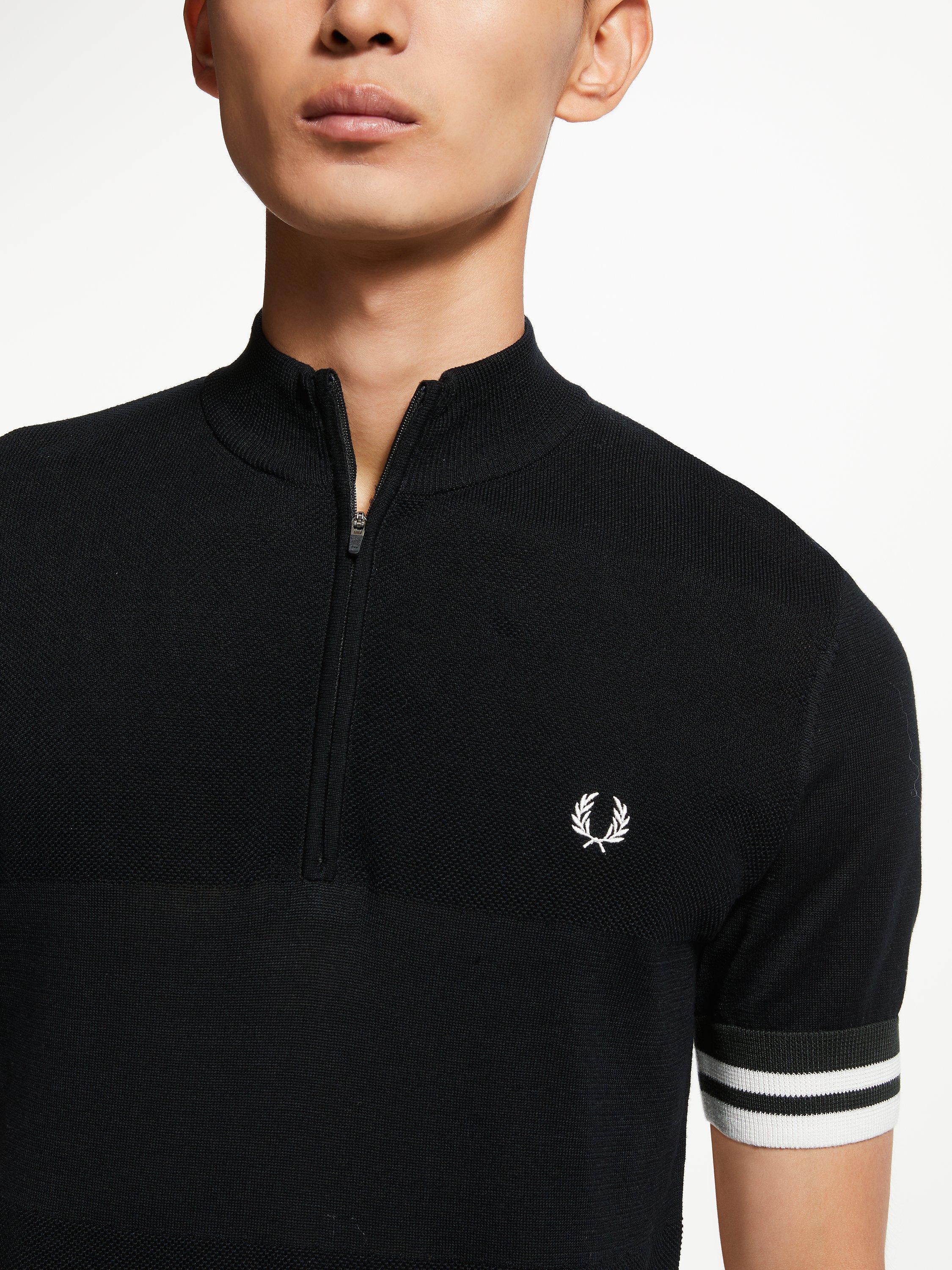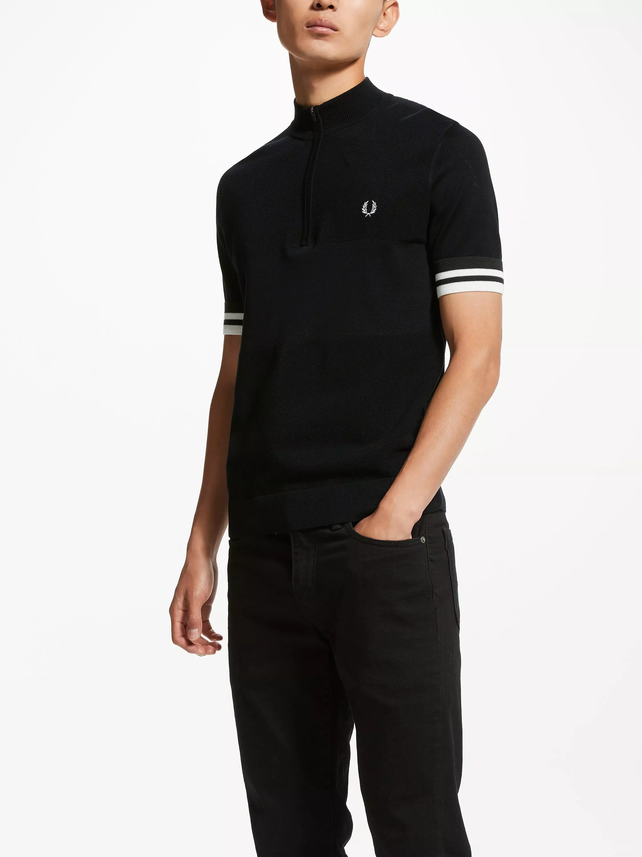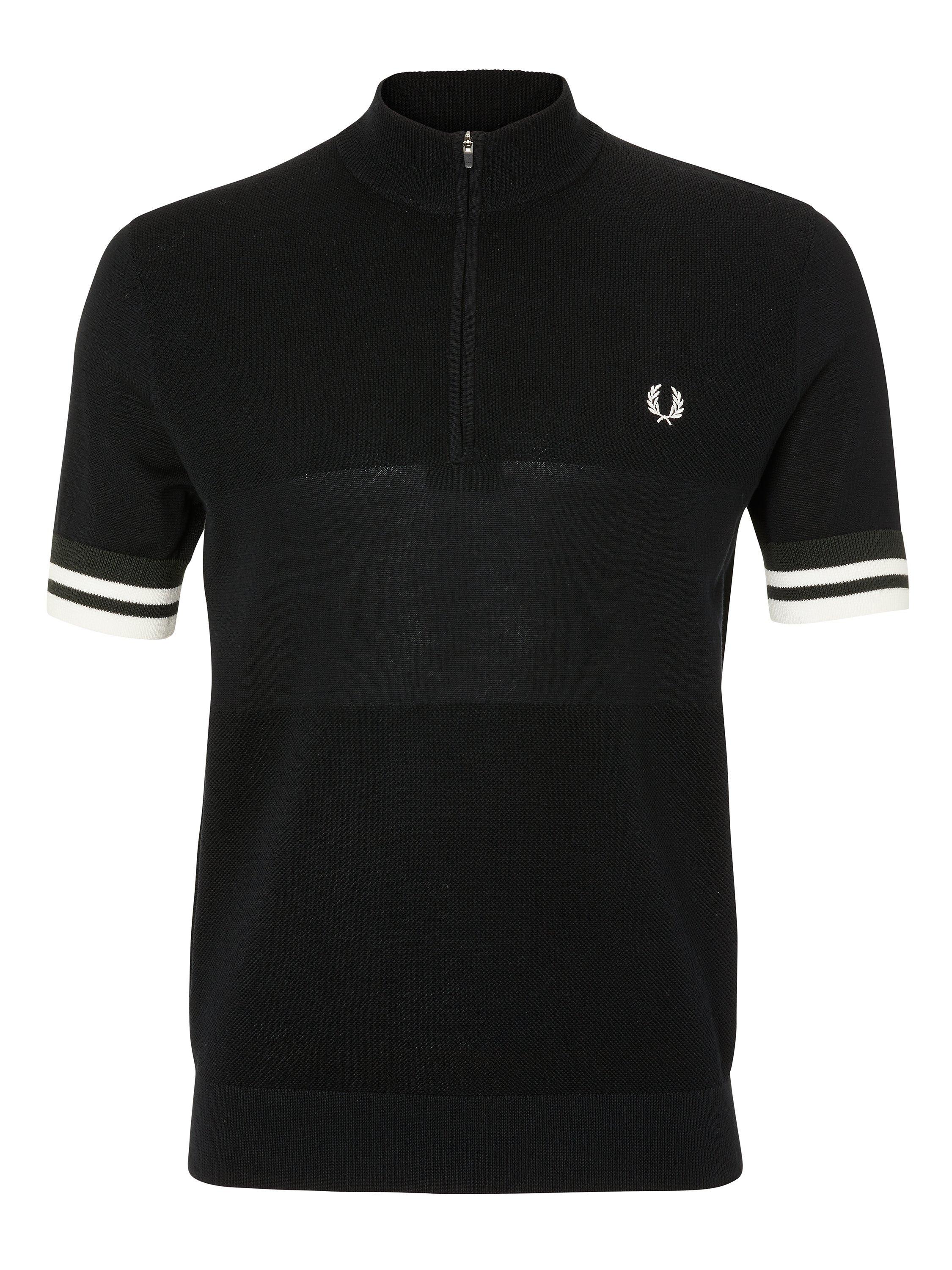 Designed with a zip neck and cut to a slim fit, this knitted polo shirt from Fred Perry is accented with tipping on the sleeves, a button placket and signature brand logo embroidery on the chest. Pair it with dark or light jeans with trainers for effortless casual style.