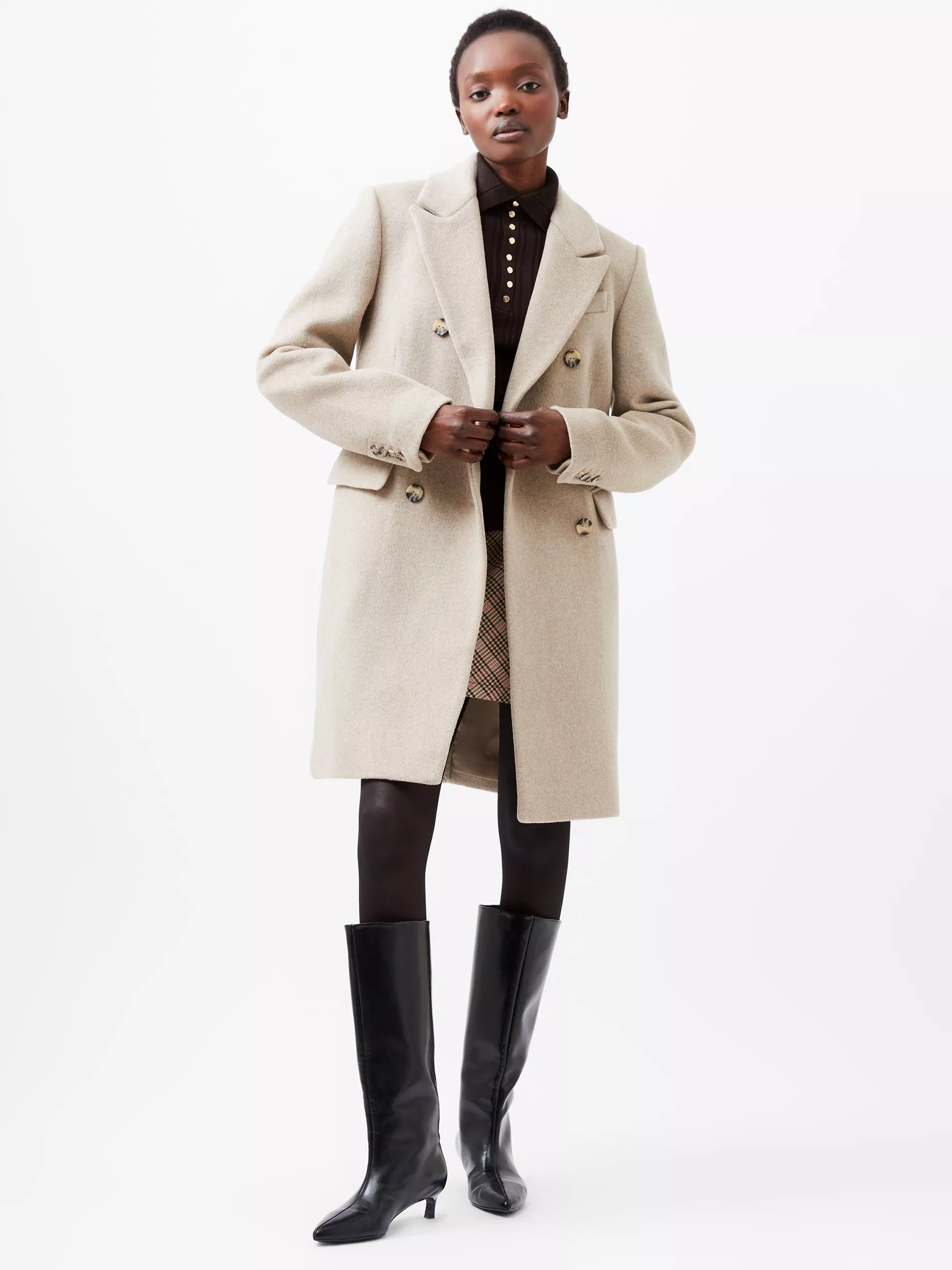 French Connection's Adele Felt Coat masters cosy chic, making it a coat to grab for now and seasons to come. This soft felt coat taps into the quiet luxury trend with its muted colourway complimented by tailored detailing, from a split lapel collar and double breasted fastening, to its breast and flap pockets. Marble effect buttons add a further touch of class, making this an outerwear style fit for workdays, weekends and occasions.