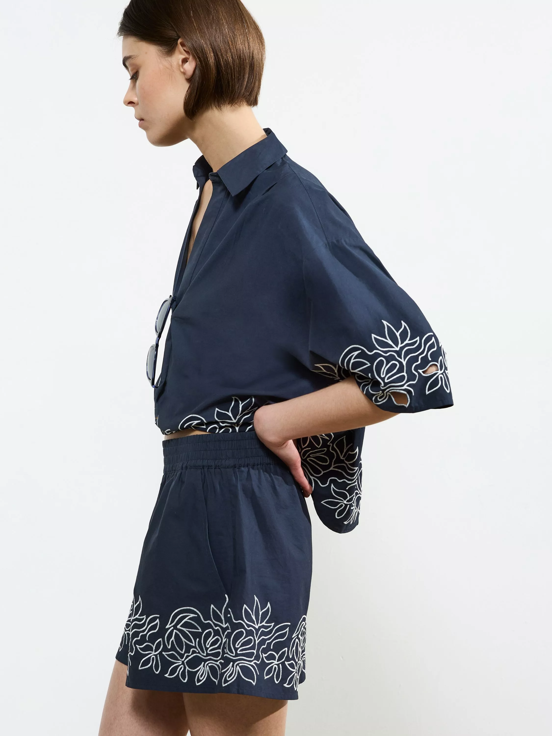 The Alissa Cotton Popover Shirt is the embodiment of sunshine shirting. This popover shirt brightens your warm weather wardrobe in an oversized silhouette featuring a collar and v neckline, whilst floral embroidery graces its high-low hemline. Complete the matching set by pairing with our Alissa Cotton Shorts.