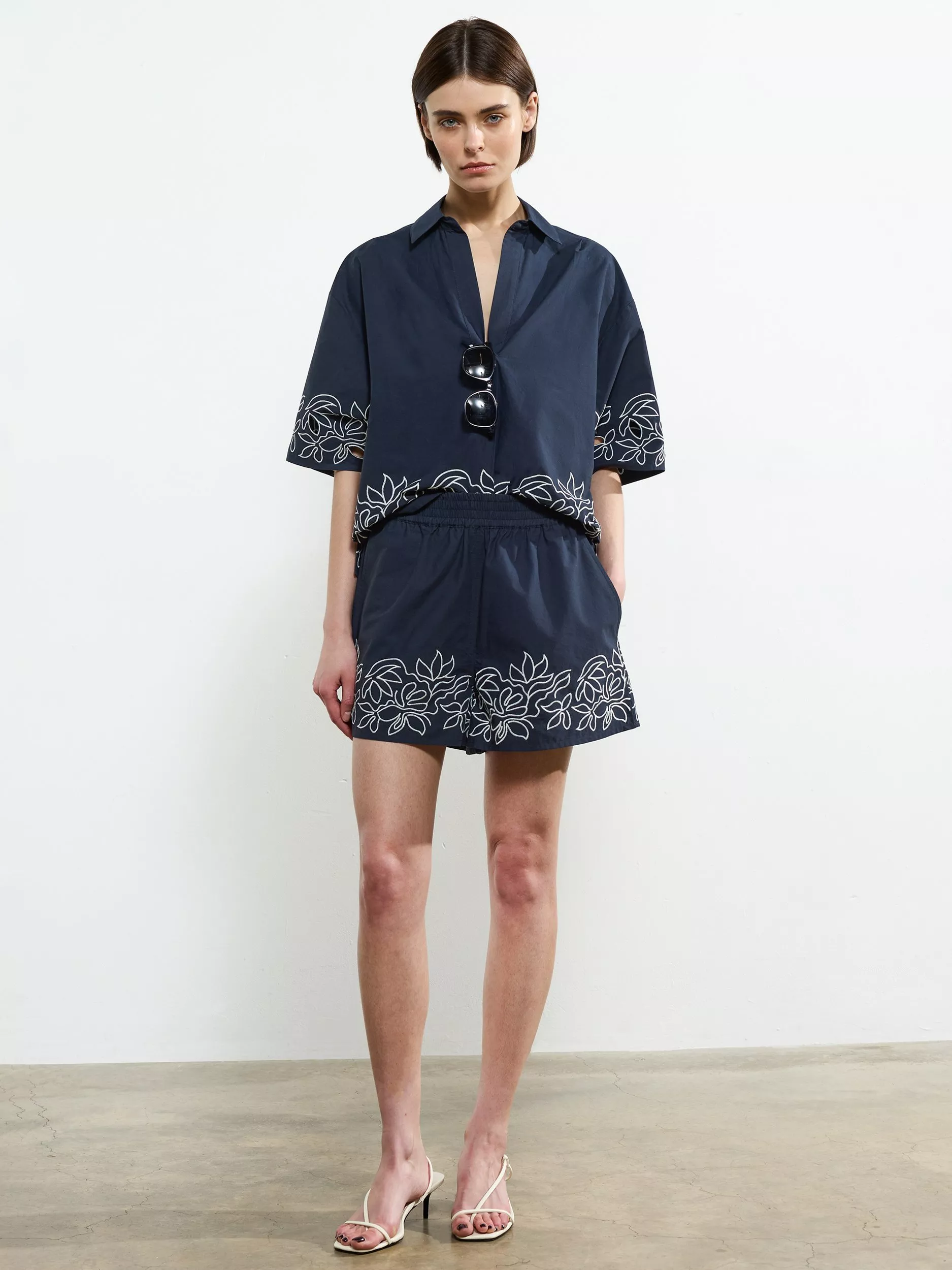 Brighten up your summer day styling with French Connection's Alissa Cotton Shorts. These lightweight cotton shorts ensure all day comfort with an elasticated waistband and handy side pockets whilst floral embroidery brings sunshine with every step. Complete the matching set by pairing with the matching shirt.