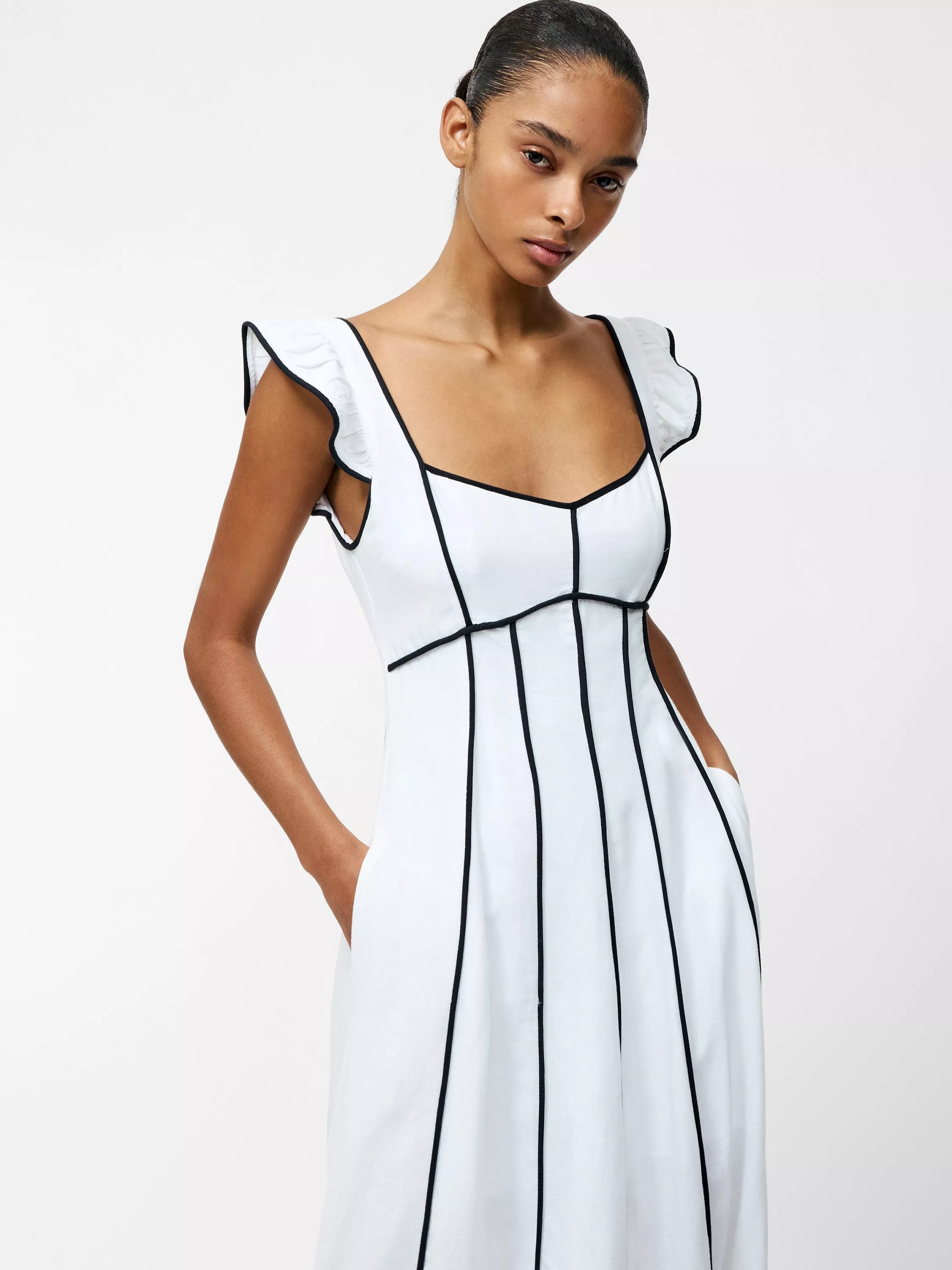 The Ariette Flared Midi Dress brings a modern twist to classic charm. This dress presents a floaty flared silhouette featuring feminine frill straps and contrasting piping effortlessly combining playful details with a flattering midi length.