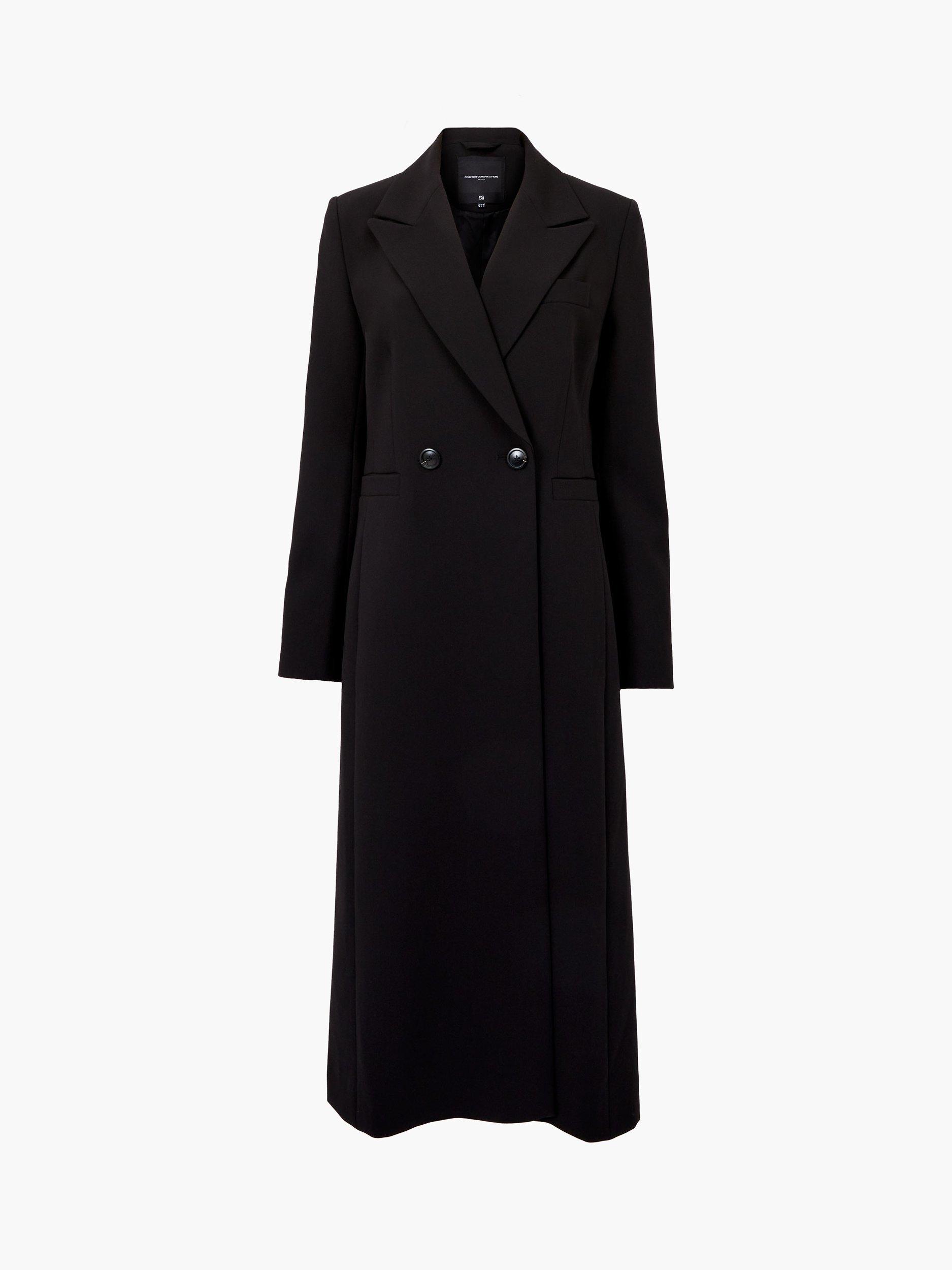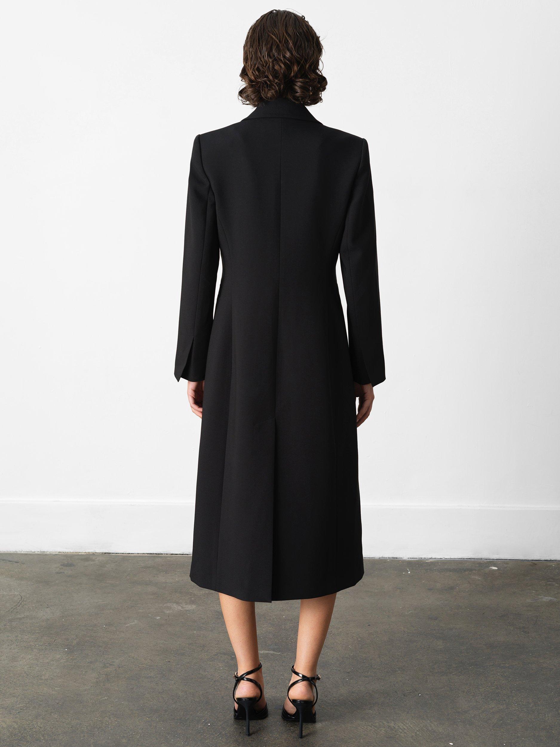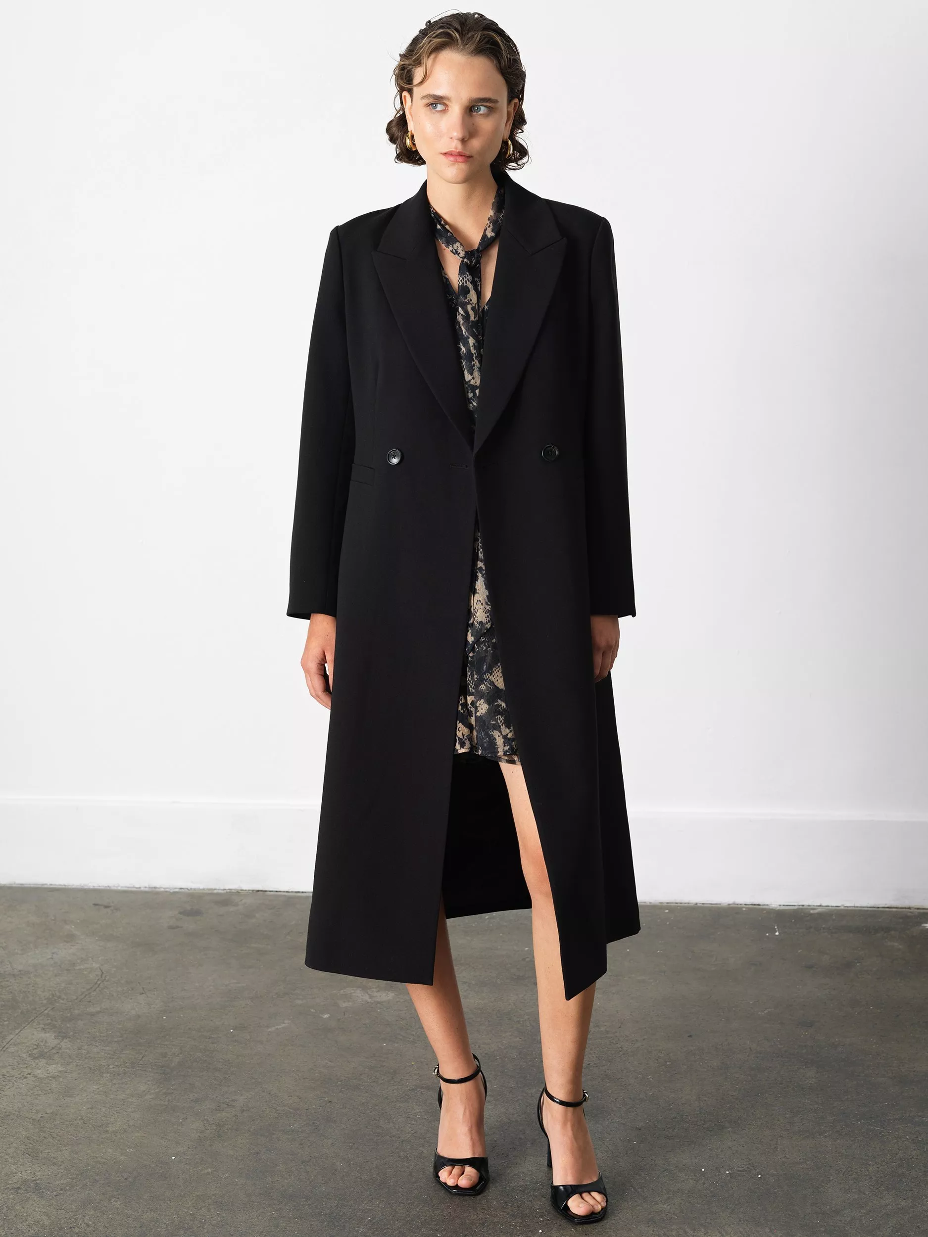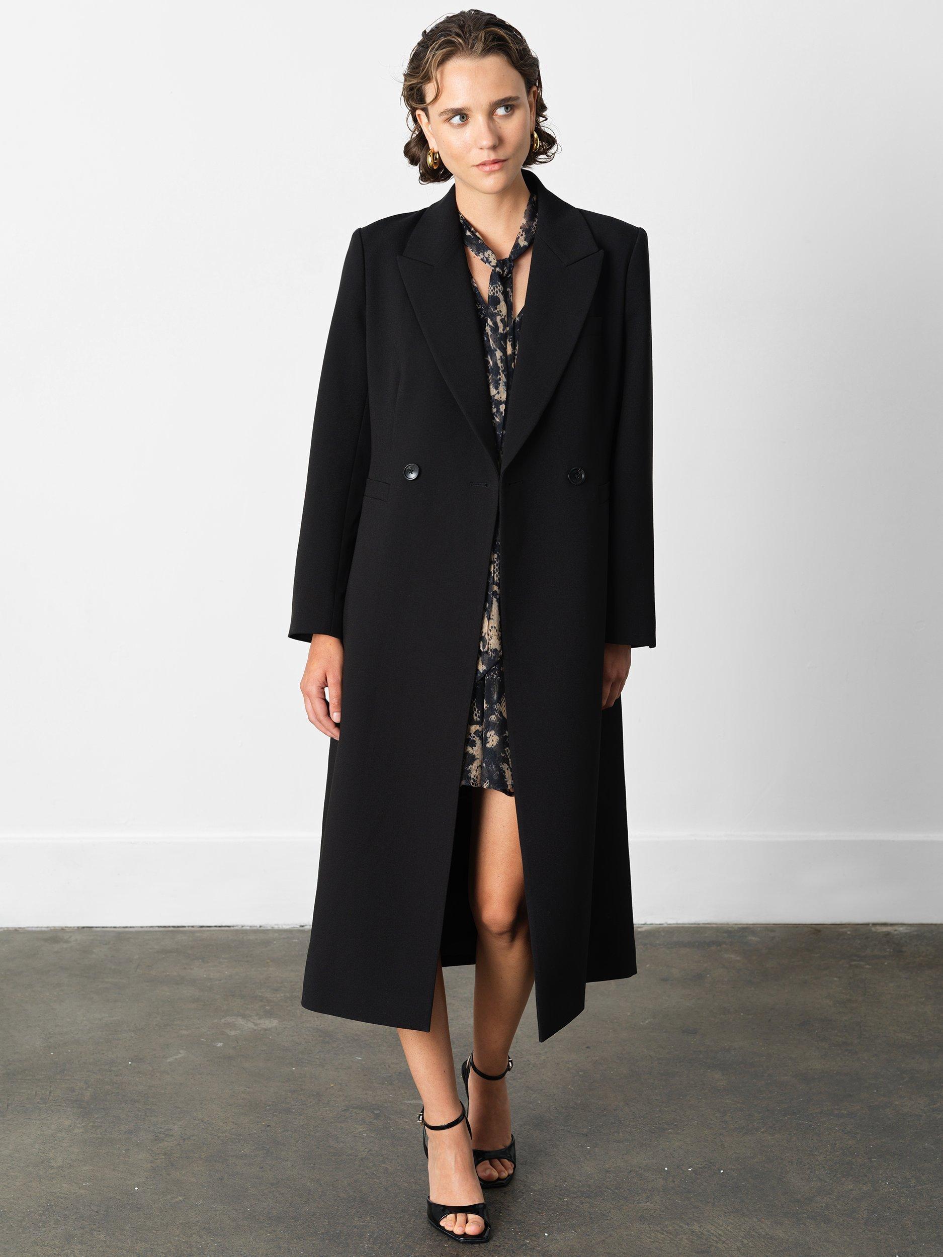 Meet the coat that means business. The Azra Twill Structured Coat, cut from smooth twill, presents a double-breasted front and elongated silhouette featuring a split lapel collar and padded shoulders.