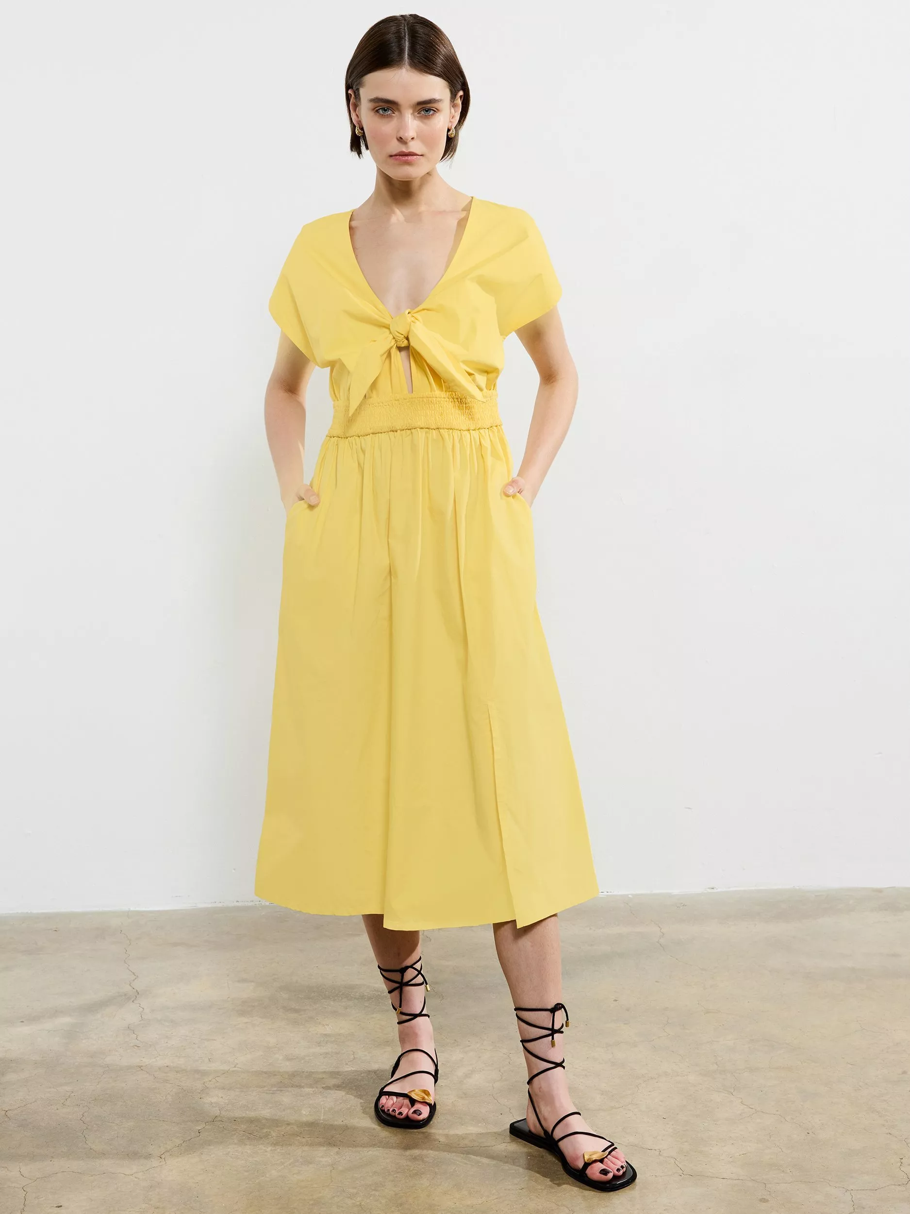 The Barletta Poplin Tie Midi Dress exudes confidence with its mix of modern design and timeless appeal. This breathable poplin dress features a daring front tie detail and subtle midriff cut out to complement its v neckline whilst leading to an elasticated waist for comfort to take you from day to night.