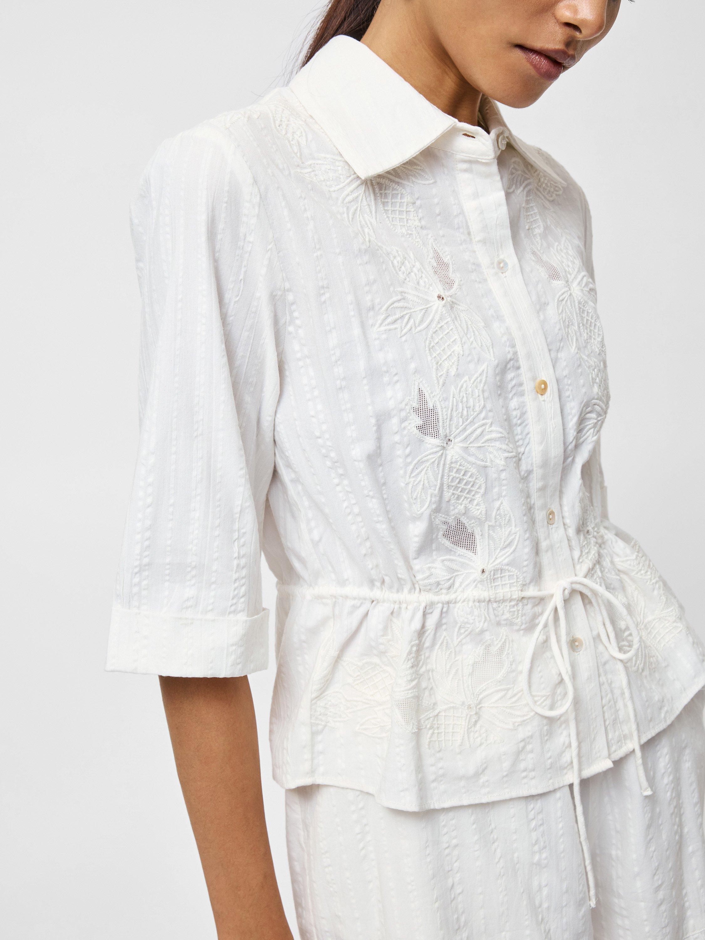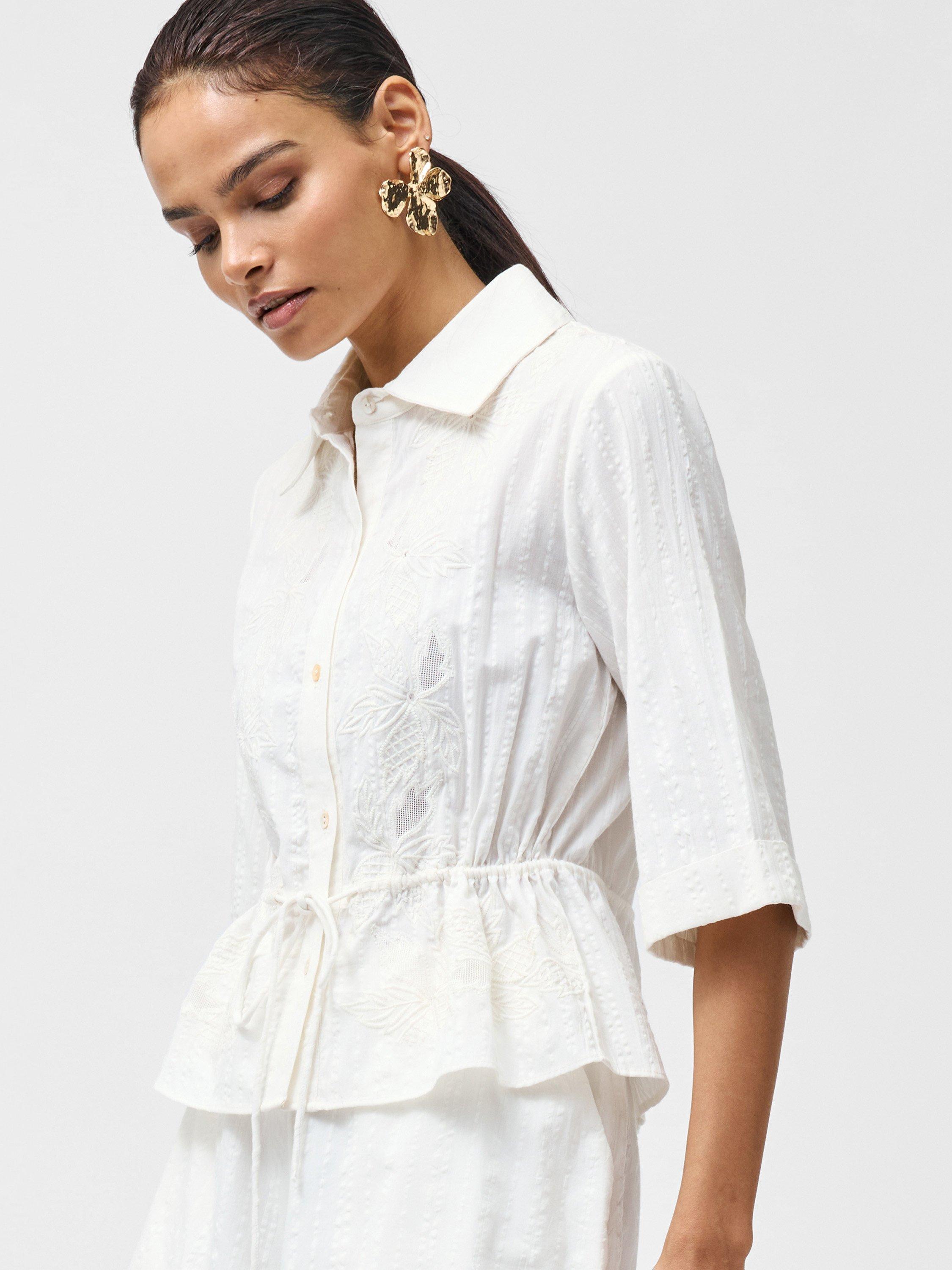The Barnet Embroidered Shirt combines a relaxed silhouette with intricate detailing for a look both effortless and feminine. Delicate embroidery adds a touch of sophistication to this collared button-down shirt, whilst a drawstring waist creates a flattering adjustable fit framed by turn-up sleeves. This breezy shirt offers versatility from casual brunches to weekend getaways.