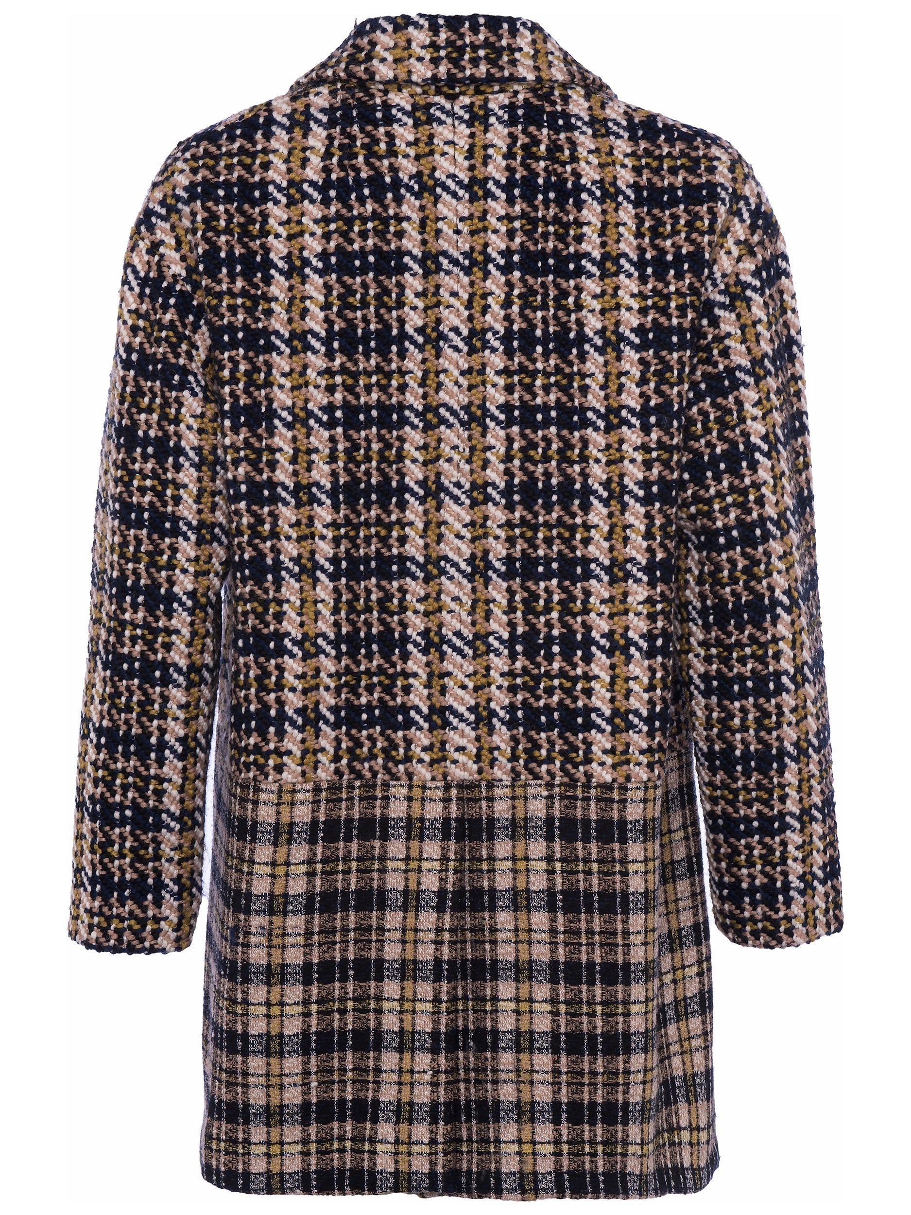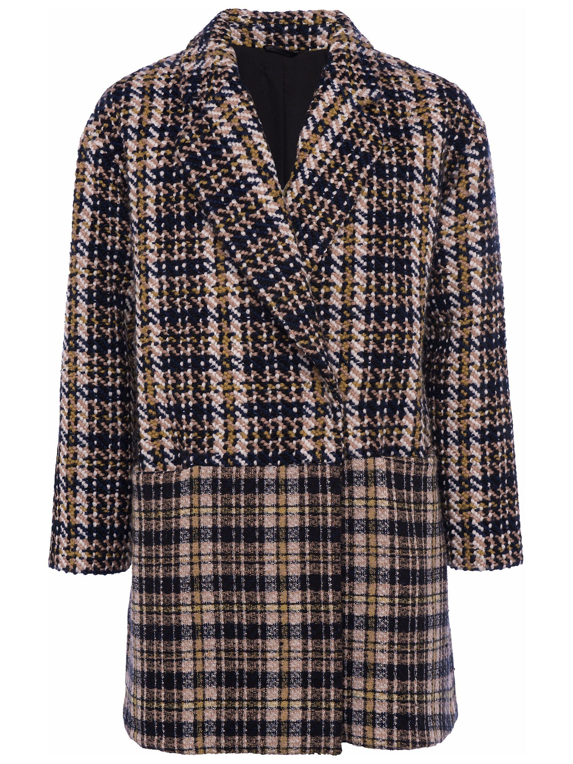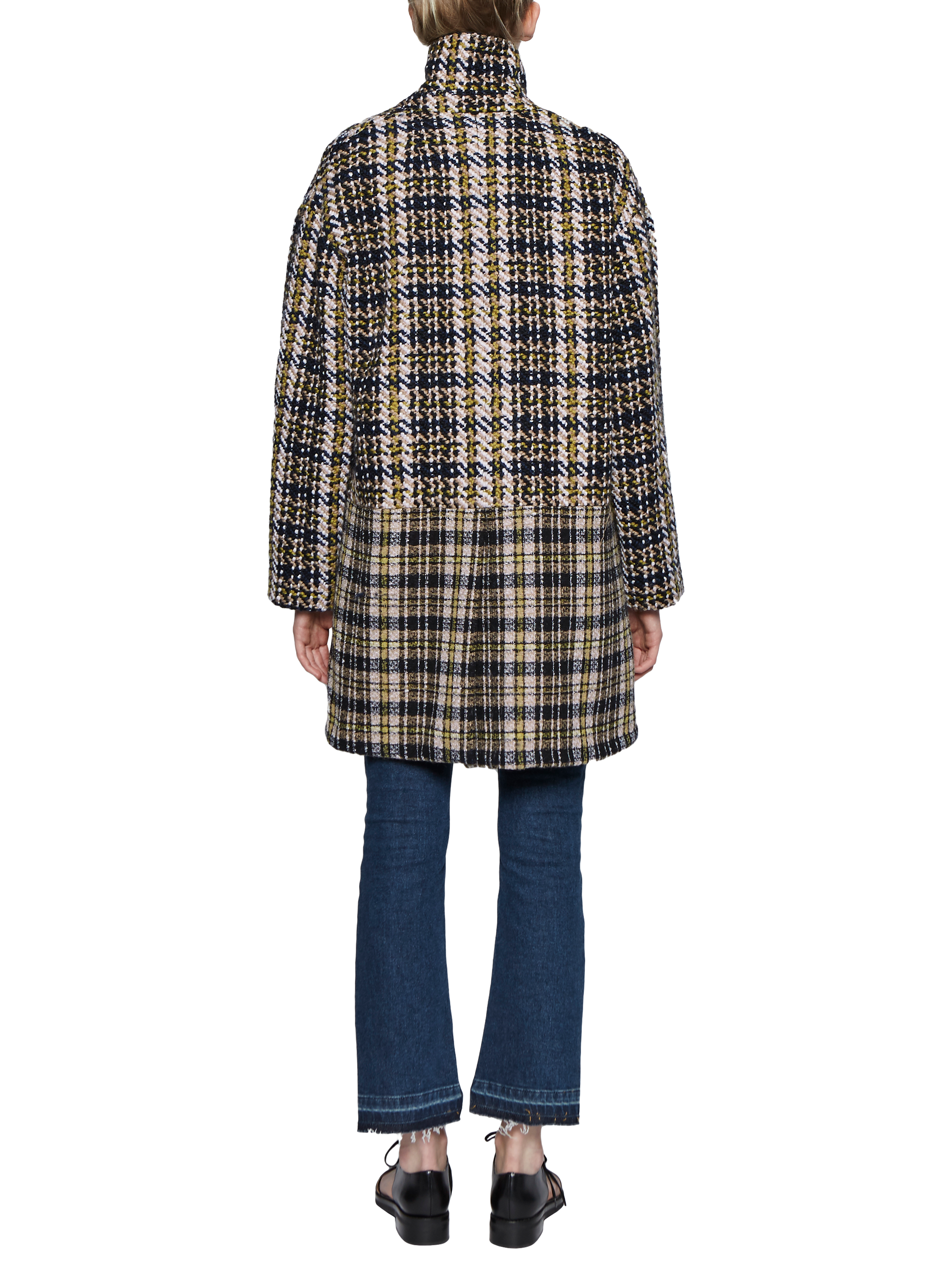 Offering a simple silhouette with an oversized collar, long sleeves and slight cocoon shape, balance the oversized proportion with skinny denim and heeled ankle boots.