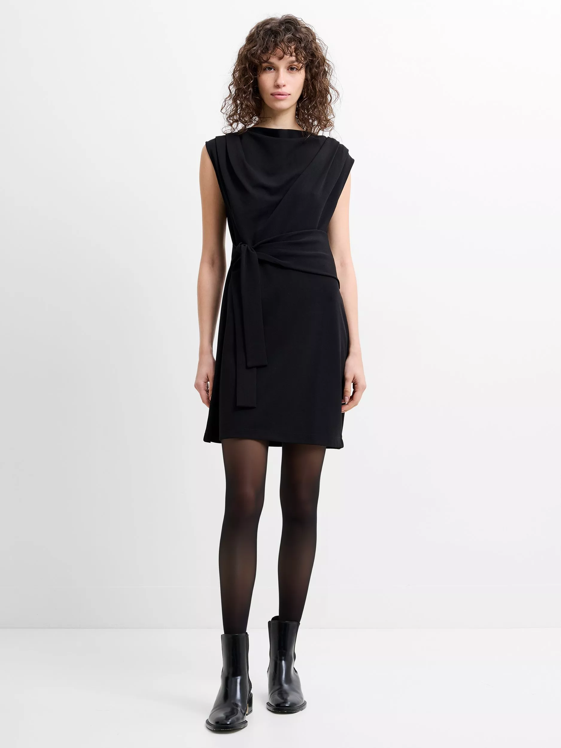 The Zion Jersey Belted Shift Dress has sharp, modern appeal. This tailored mini dress features a high neckline and pleated shoulders, whilst a built-in wrap belt defines the waist.