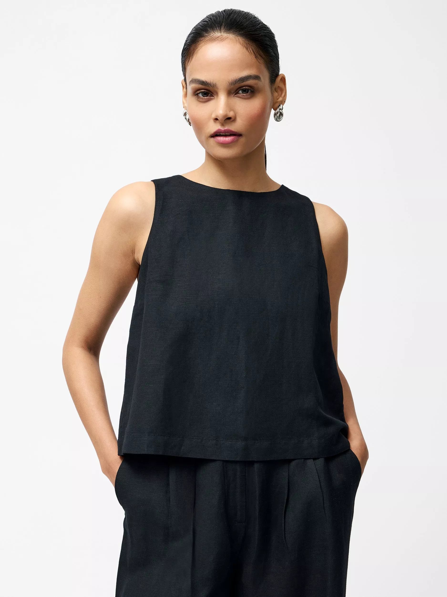 Easy, breezy and full of charm. French Connection's Birdie Linen Tie Back Swing Top features a flattering boat neckline, flowy fit and a statement bow-tied back for the finishing touch.