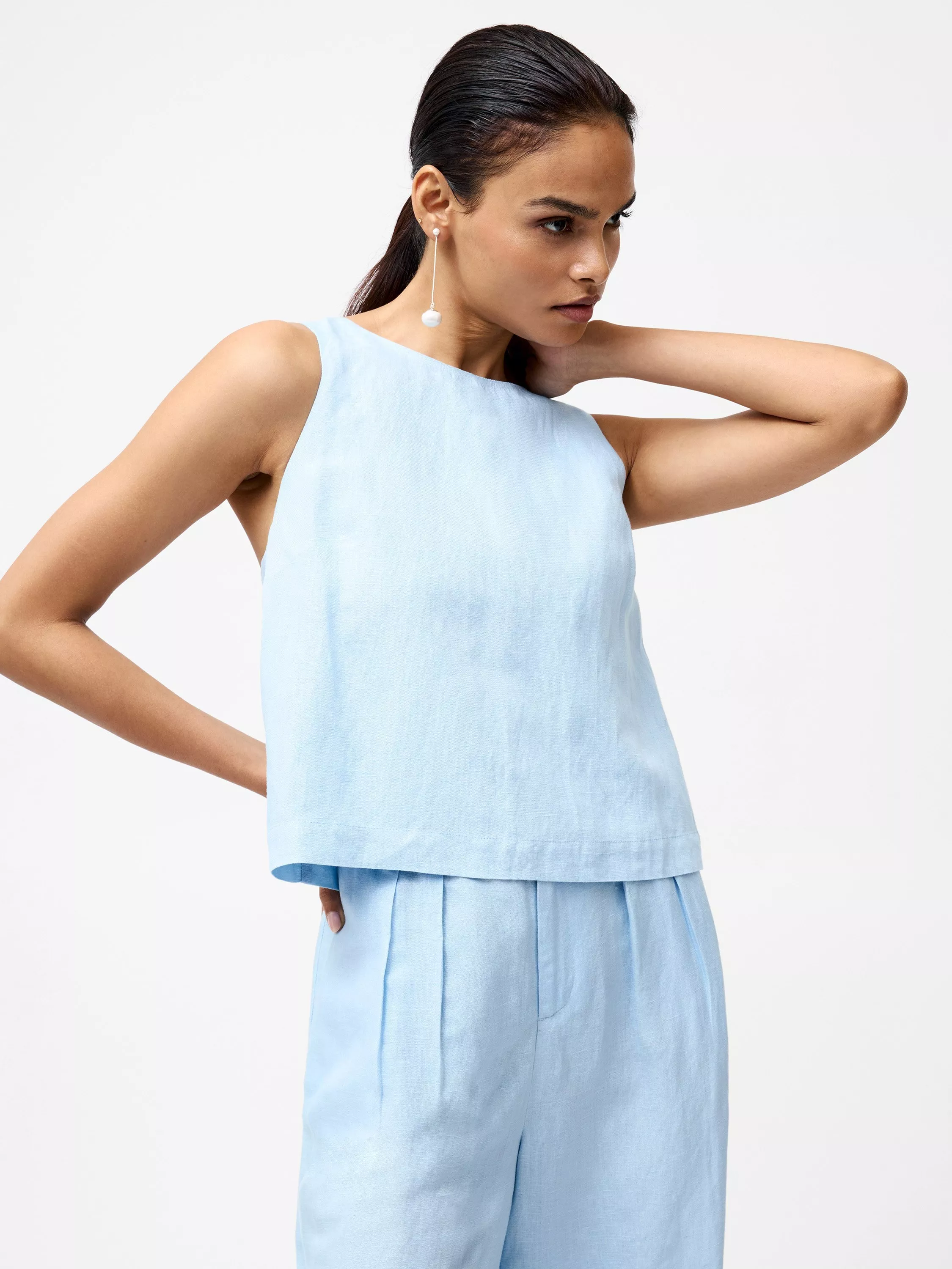 Easy, breezy and full of charm. French Connection's Birdie Linen Tie Back Swing Top features a flattering boat neckline, flowy fit and a statement bow-tied back for the finishing touch.