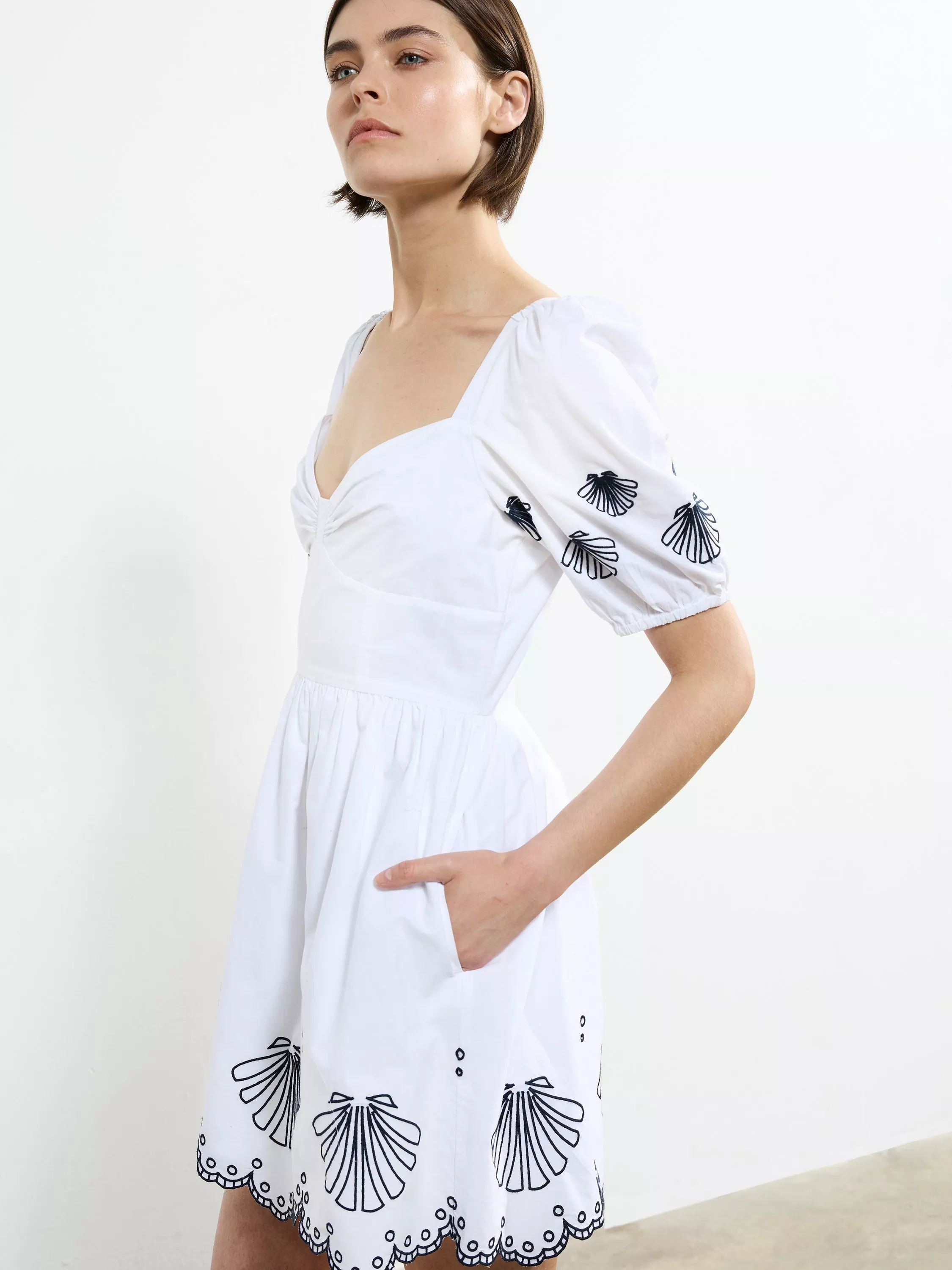 If you are looking for a playful dress this summer then look no further than the Cambria Anglaise Mini Dress. This sweet mini dress brings feminine chic to your warm weather wardrobe with contrasting seashell embroidery complementing a silhouette featuring a structured sweetheart neckline and puffed sleeves whilst falling to a floaty skirt with a sweet scalloped hem.