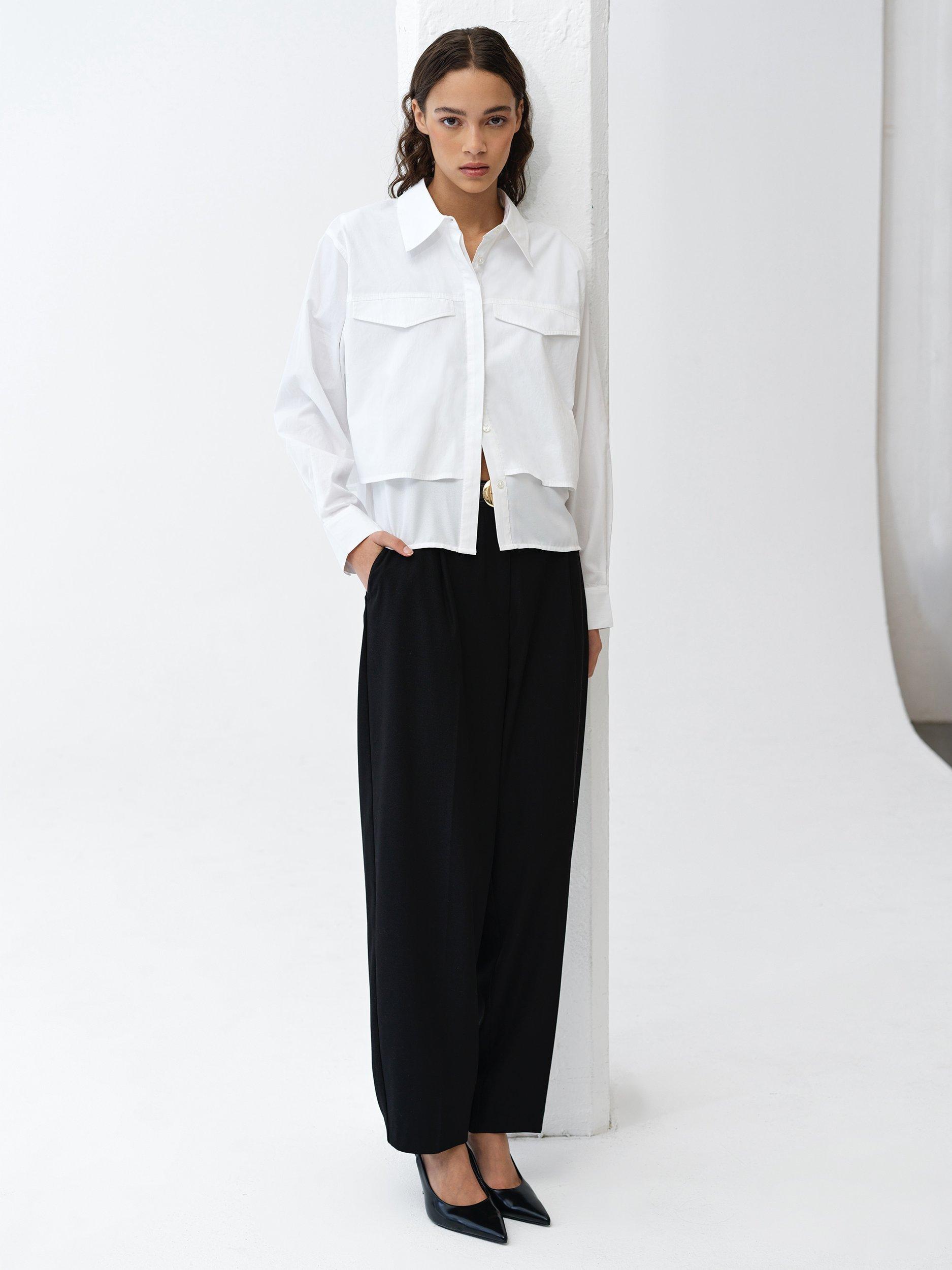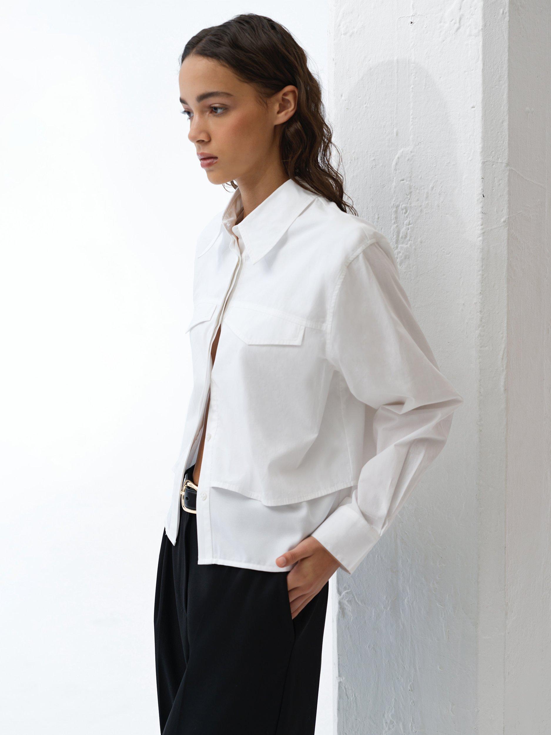 The Cambria Milla Mix Layered Shirt guarantees a double-take. This long sleeve shirt features a layered front design, its crisp overlay featuring a collar and faux flap pockets, whilst falling to a soft underlayer hem.