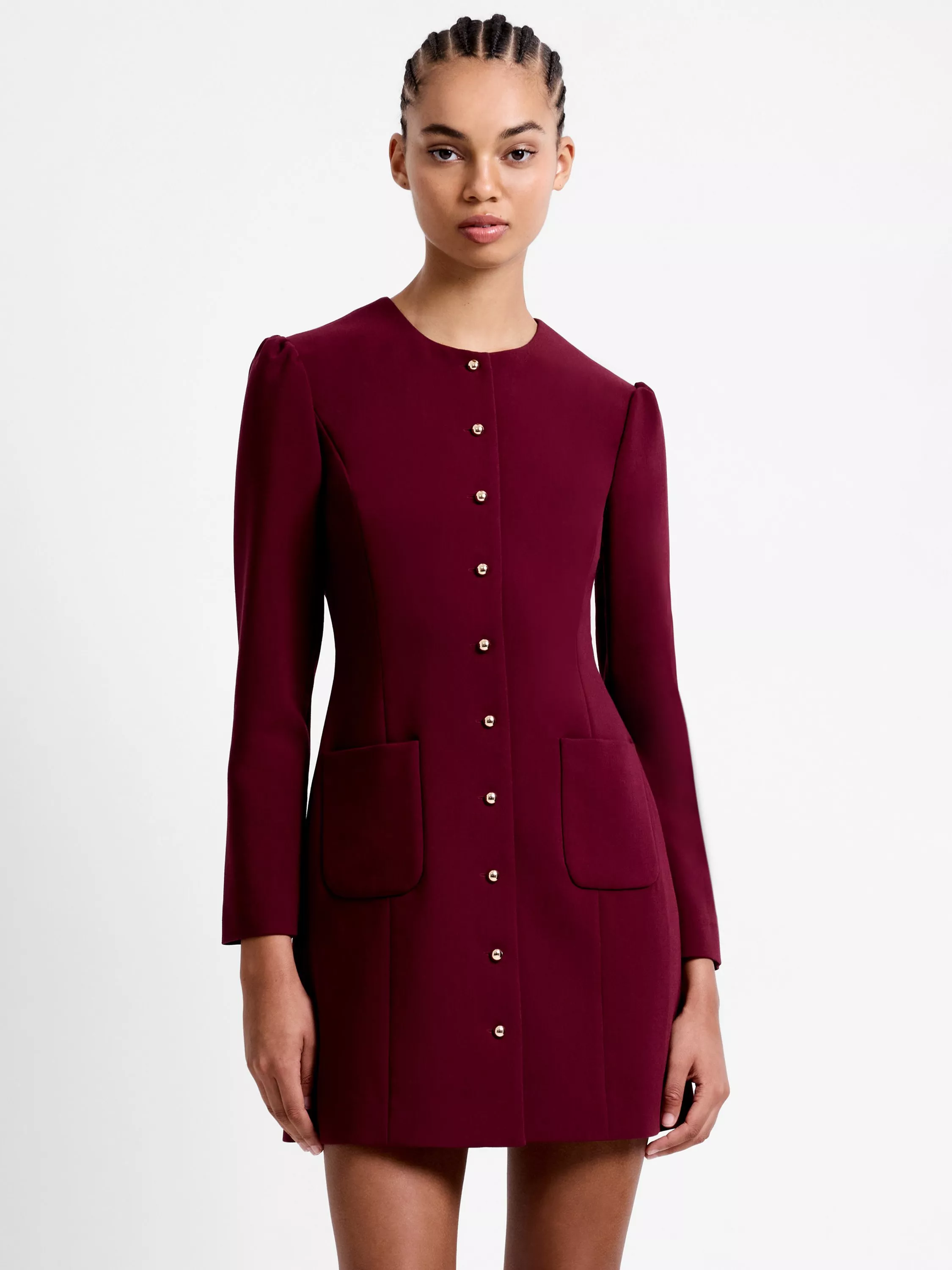 The Celie Button Through Mini Dress is a lesson in modern elegance. A sleek button-down front and soft puffed shoulders paired with sharp tailoring create a silhouette that commands attention.