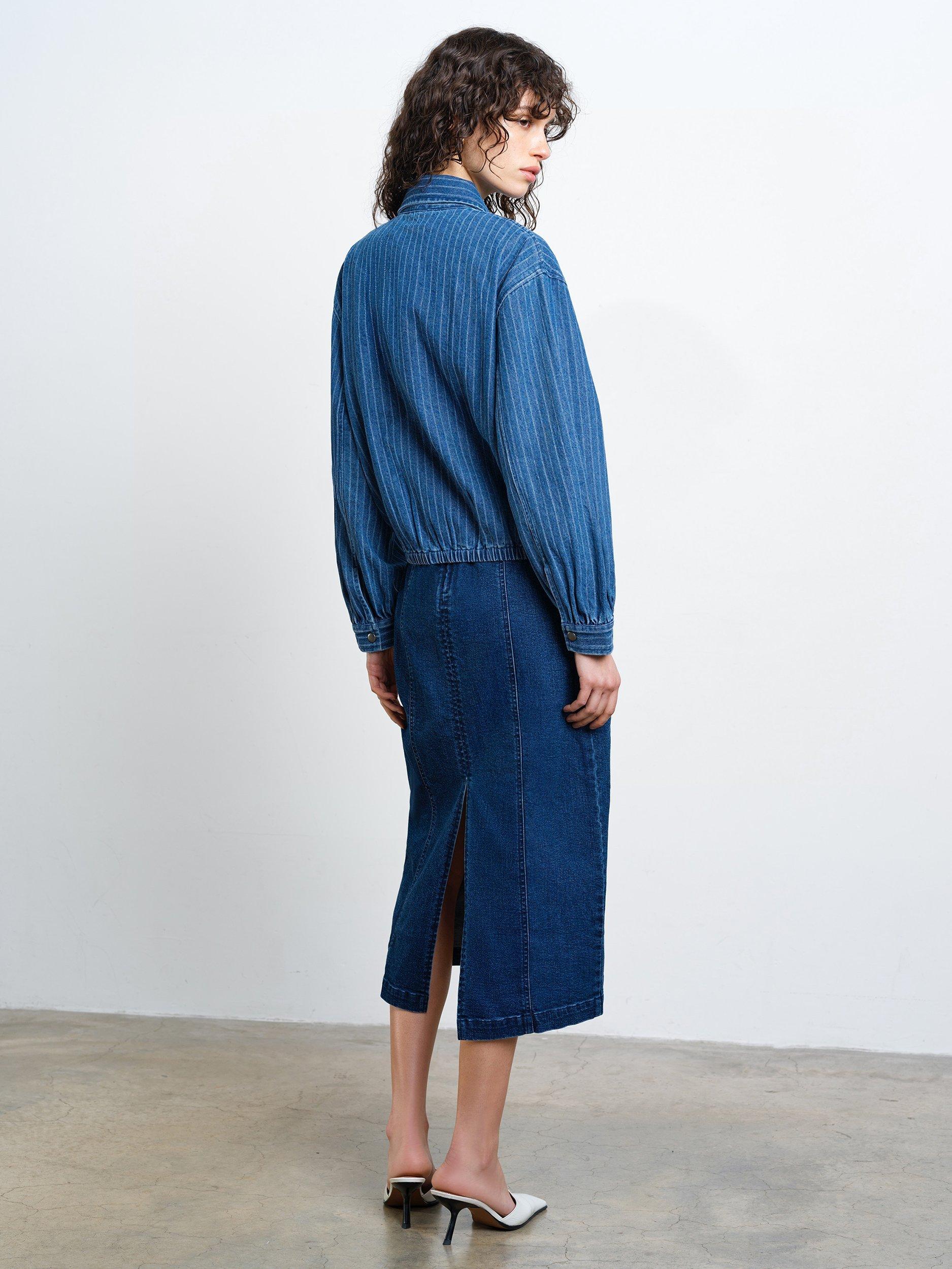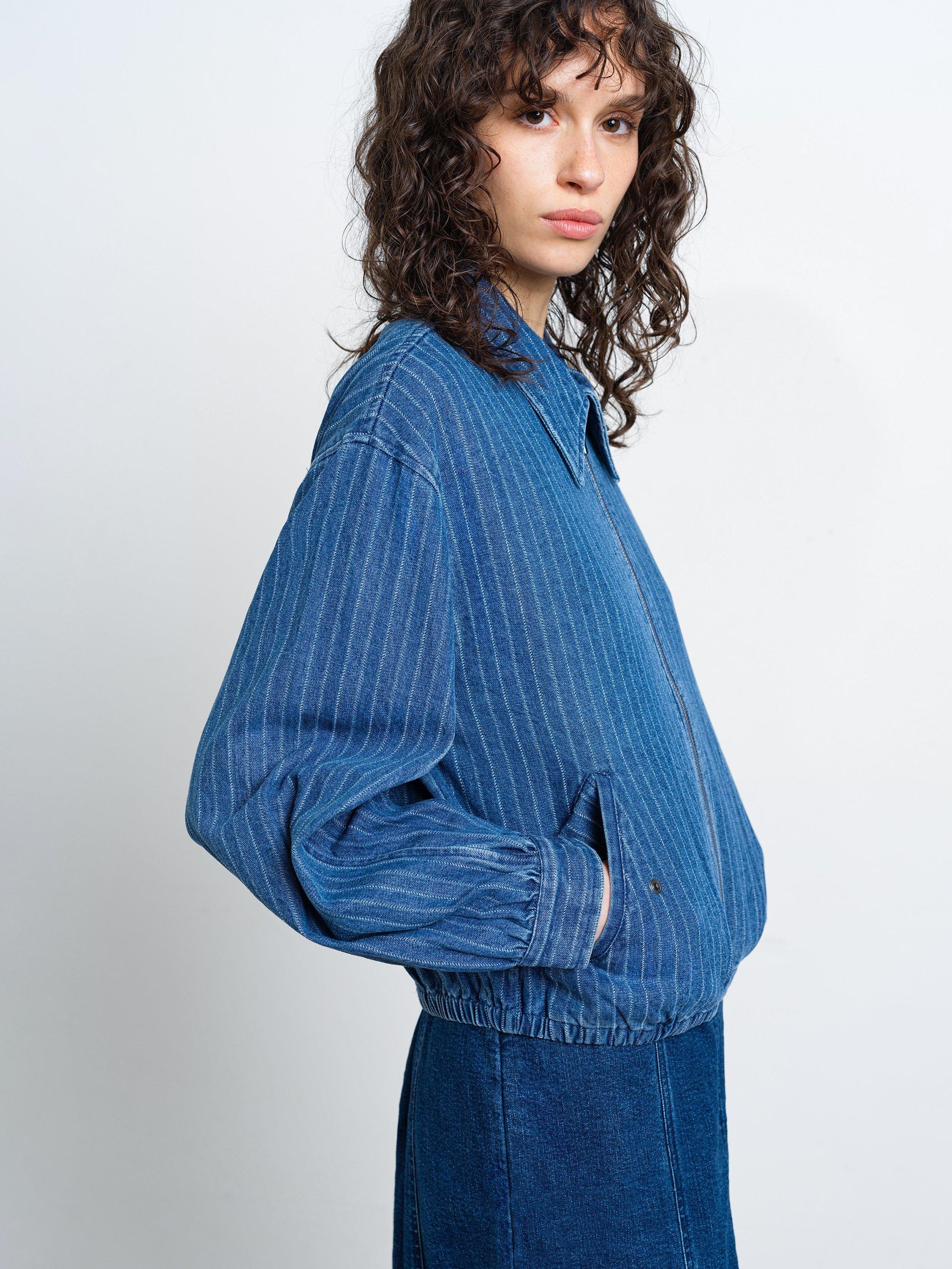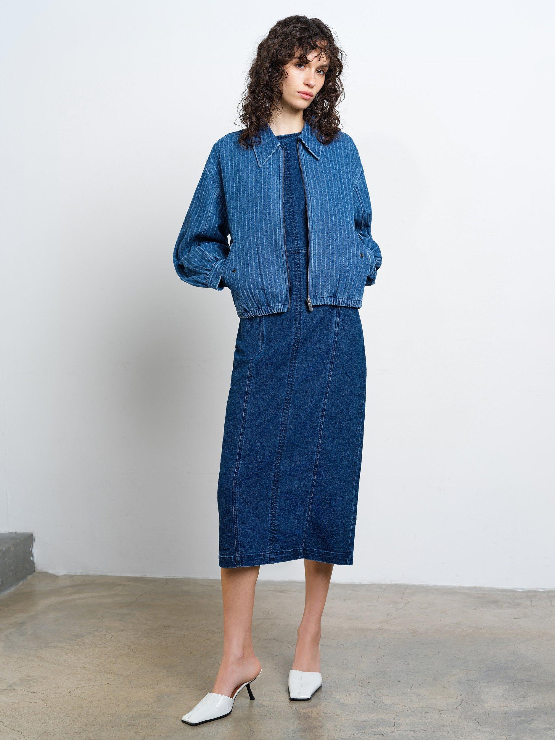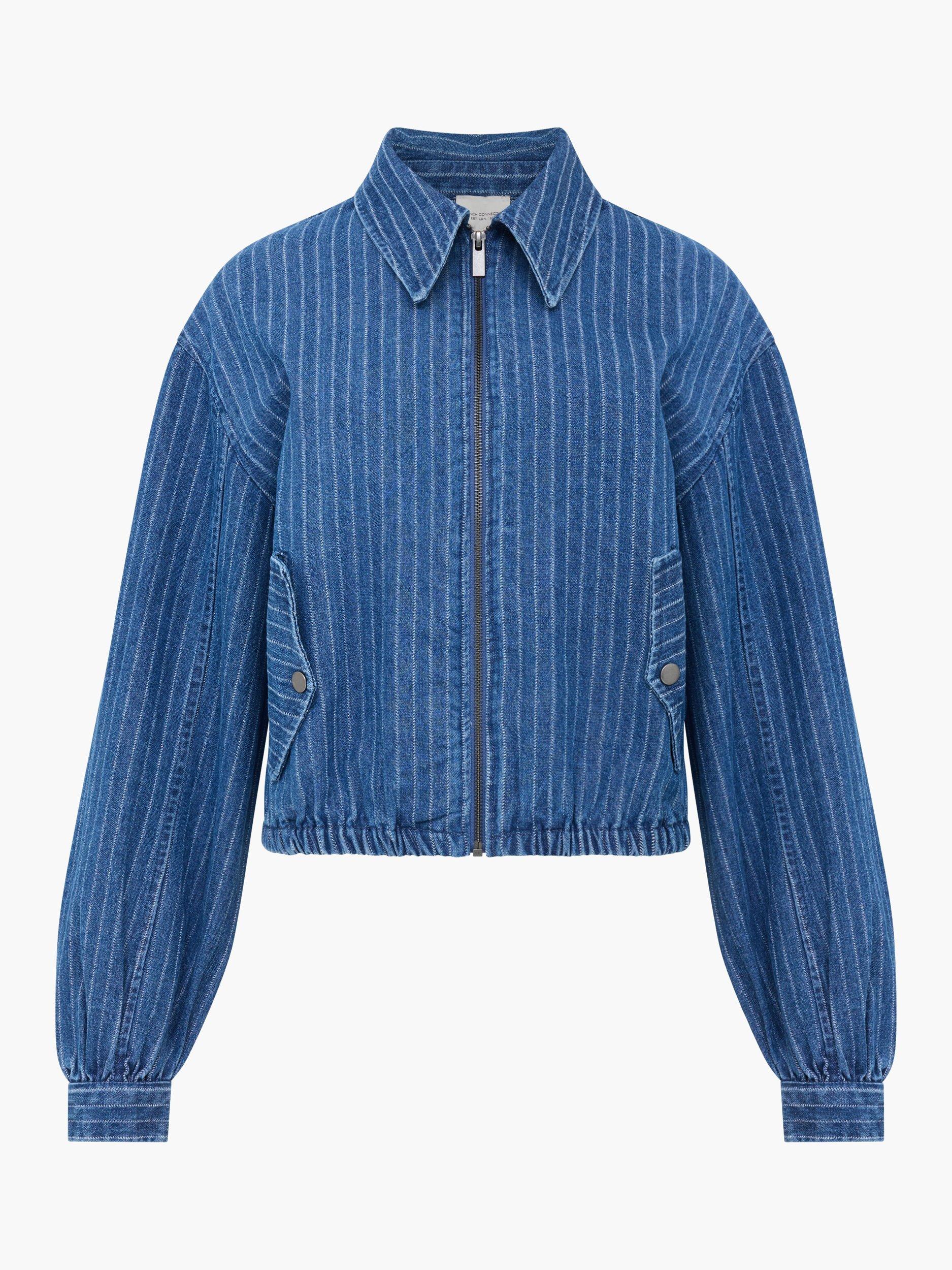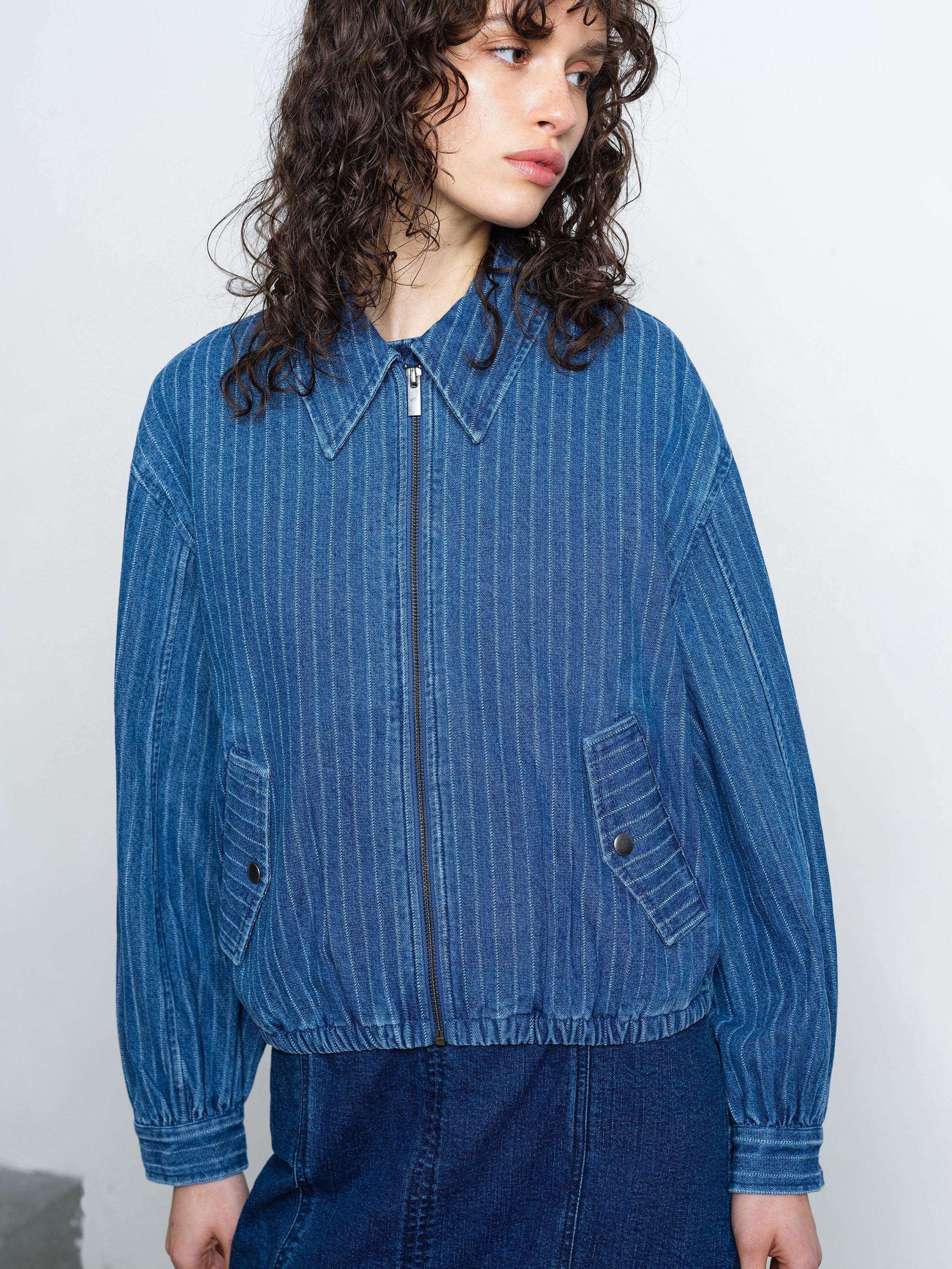 Pinstripes and denim: reimagined. The relaxed silhouette of the Cherrie Pinstripe Denim Bomber Jacket features an oversized collar and fastened pockets alongside a zip-through front and elasticated waist.