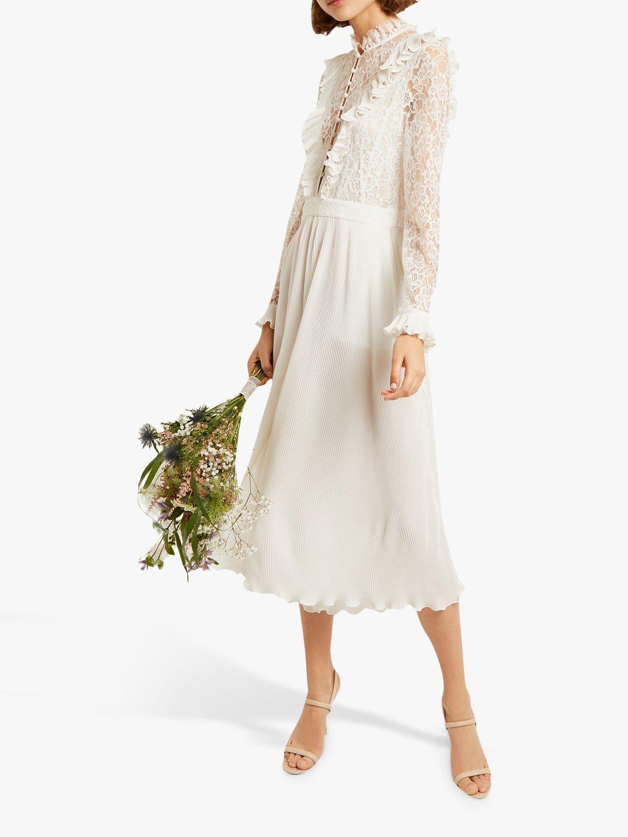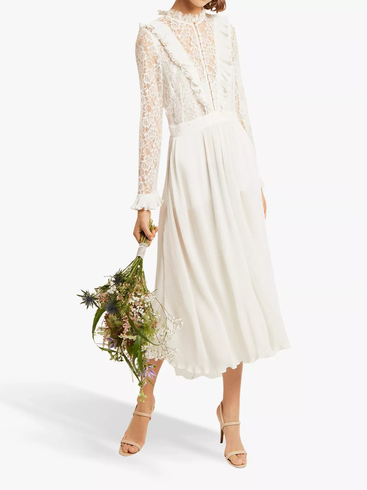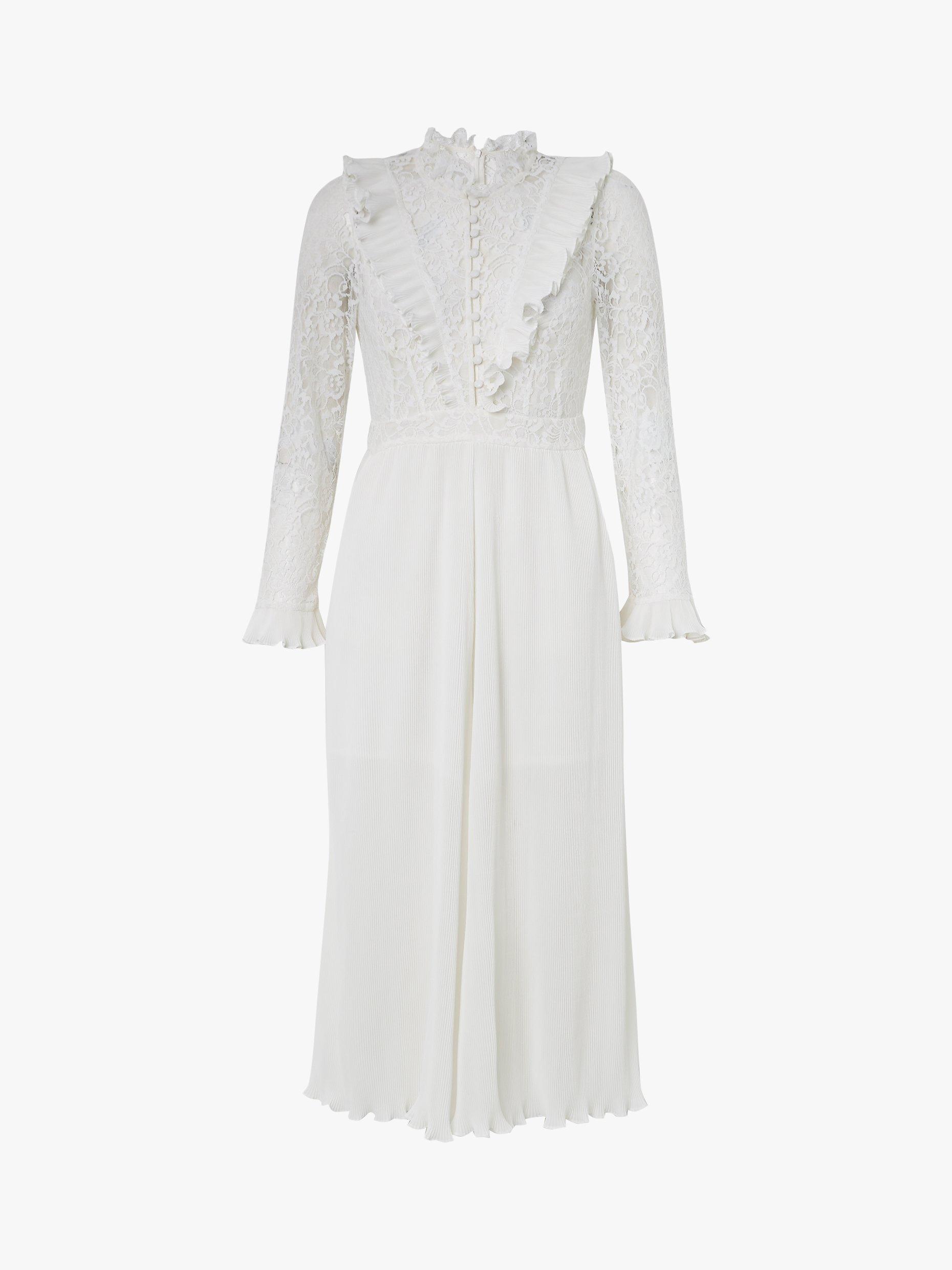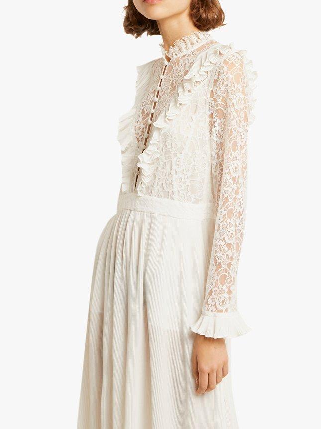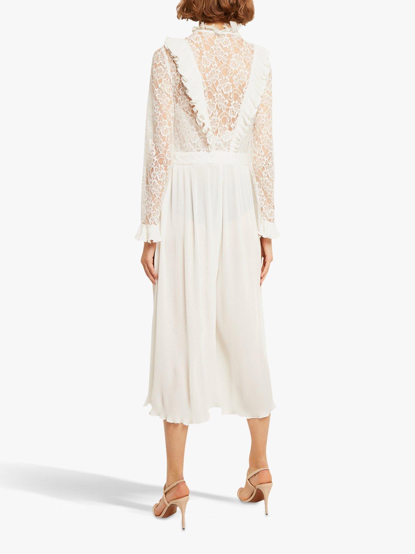 Perfect for wedding season, this lace jumpsuit from French Connection is styled with decadently patterned lace and ruffle detailing at the bodice, with a funnel neck and midi length to elongate through the body.