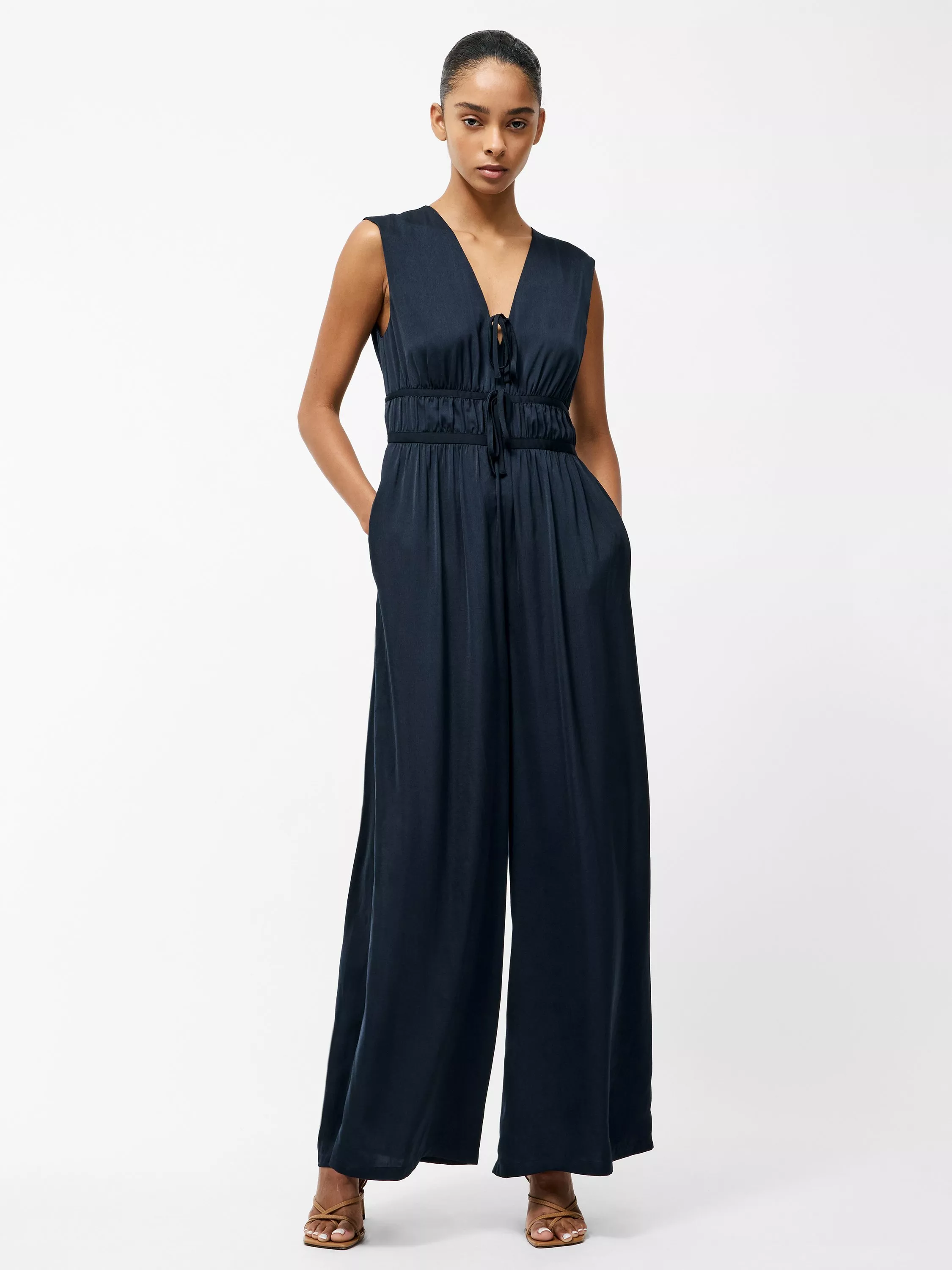 Summer sophistication meets chic comfort with the lightweight Damasco Air Flow Poly Jumpsuit. It can be worn from day to night with its sleeveless silhoutte featuring flattering and feminine touches, from self tie necklines and a gathered waist that flows to a wide leg fit.