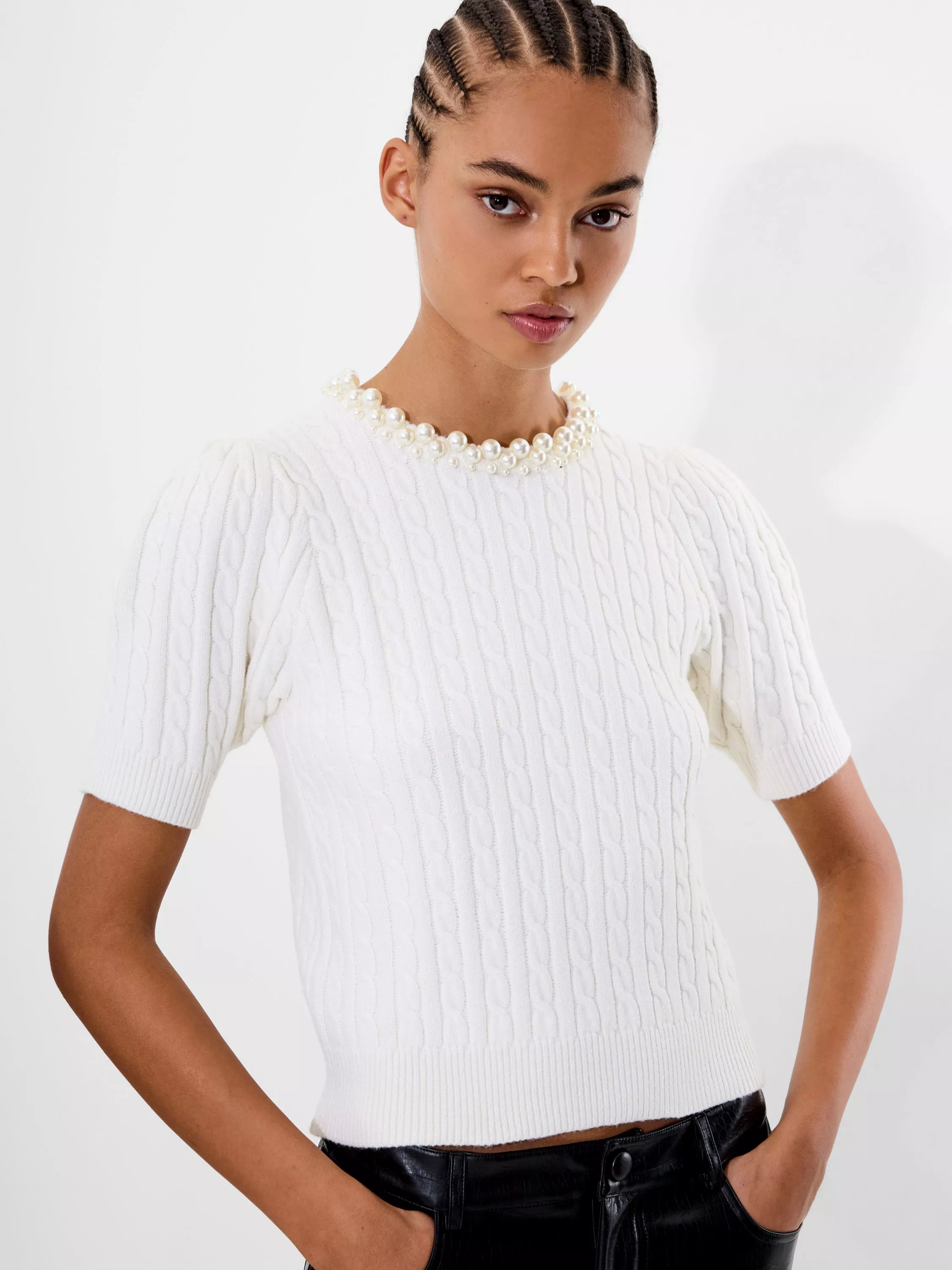 Pretty meets polished. In a soft cable knit, the Embellished Neck Short Sleeve Cable Knit Sweater features short sleeves, ribbed trims and an embellished faux pearl neckline for a touch of vintage-inspired charm.