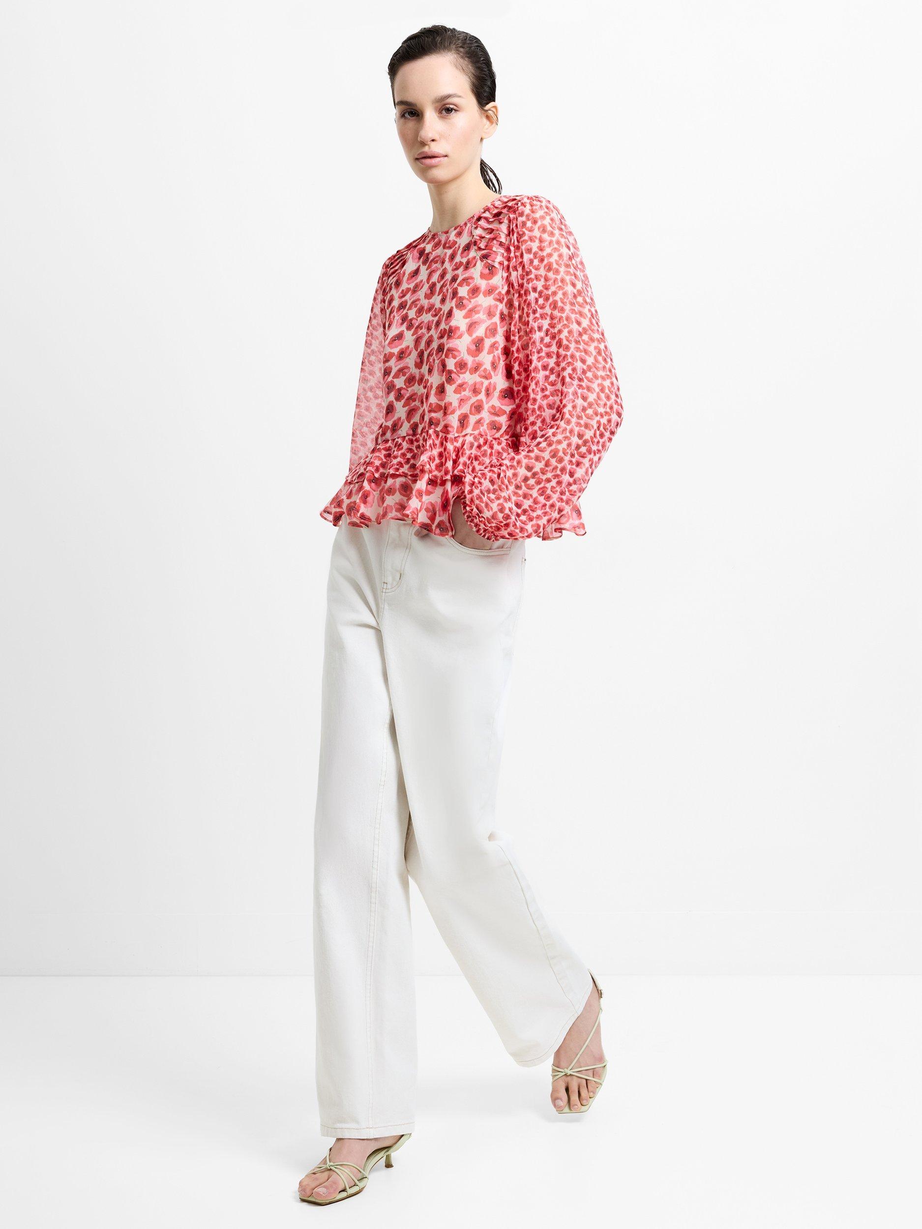 The Poppy Emina Semi Sheer Puff Sleeve Top is designed with soft shoulder pleats and airy puff sleeves, complemented by subtle ruffle accents and bold poppy print for a playful feminine finish.