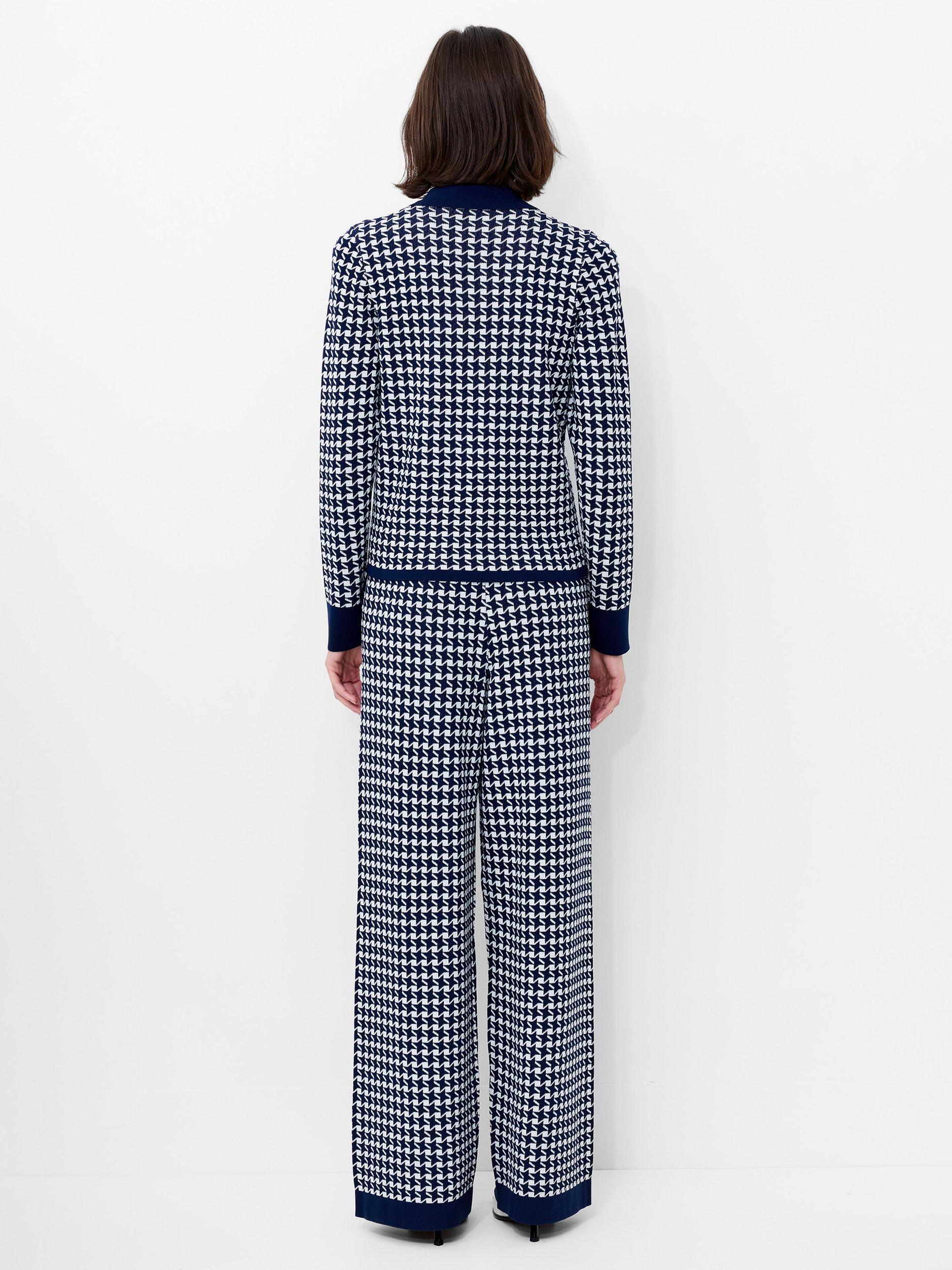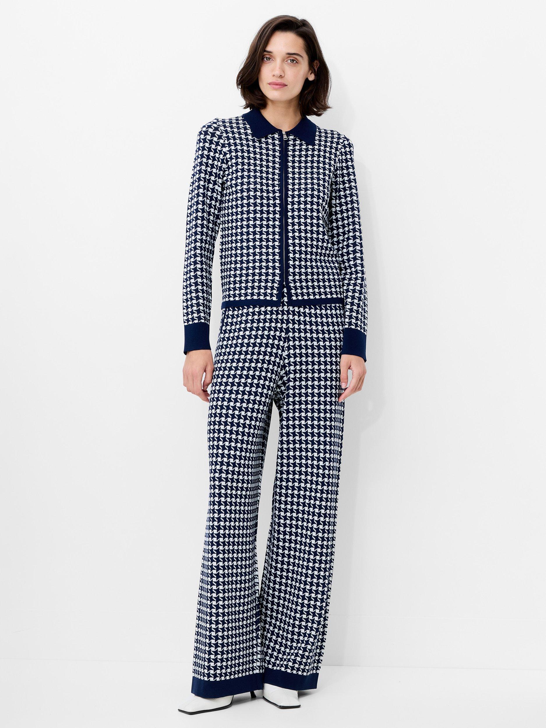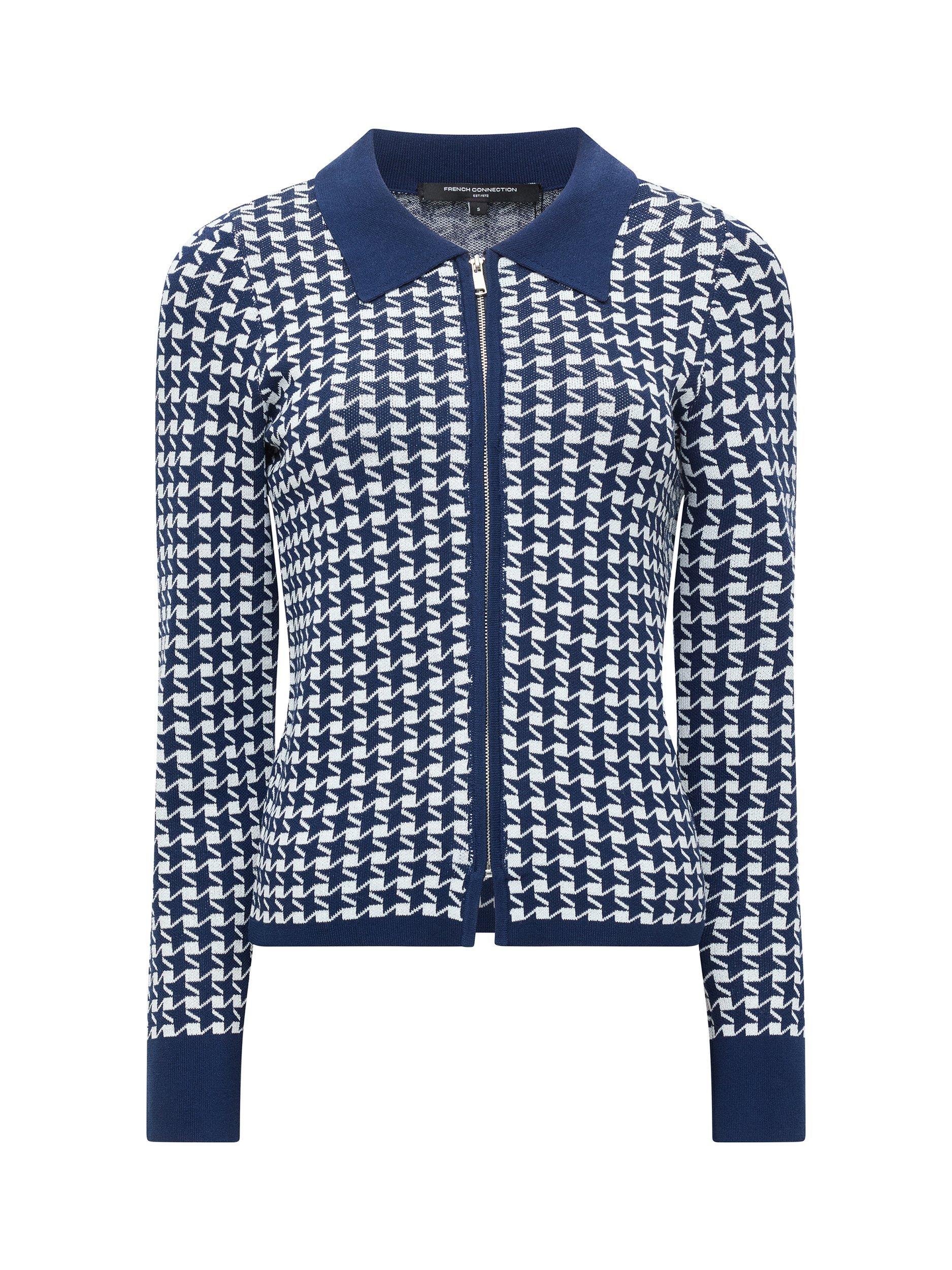 The Gloria Jacquard Knit Zip Up Cardigan features a classic collar and sleek zip front, whilst showcasing a bold geometric pattern for a refined take on retro-inspired style.