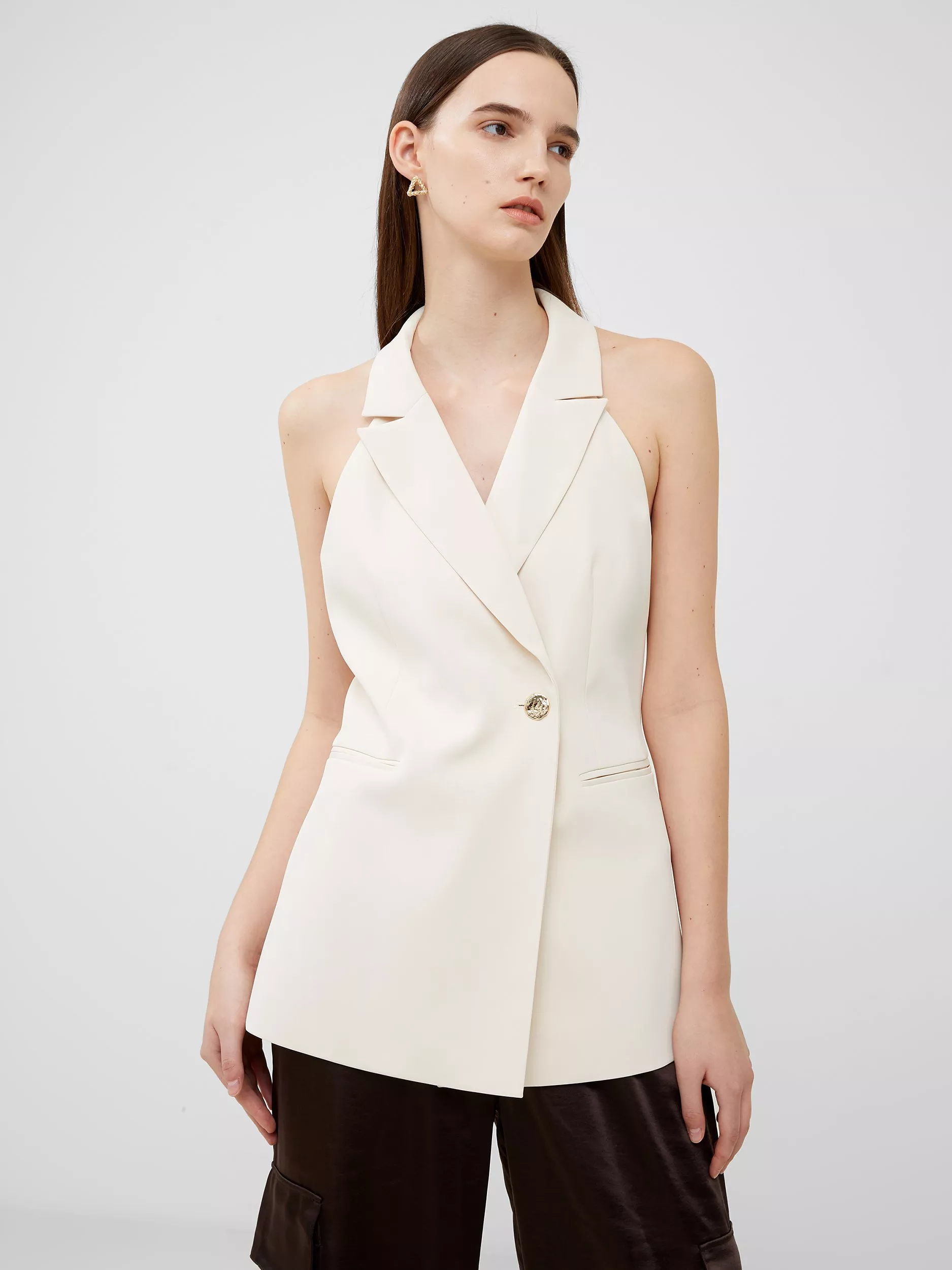 A modern take on a sartorial staple, this lightweight waistcoat comes with a simple and fuss-free one button fastening and halter-style neckline.