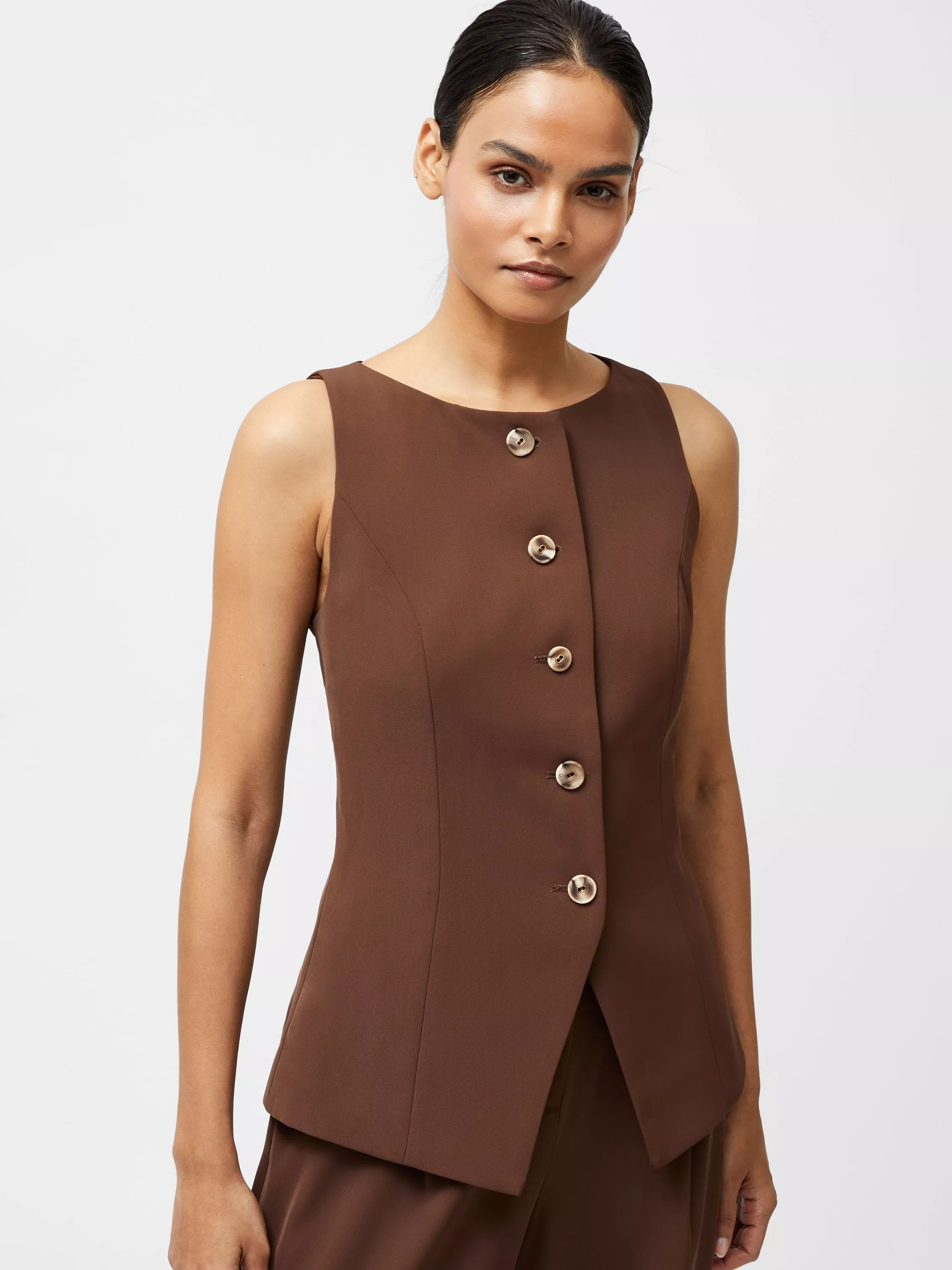 The Harrie Suiting Waistcoat Top was tailored to your wardrobe. This sleek suiting style offers itself as an everyday chic piece with a waistcoat inspired silhouette. This sleeveless top presents its smooth body with a boat neckline and button through fastenining with captivating round marble effect buttons.