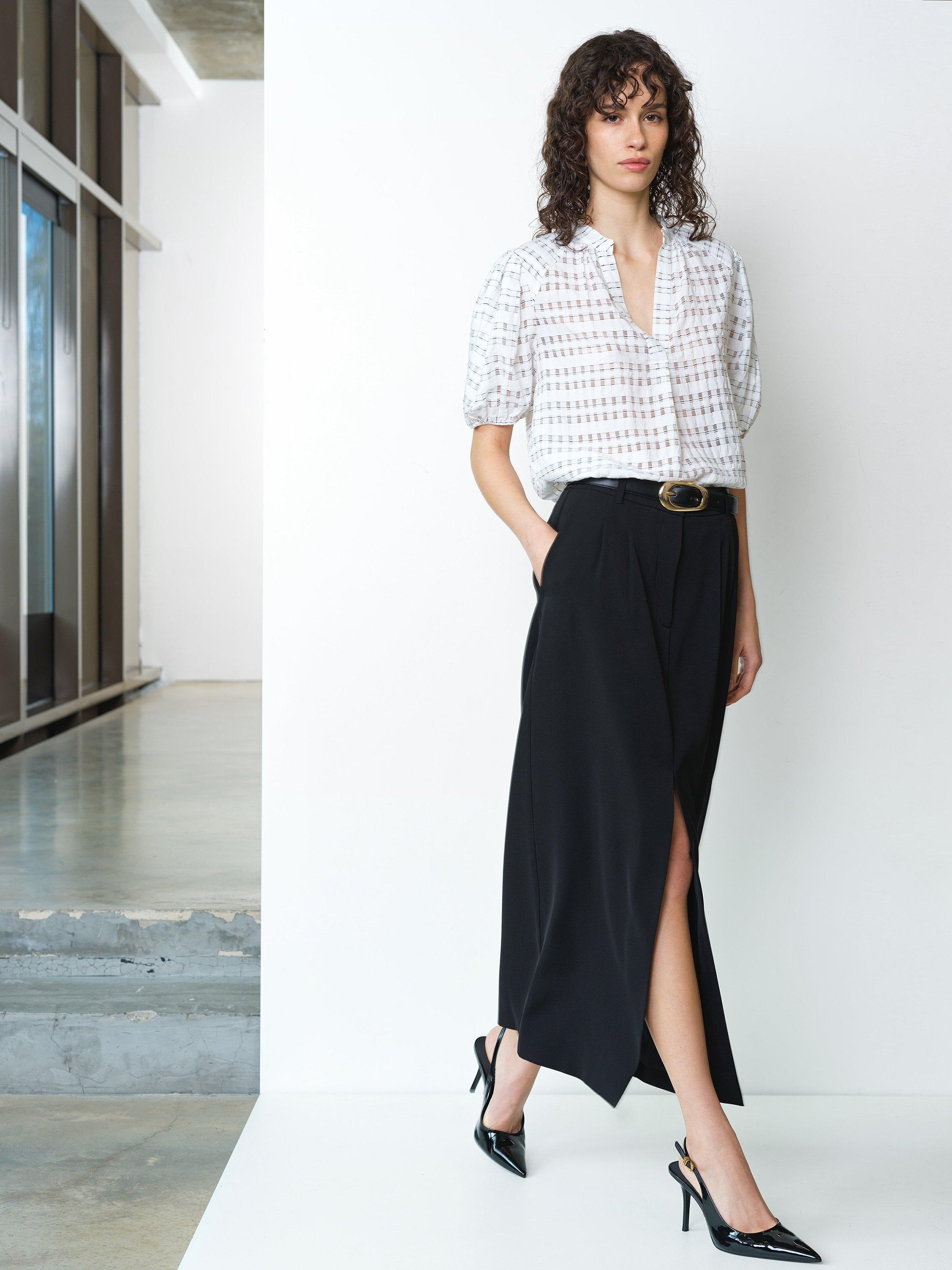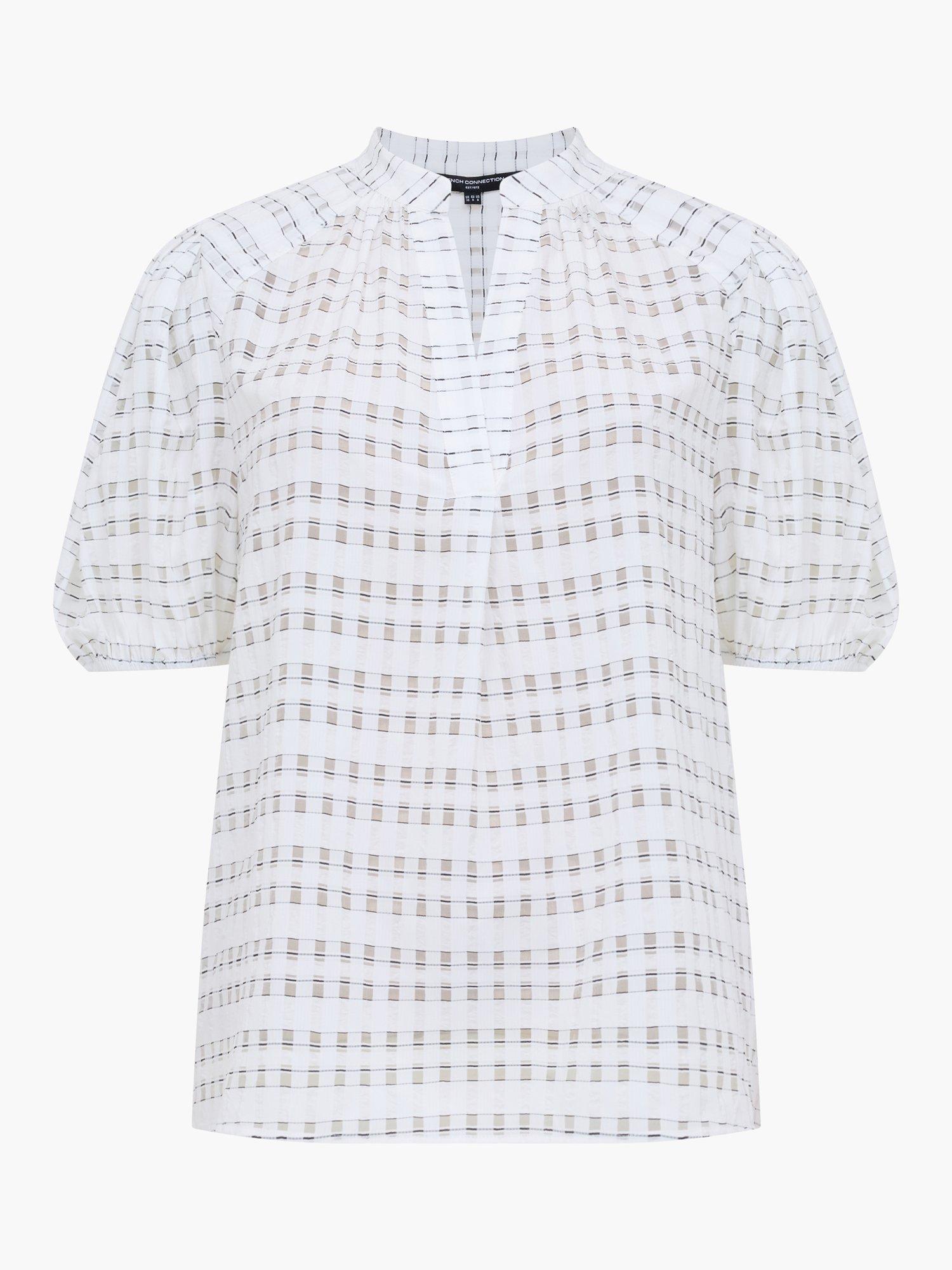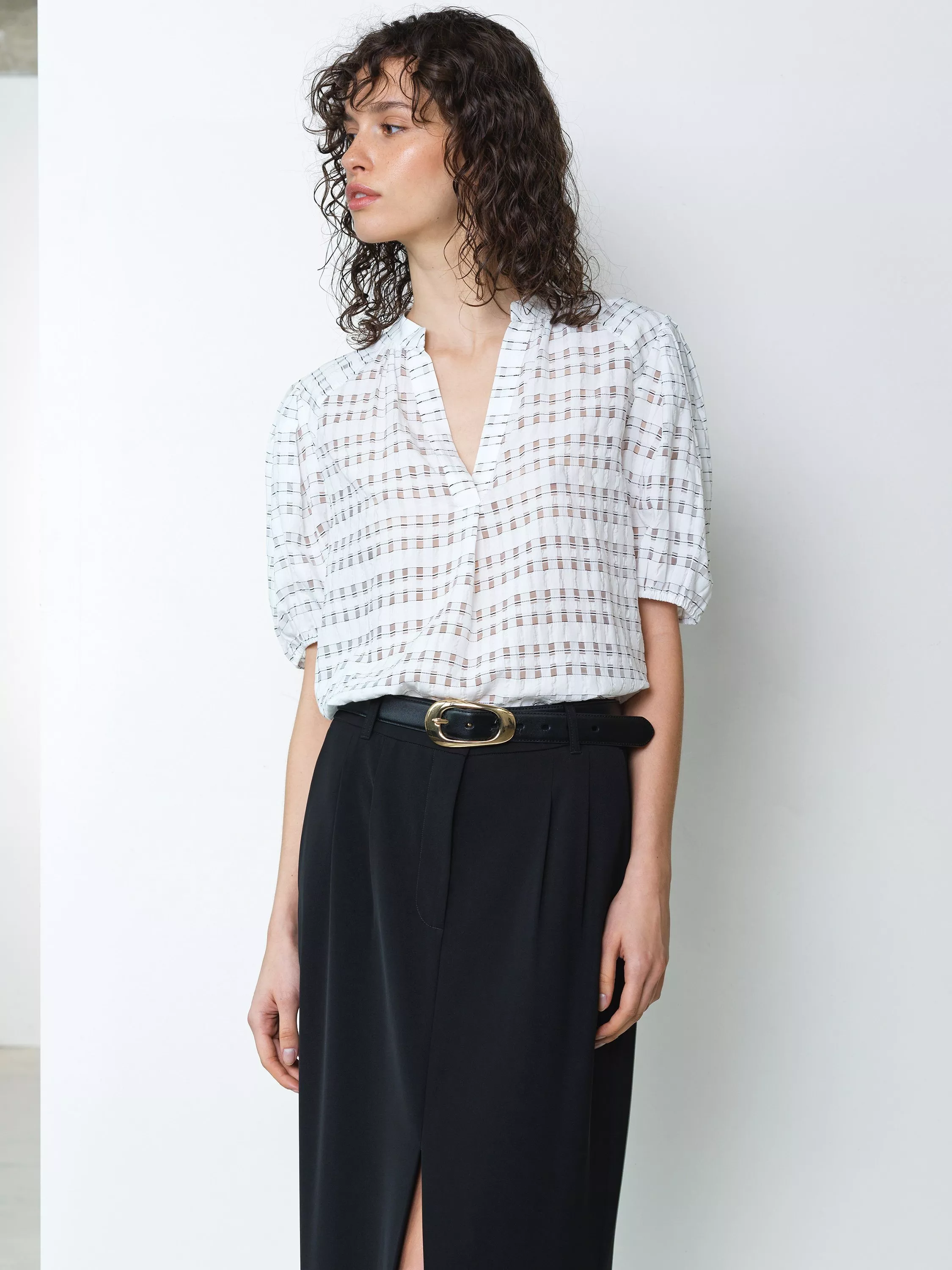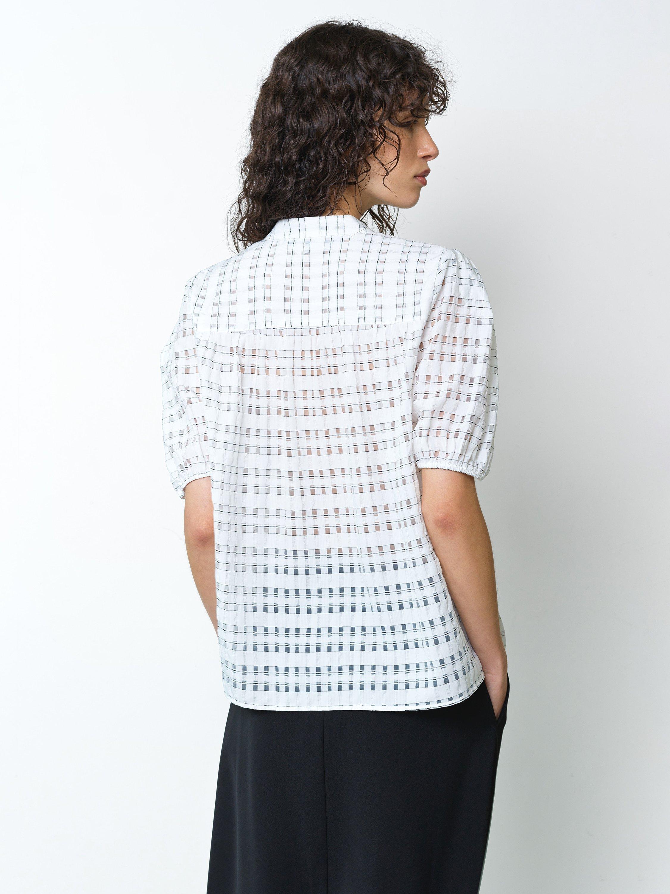 Contemporary chic. The Imme Shadow Check Popover Shirt is designed with semi-sheer checks across a relaxed silhouette, featuring short puff sleeves and a soft band collar with split v-neckline.