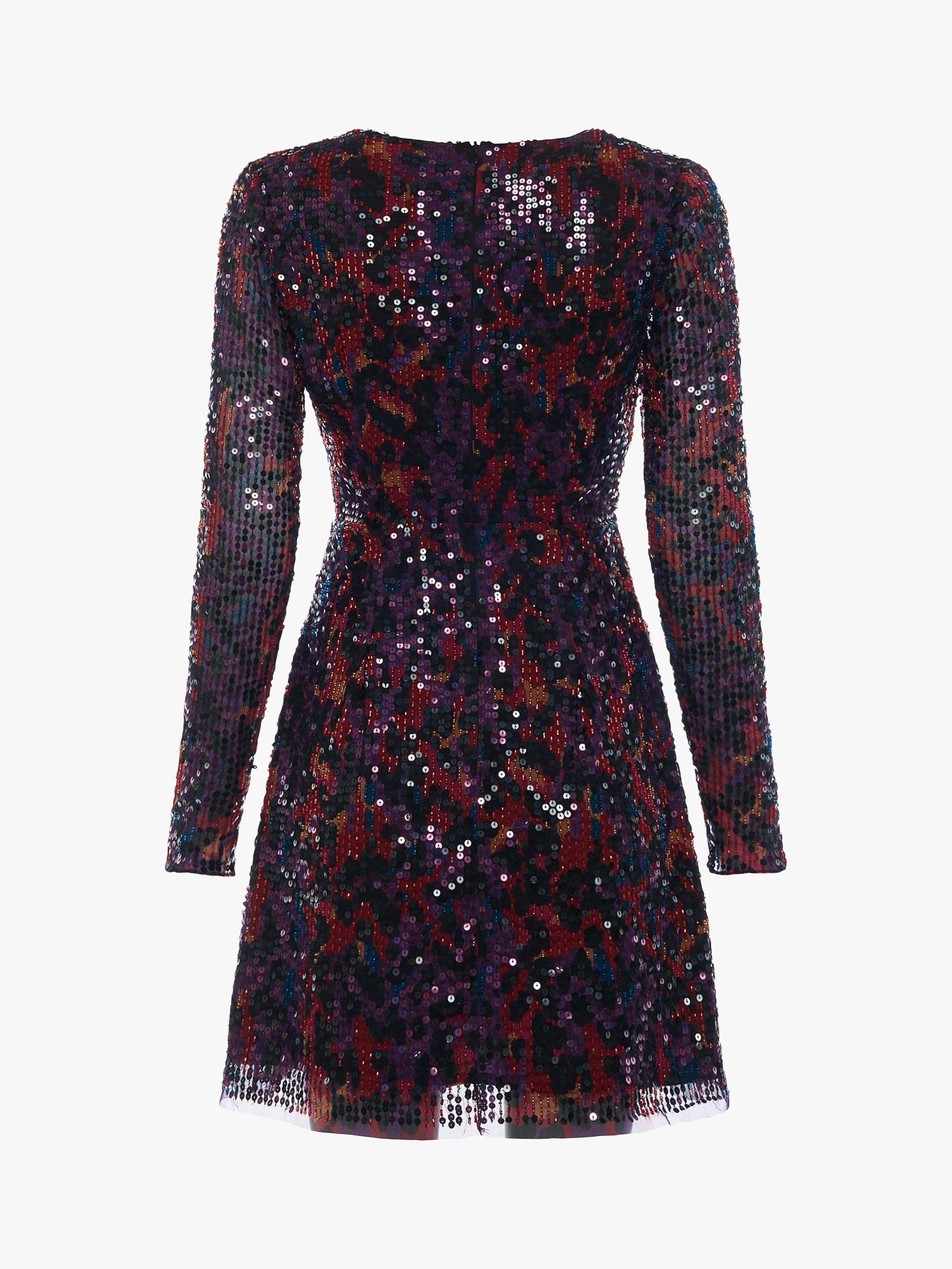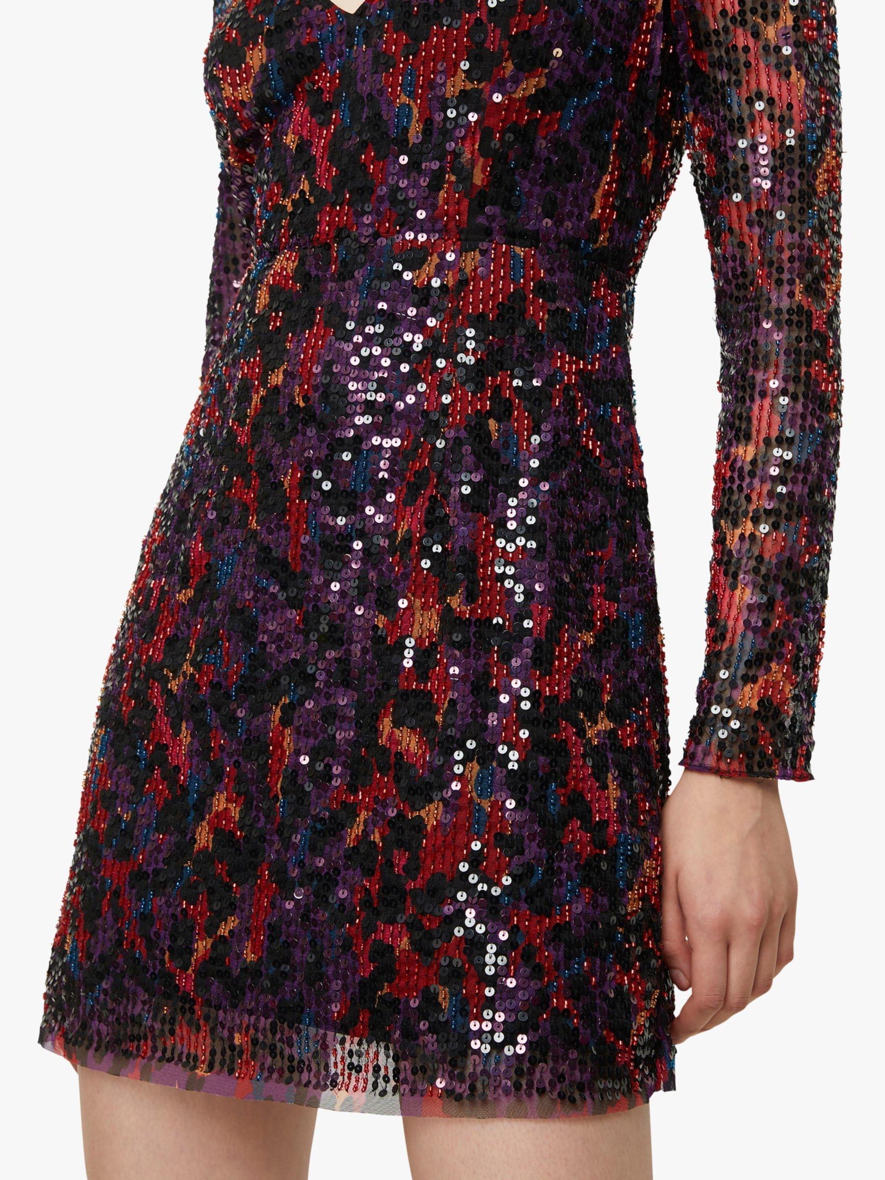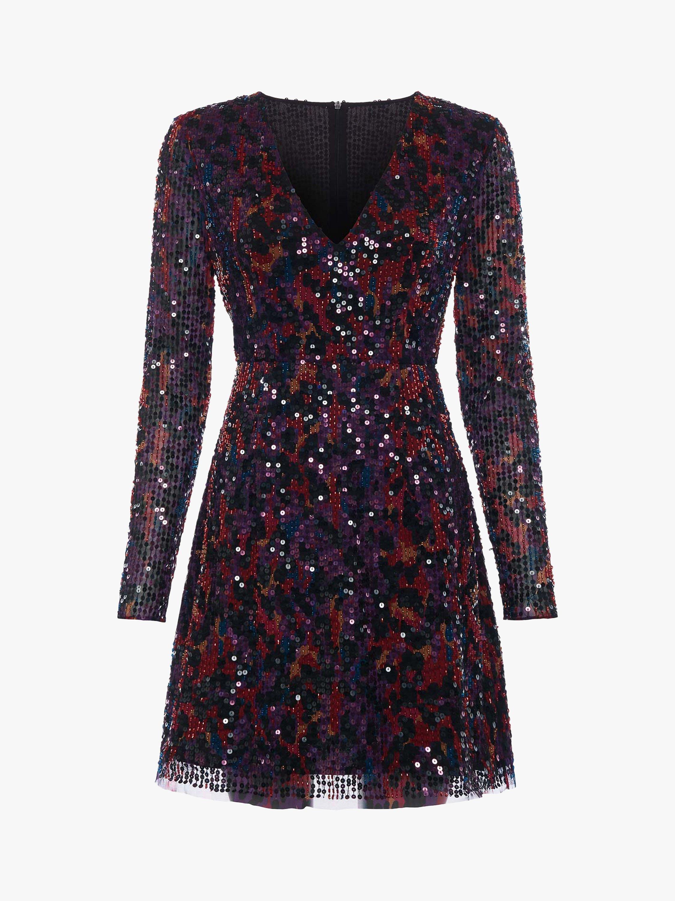 Shimmery animal print in deep, rich colours make it so easy to make a statement at your next party in this Inari dress from French Connection. It's designed with long mesh sleeves for an edgy note, in a playfully mini, V-neck cut that skims the hips and flares out into a flattering A-line shape. Wear it with barely-there heels and minimal jewllery to keep the focus on those sequins.