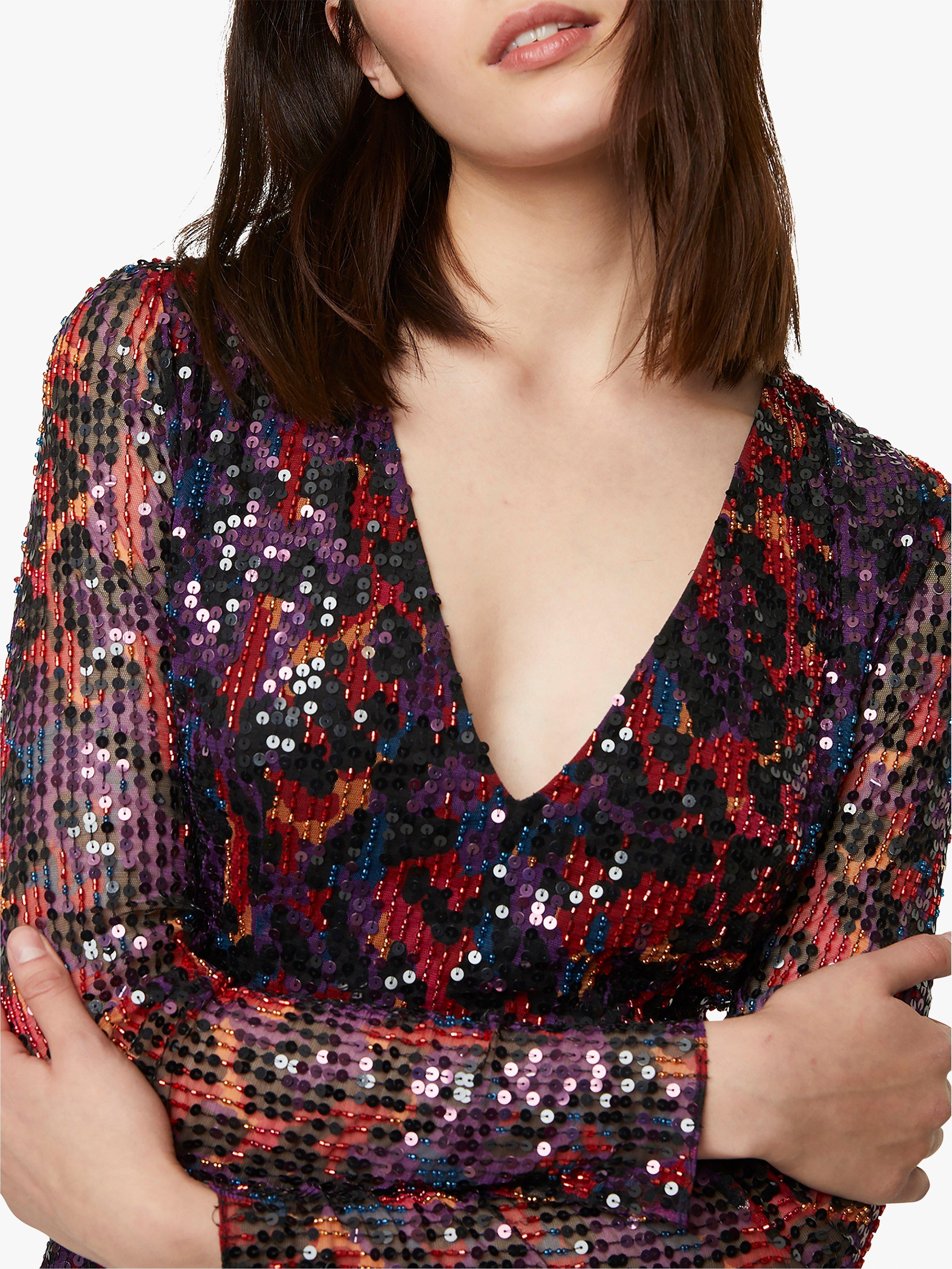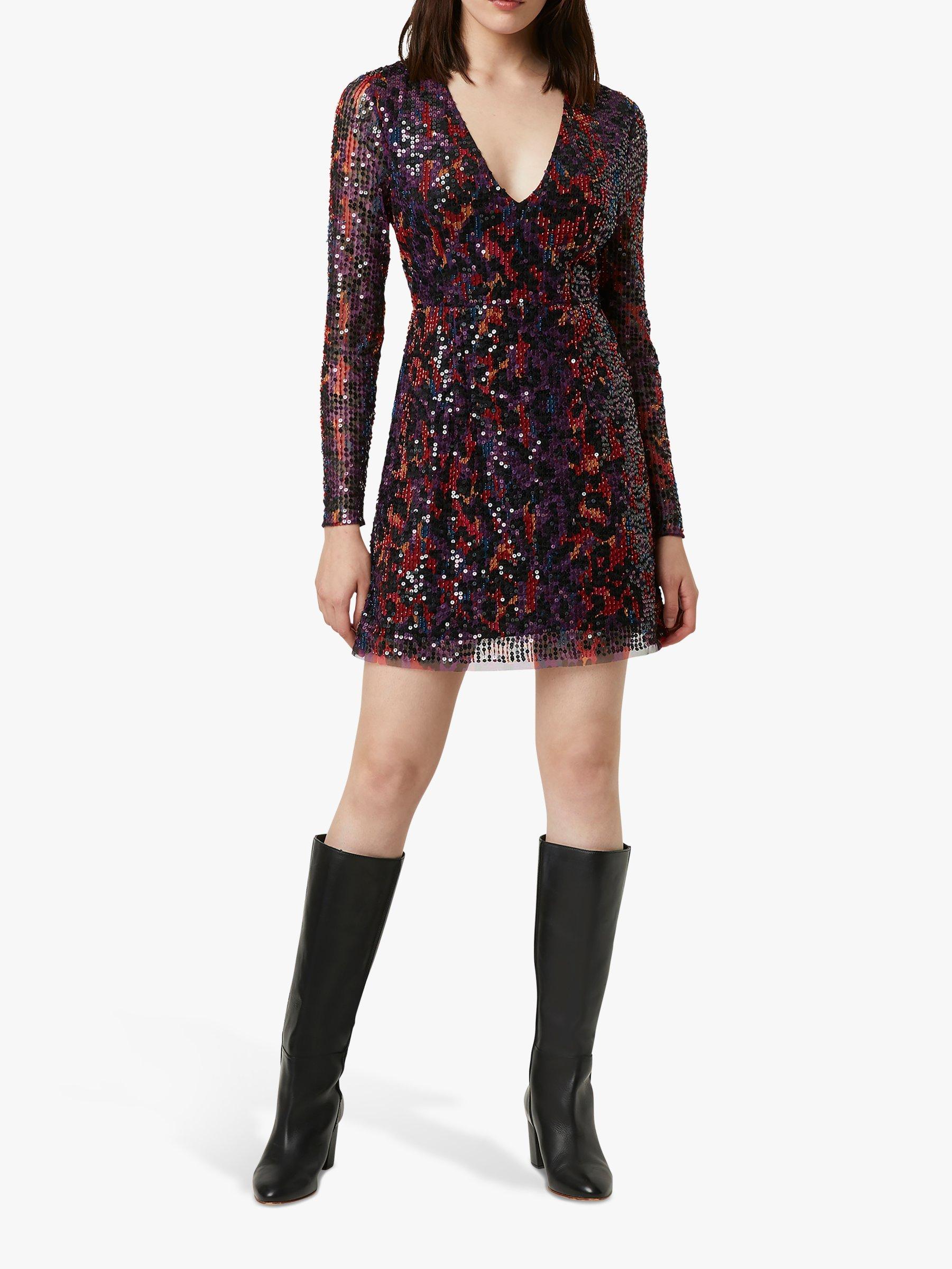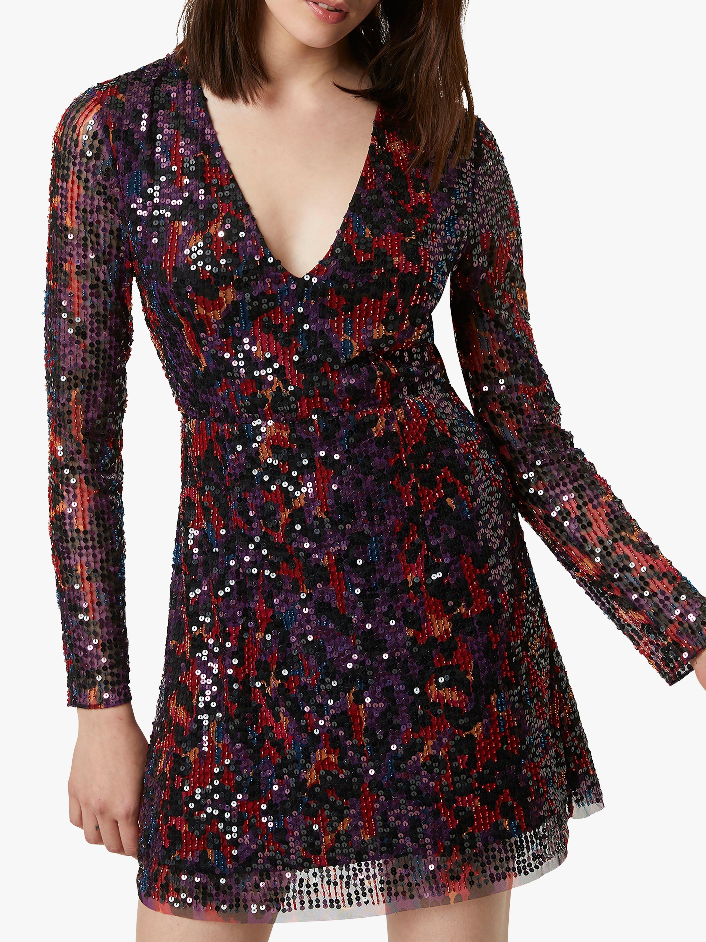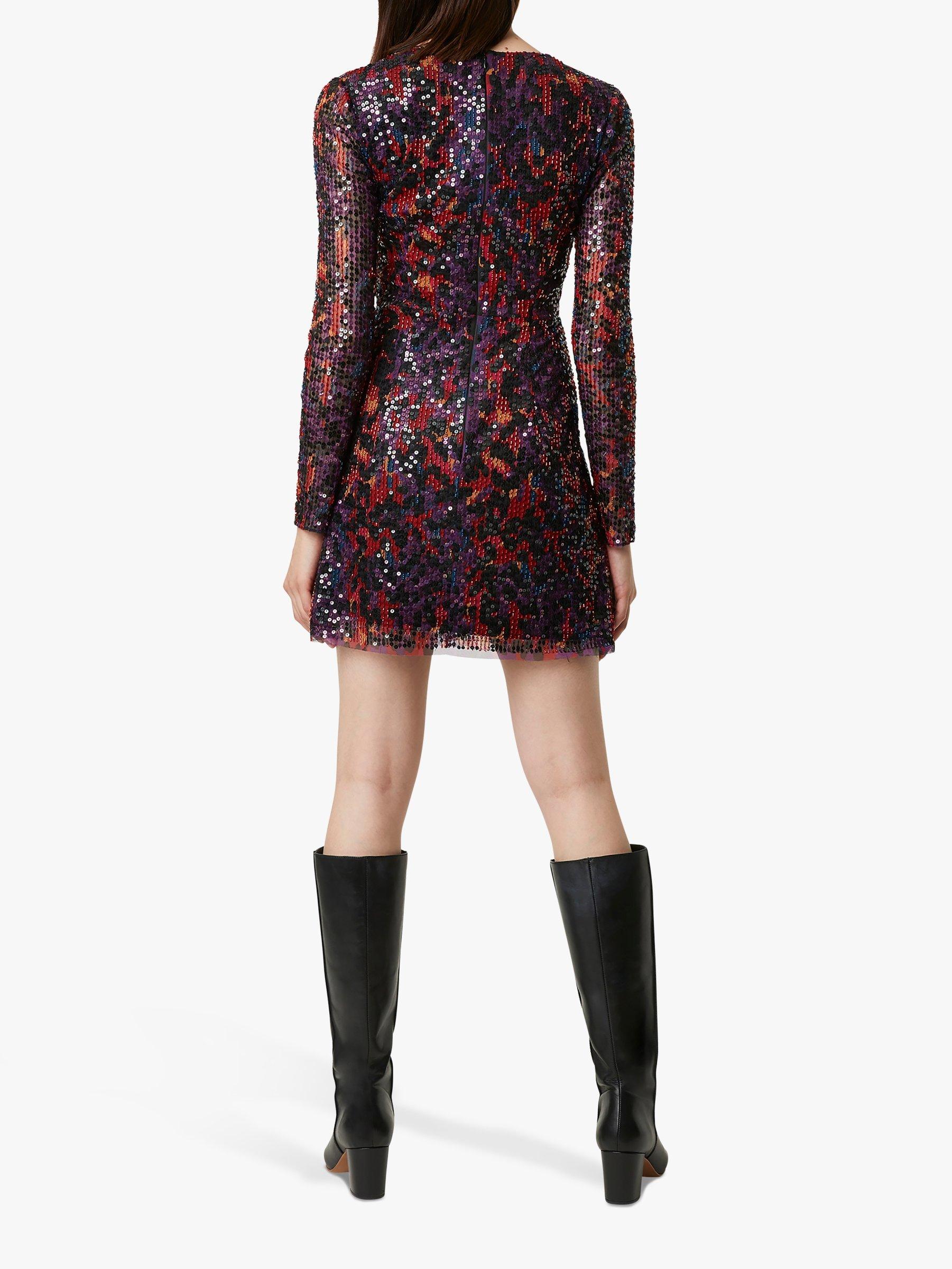 Shimmery animal print in deep, rich colours make it so easy to make a statement at your next party in this Inari dress from French Connection. It's designed with long mesh sleeves for an edgy note, in a playfully mini, V-neck cut that skims the hips and flares out into a flattering A-line shape. Wear it with barely-there heels and minimal jewllery to keep the focus on those sequins.