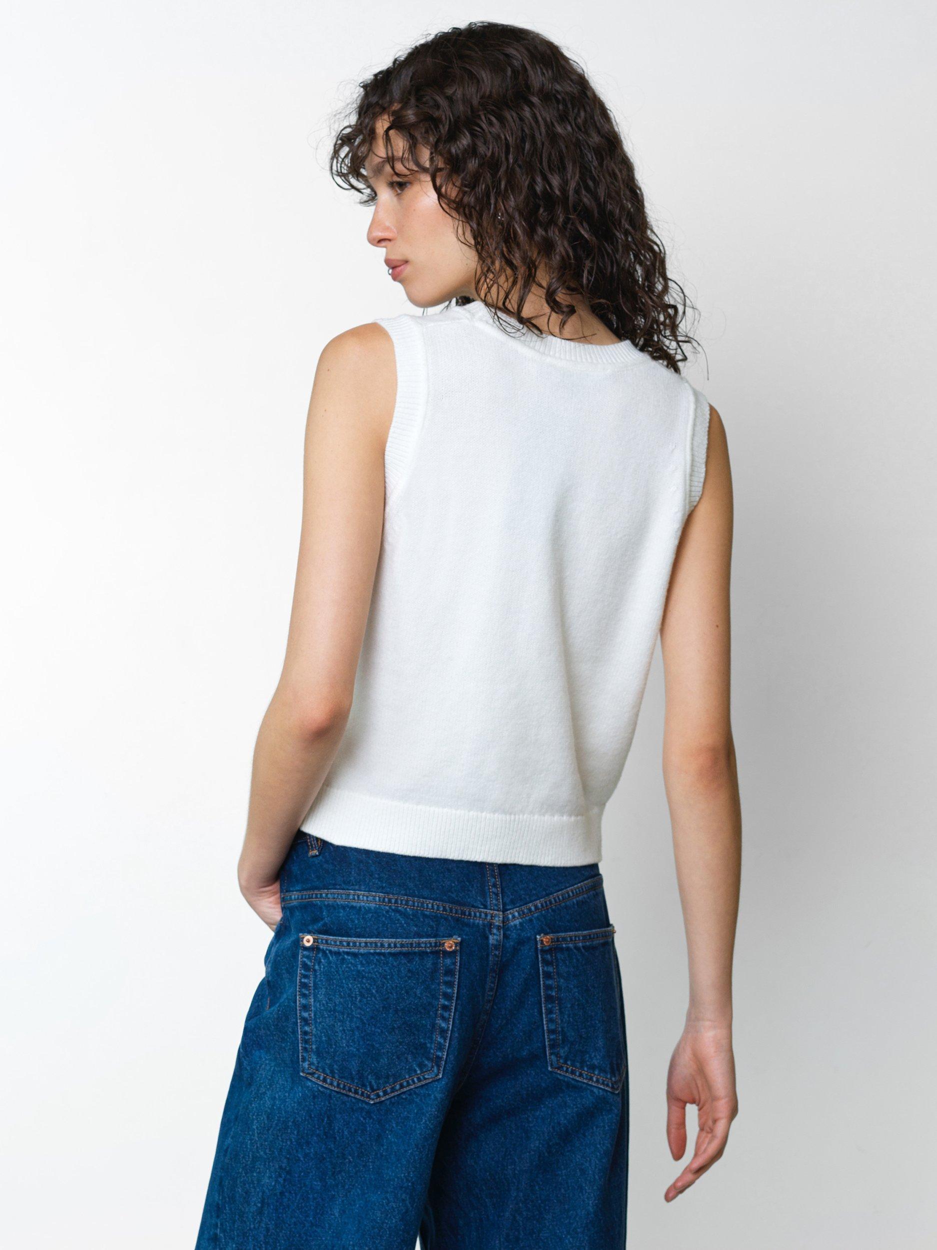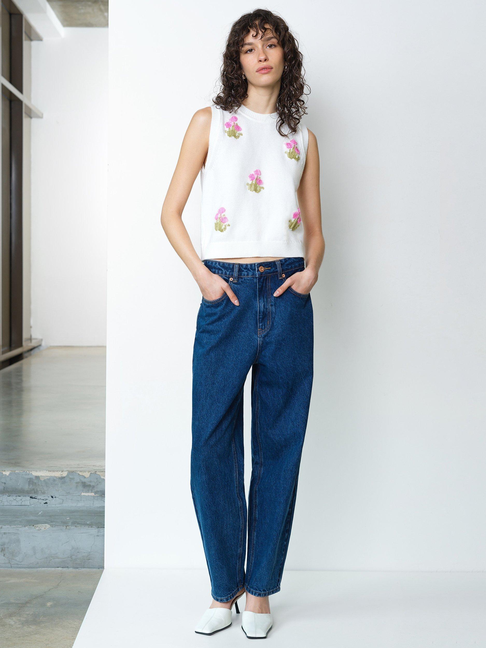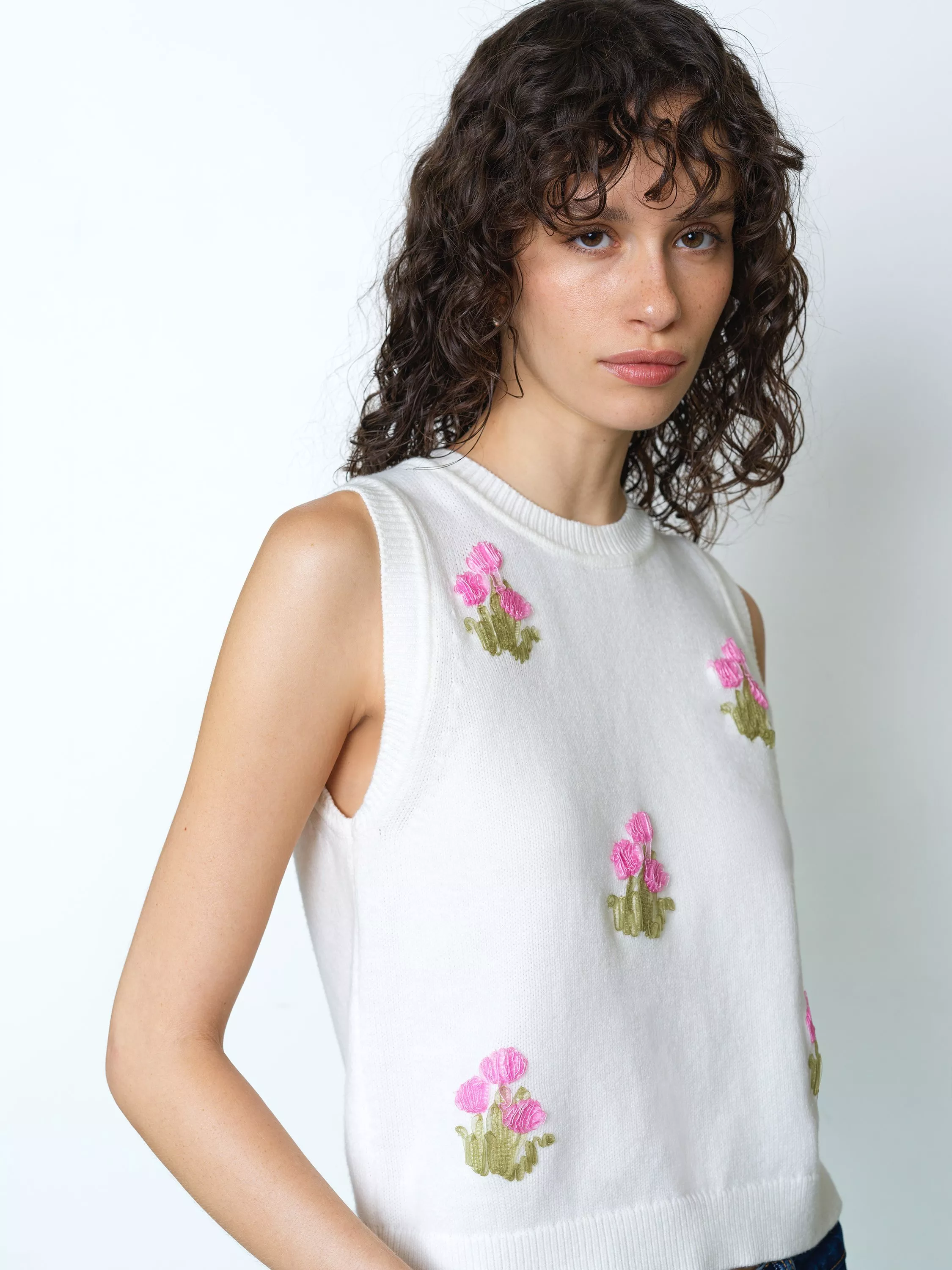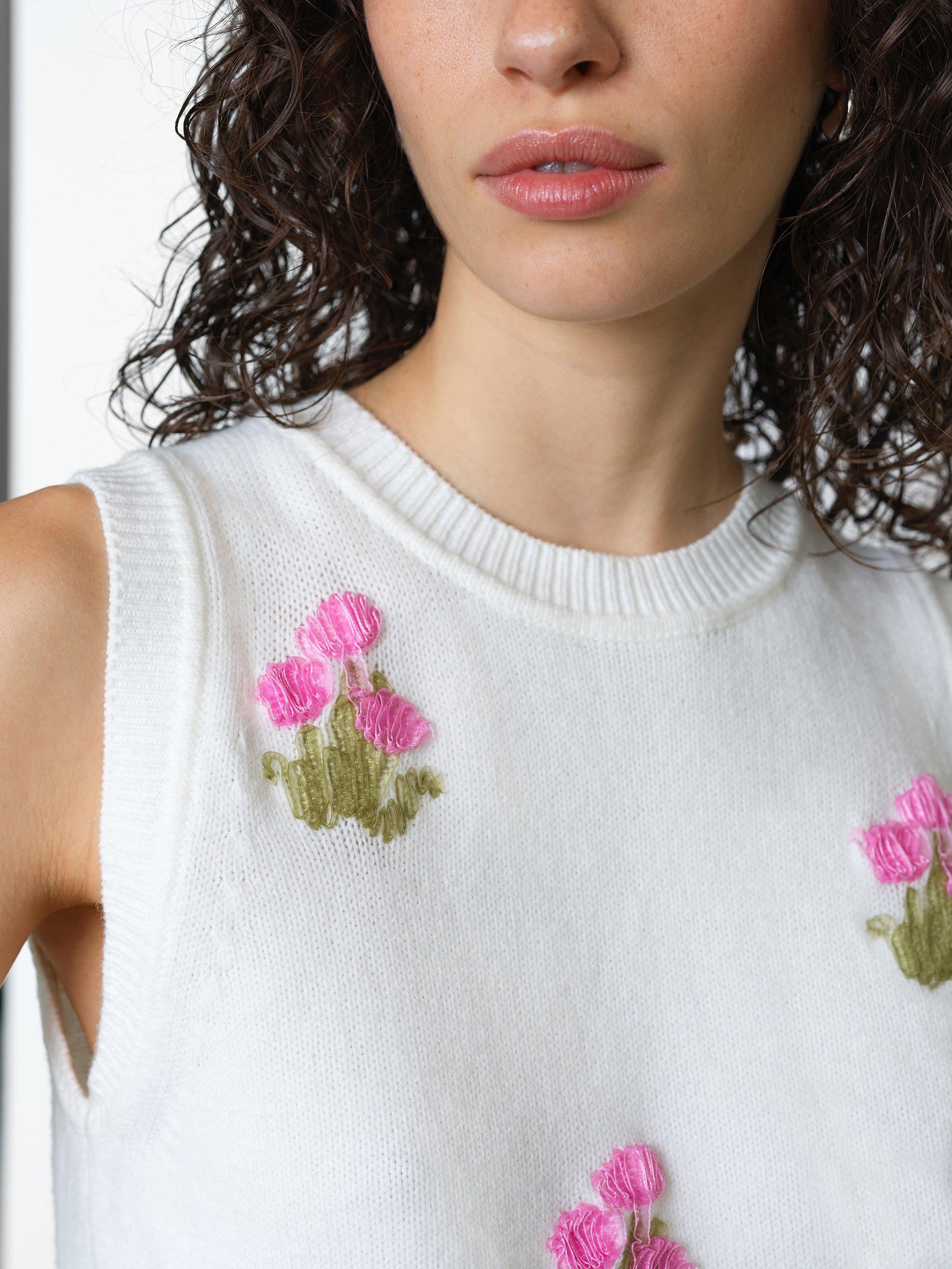 Say it with flowers. The Junie Floral Applique Knit Vest blends its soft knit texture with delicate applique blooms to create a playful yet polished knitwear essential.