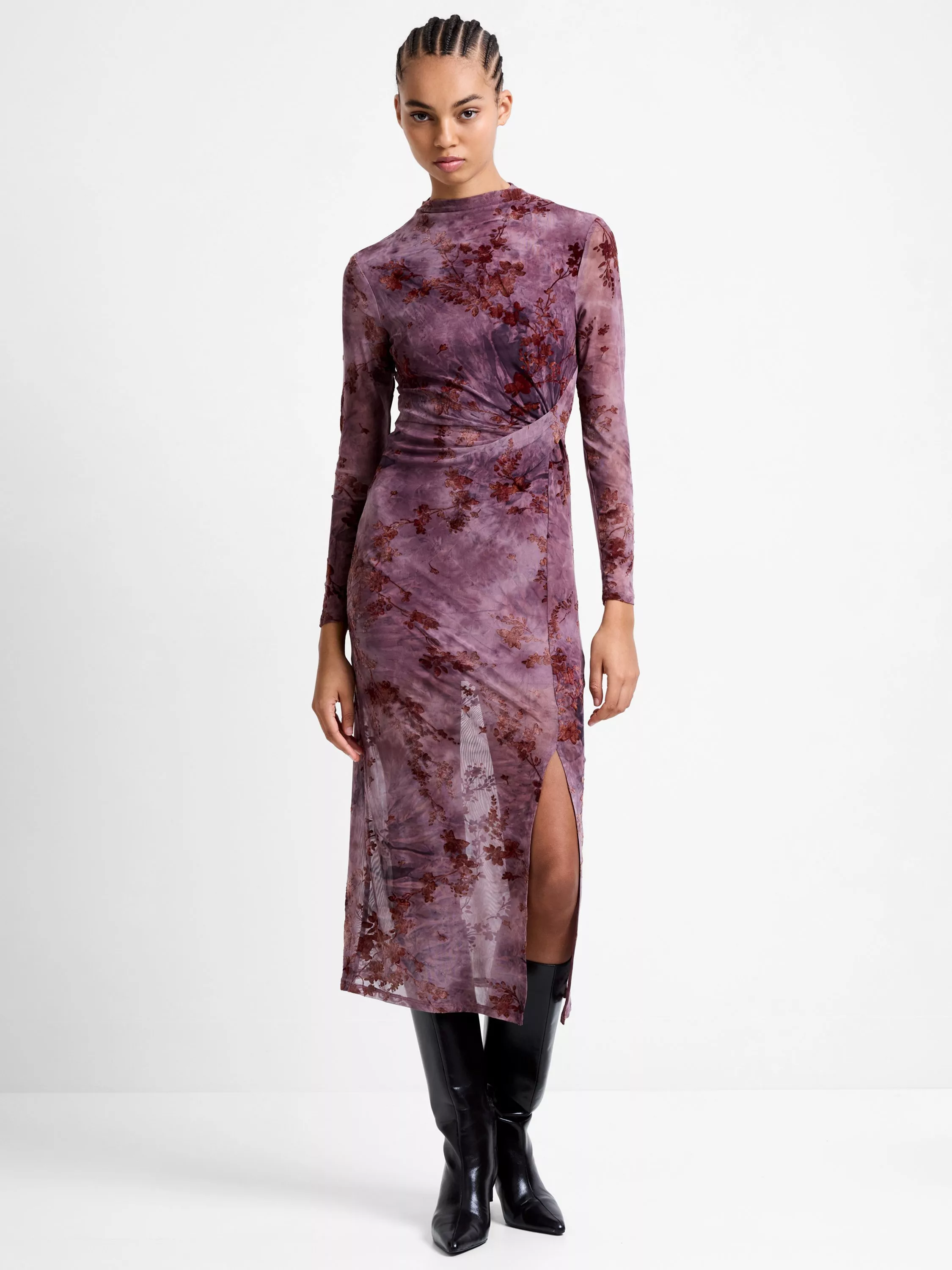 Florals just got a sultry upgrade. The Kenny Devore Mesh Long Sleeve Dress pairs a sheer overlay and velvety devore flowers with a gathered side detail and subtle slit for added allure.