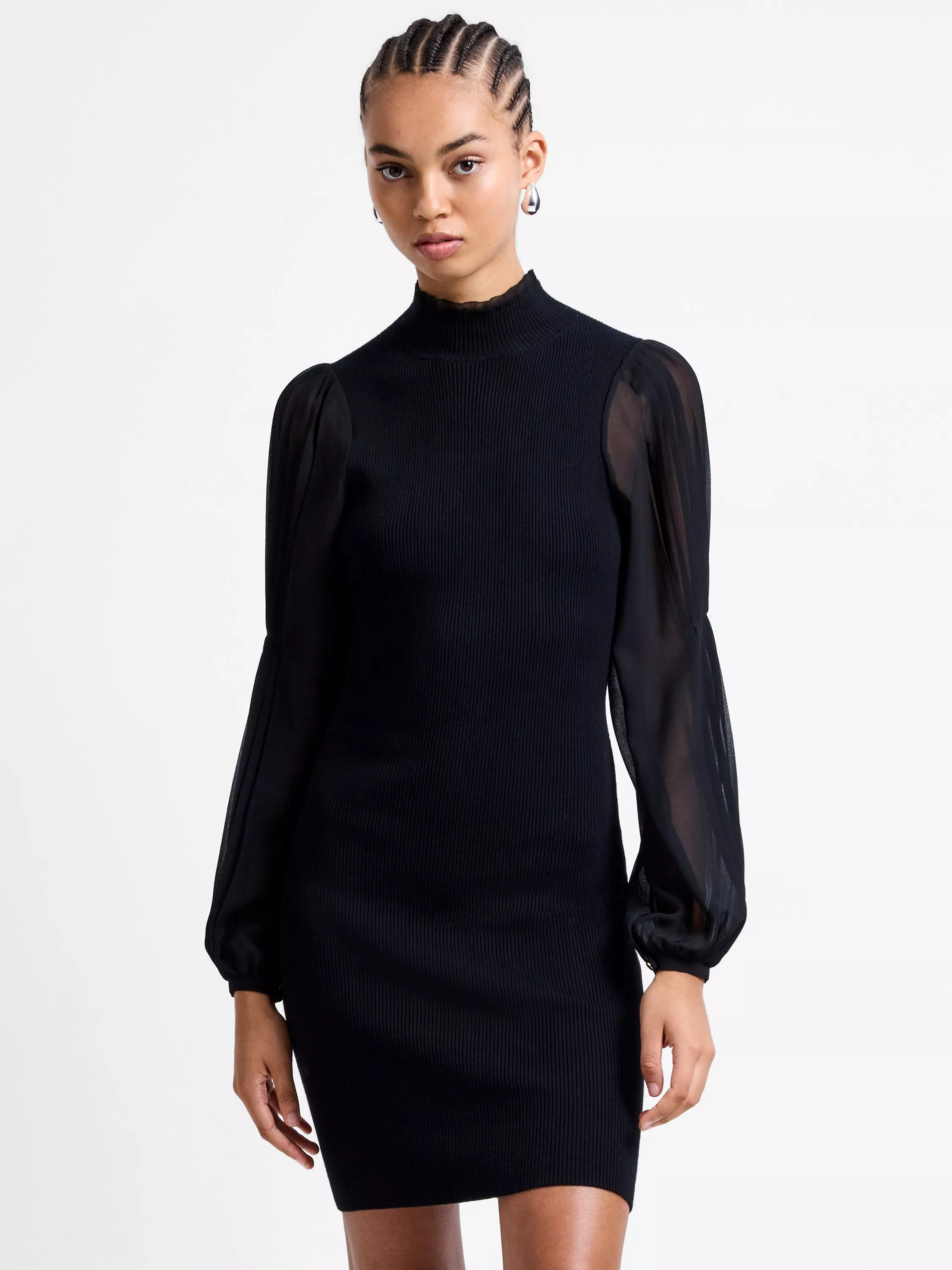 The Krista Mix Long Sleeve Knitted Mini Dress features a high neckline and sheer voluminous sleeves, for the perfect fitted blend of elegance and edge.