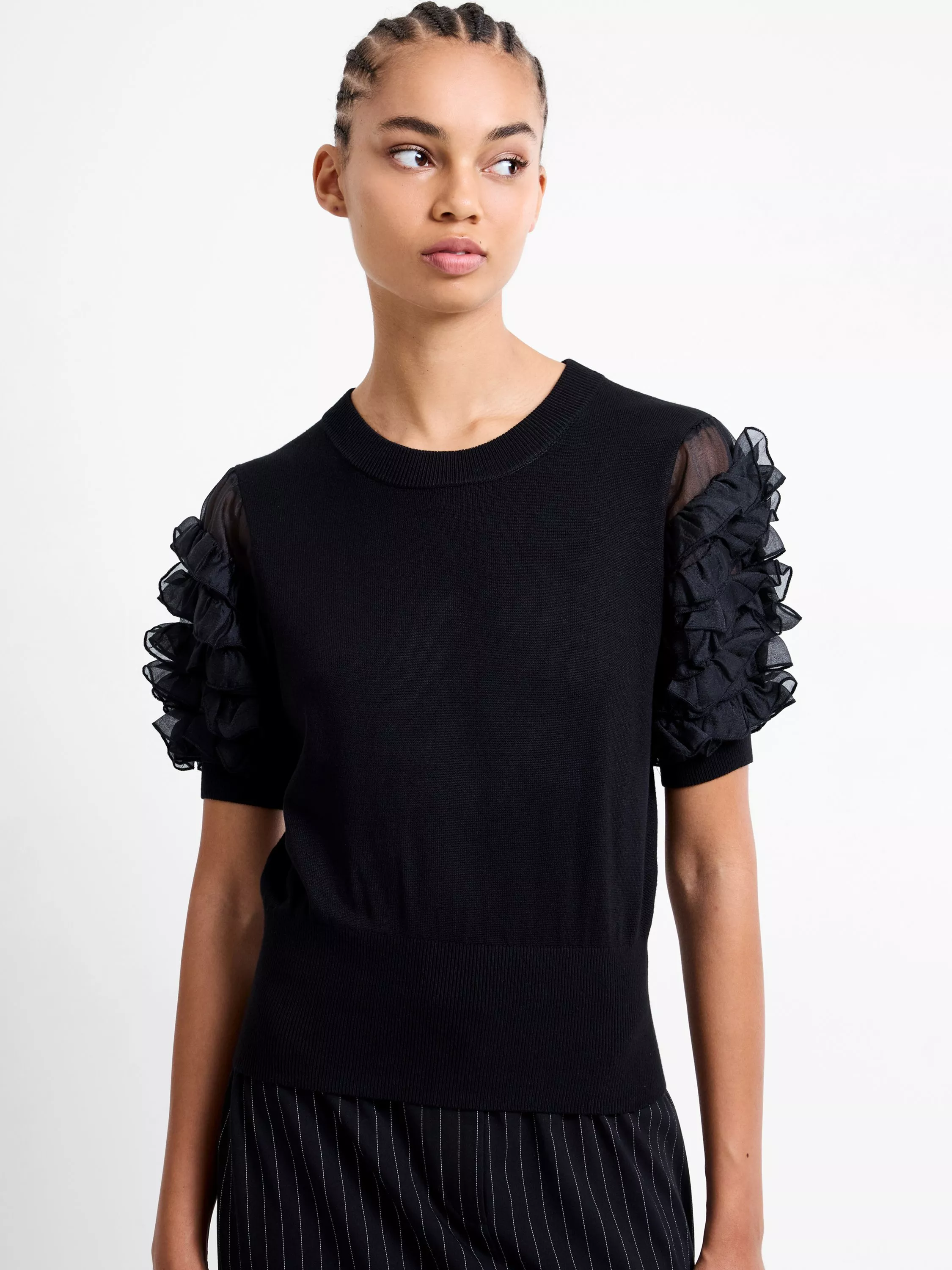 The Krista Knit Stacked Ruffle Sleeves Top features stacked ruffle sleeves against a sleek knit body with a fitted ribbed hem.