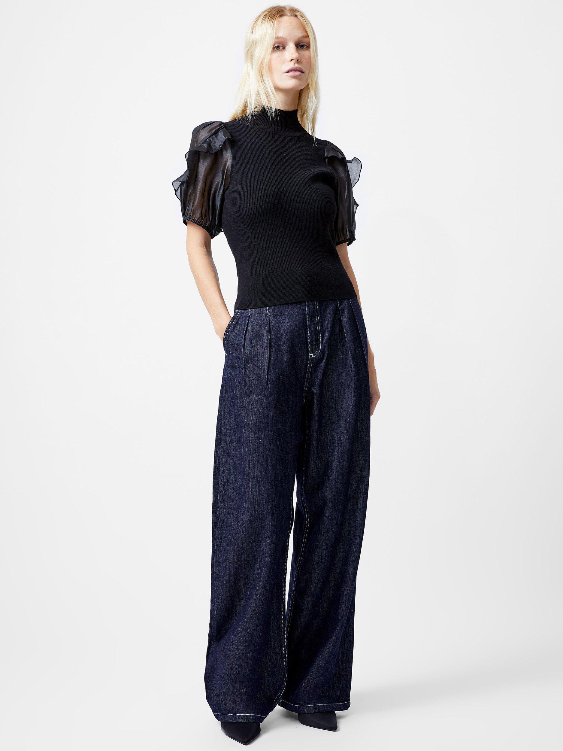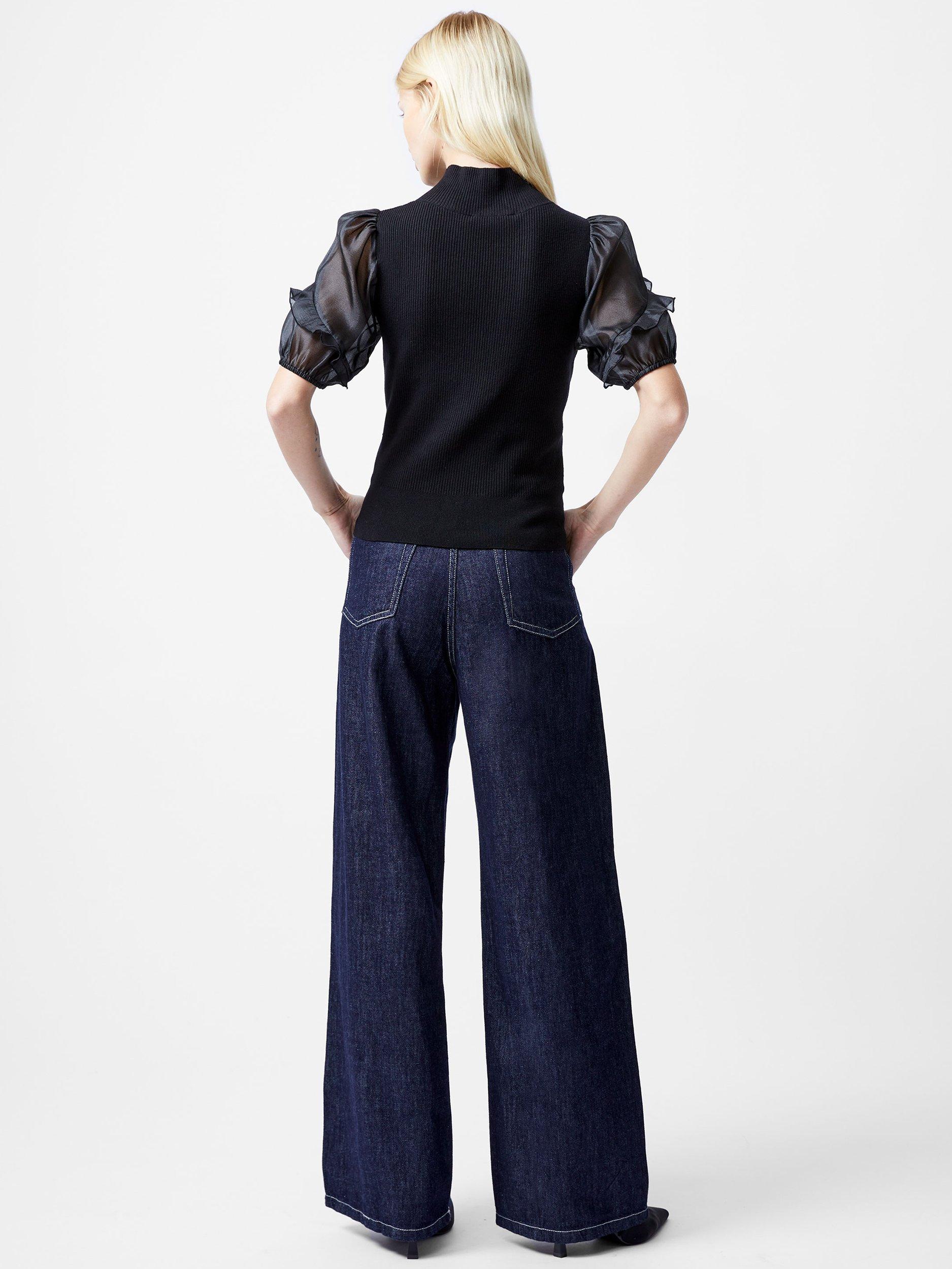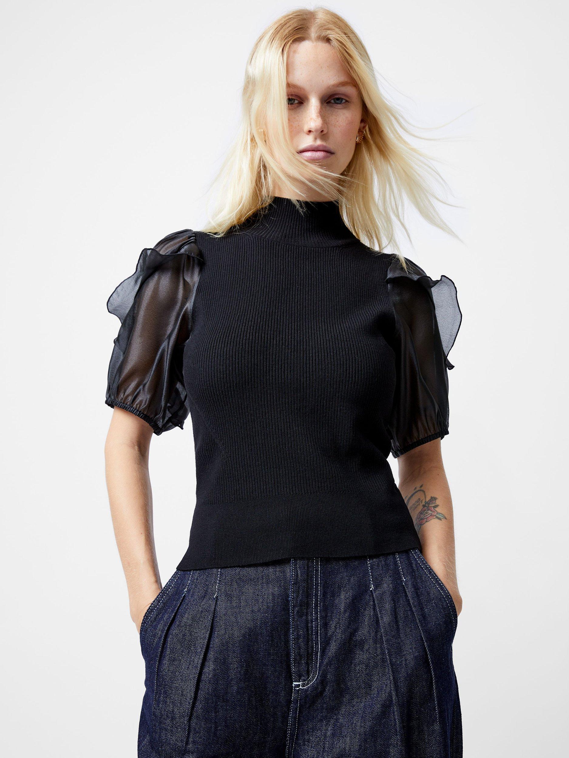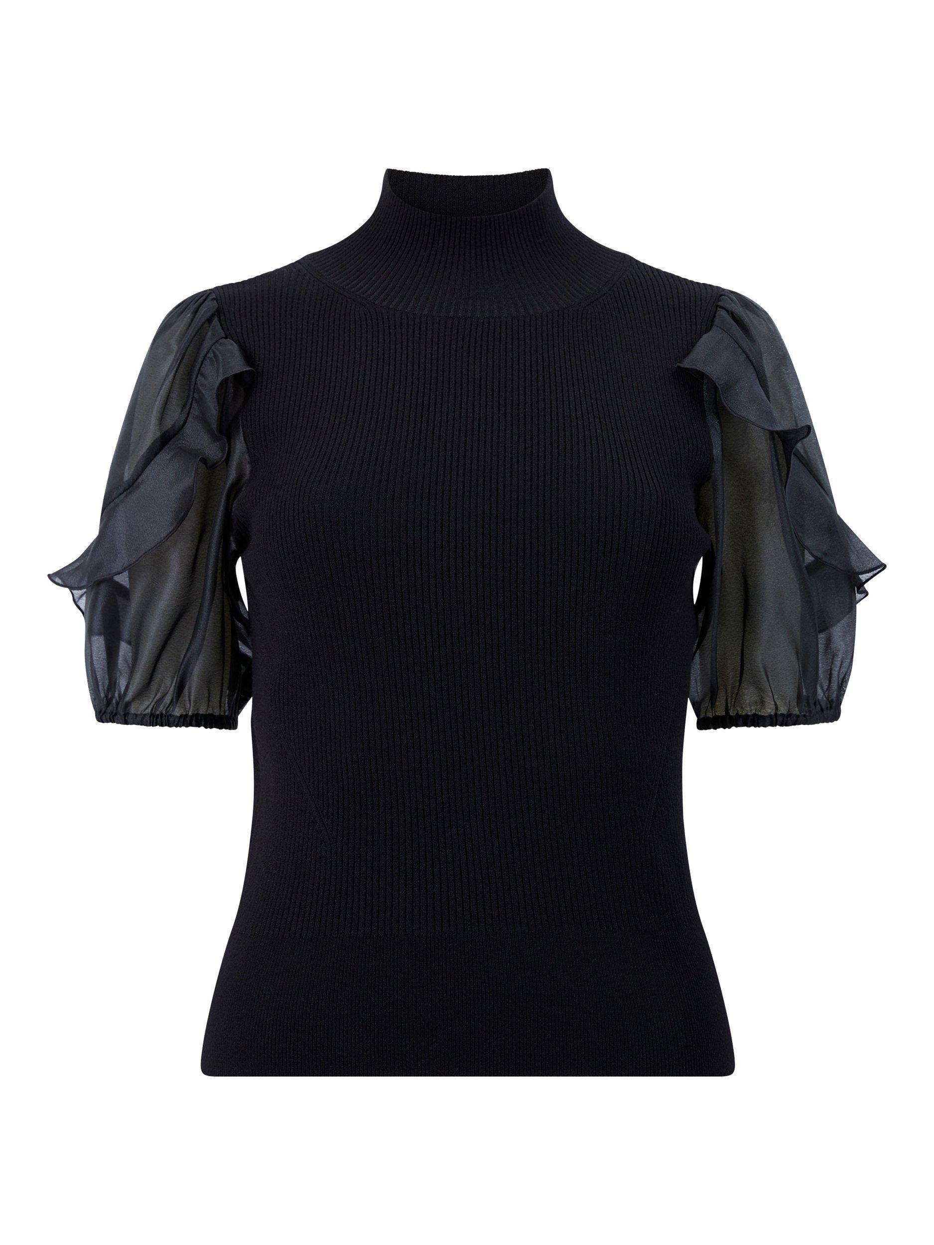 Add some feminine elegance to your tops collection with the Kristine Organza Short Sleeve Top. This soft knit top brings a ribbed textured body to life with a modish high neckline and sophisticated short organza puff sleeves with romantic frill detailing.