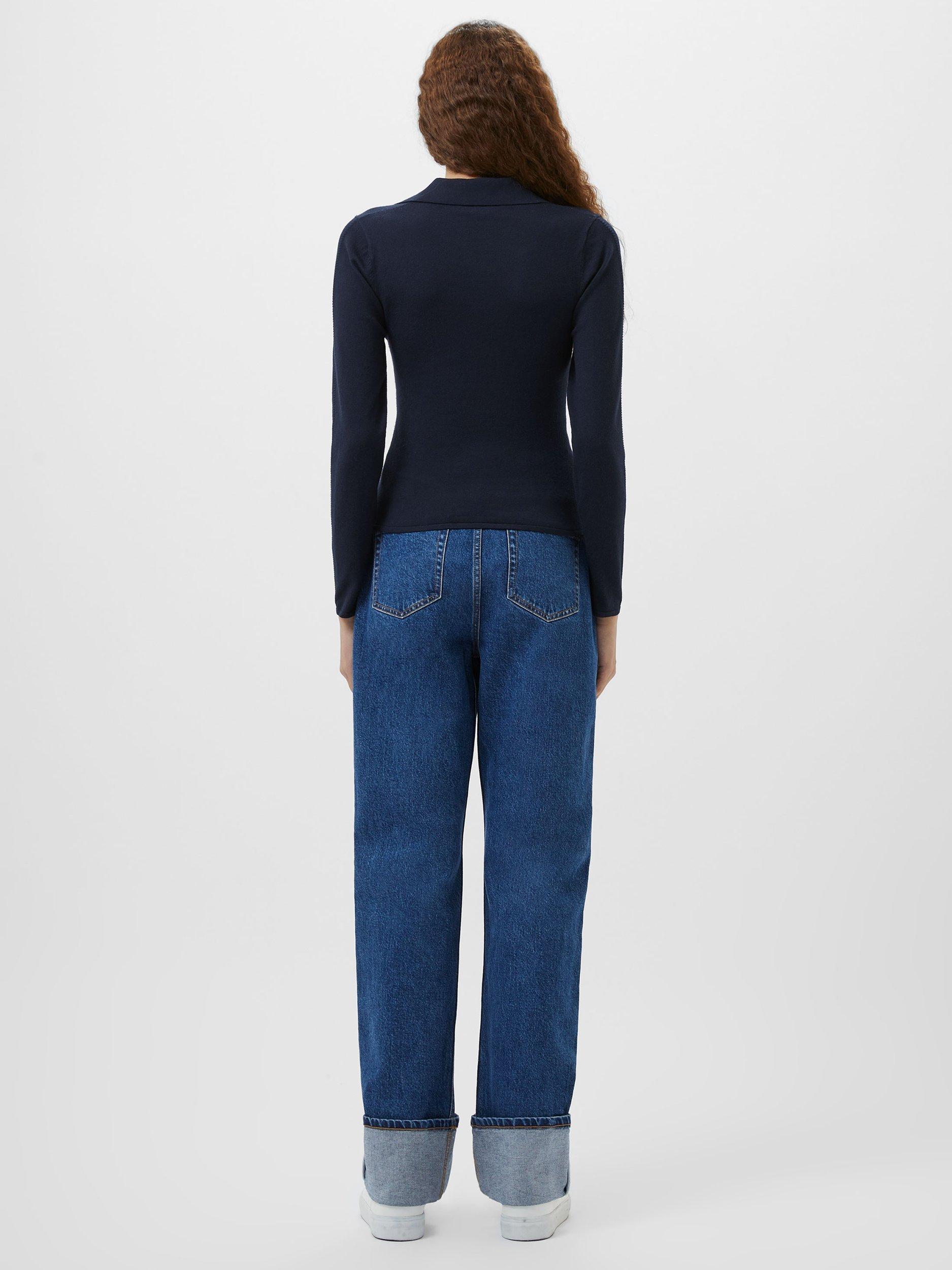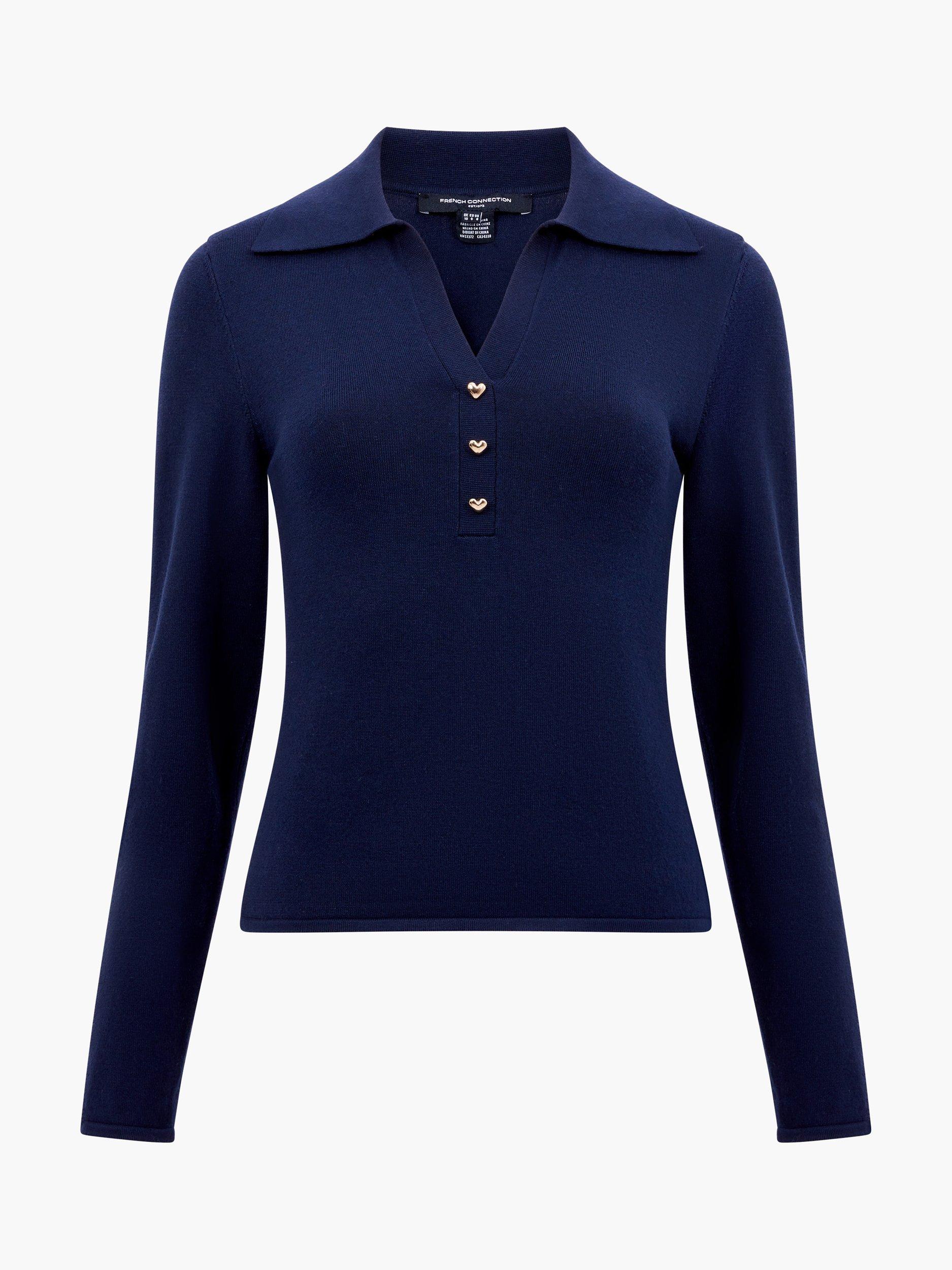 Your wardrobe will love this new addition. Our Larry V Neck Polo Top elevates soft and smart styling by partnering its long sleeved silhouette and collar with a v neckline and placket adorned by four gold tone heart shaped faux buttons. A sweet staple style.