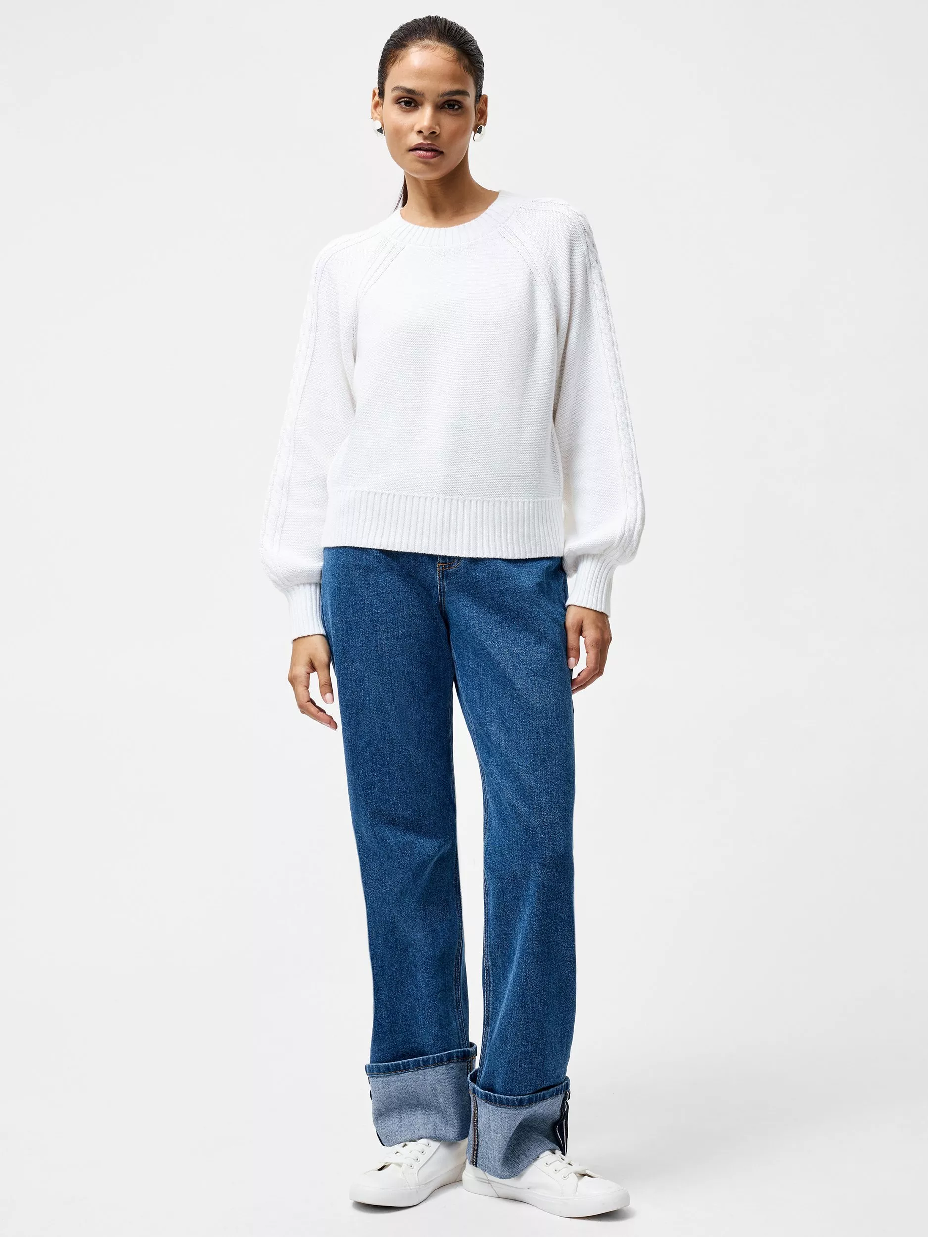 Knitwear just got even sweeter. Our soft knit Lily Cable Sleeve Jumper features cute cable stitch detailing down its two long sleeves whilst ribbing elevates its crew neckline and hem. This jumper can be styled solo or layered with a top or collared shirt.