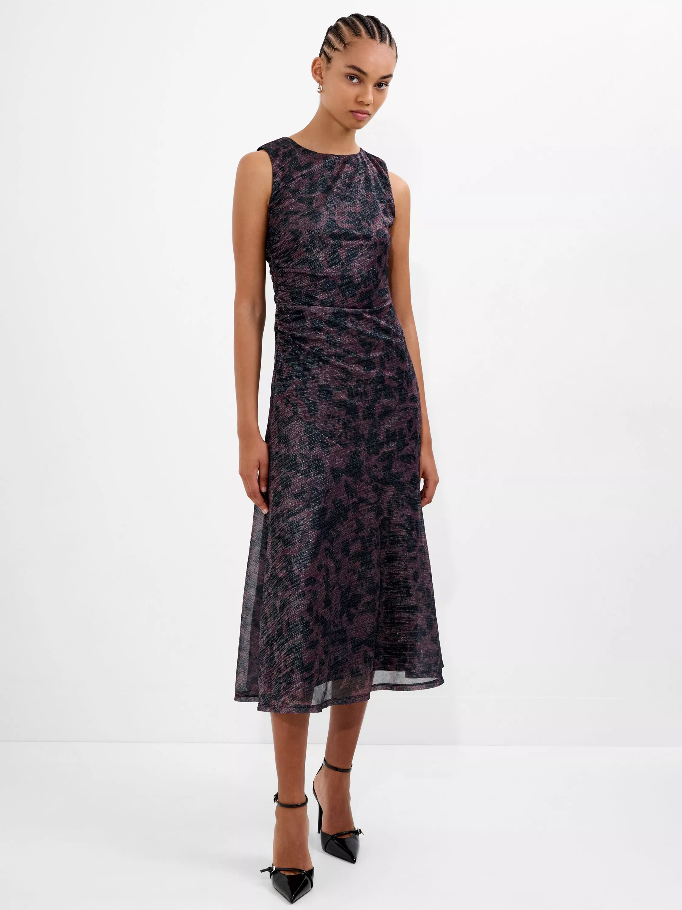 The Lorrie Lurex Round Neck Midi Dress is all that shimmers. This sleeveless midi dress features a metallic infused print, with flattering waist ruching and a softly flared hem for added movement.